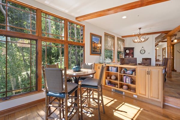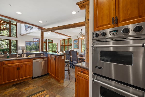 This contemporary western-style townhome is conveniently located within a short walk to the Mountain Village core, placing guests near all of the area's best dining and shopping options as well as the Gondola. Its incredible position right on the popular Meadows ski run also ensures guests the ability to experience true ski-in/ski-out access. This home boasts massive floor-to-ceiling windows that offer spectacular views of the ski area and the San Sophia Mountains, and the great room houses both the living area and the kitchen space. The living area is built for entertainment, and it comes with a flat-screen television with a DVD player and an excellent sound system. It also provides access to a lovely private deck with comfortable seating and a nice gas grill. A full gourmet kitchen comes with everything needed to prepare excellent meals, and it features high-end stainless steel appliances, a Cuisinart drip coffee maker, custom cabinets and plenty of granite countertops. Guests may be served meals at the small bar table that seats four on barstools or at the lovely dining table that seats six. On the upper level of the home, there are two guest rooms that each come with a king-size bed, a flat screen television (one with a DVD player), an en suite bath with a jetted soaking tub and a separate glass steam shower. The other two guest suites are located on the lowest level of the home; one includes a queen-size bed, flat-screen television and an en suite bath with a glass shower and a jetted tub. The final guest room is a bunk suite with four single beds, a flat-screen television and an en suite bath with a glass shower. This level also offers a large laundry room with a washer and a dryer. TMV BL# 005042