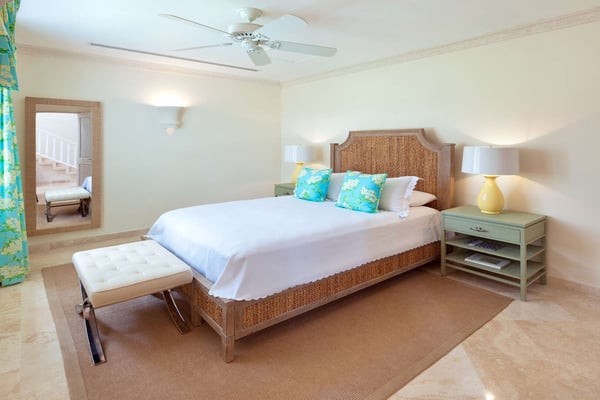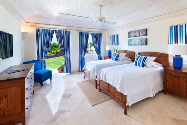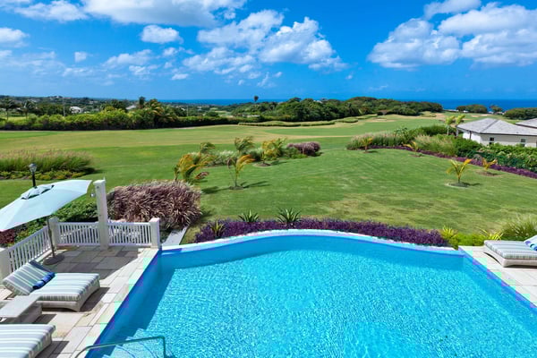 Royal Westmoreland is one of the Caribbean's finest luxury golf communities. With the Social Membership included in this villa, guests will have access to the gym ($), golf course ($), tennis courts ($), Club House ($), beach facilities at Mullins Beach Club ($), resort communal pool ($). This impressive 4-bedroom villa strategically sits on a ridge, offering breathtaking views of the West Coast shoreline of Barbados. The villa overlooks a Robert Trent Jones Jr. designed golf course, creating a picturesque setting. The entrance leads to tasteful interiors in the main living area, opening to a spacious patio with an infinity-edge swimming pool. Additional seating areas provide comfort and televisions. A dedicated office space with complimentary wifi is available for work needs. The Italian-designed kitchen with marble countertops and modern appliances is a chef’s delight. Casual dining is offered in the kitchen's breakfast area, while formal dining takes place on the poolside patio, perfect for alfresco dining in a tropical ambiance. The upper level features two lavish master suites with access to an expansive balcony, ideal for enjoying morning coffee or sundowners with golf views. Two guest suites on the ground floor, one with direct pool area access, ensure relaxation with lounge chairs and umbrellas.
