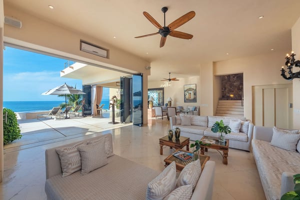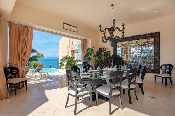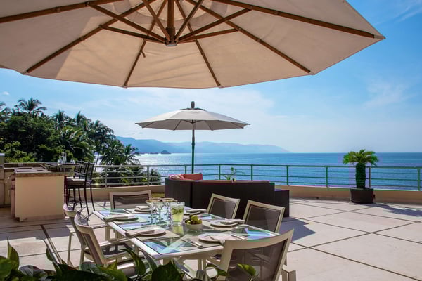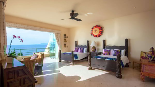 The Villa Bahia experience is luxury details and privacy, located oceanfront with a professional staff to pamper you, details from gourmet coffee, homemade bread and chocolates and when it's time to sleep dreamy bed linens. The villa is located oceanfront in Conchas Chinas only a short drive (3 miles) to the Romantic Zone and popular Los Muertos Beach with breathtaking views of the sparkling Pacific Ocean and across the Bay of Banderas. The villa itself is an experience from one-of-a-kind architectural details including soaring 12-foot ceilings, spacious bedrooms, with breathtaking ocean views from every room. The villa rents as four or five bedrooms perfect for couples, multi-generational family groups and corporate retreats. The villa is designed with simple contemporary lines, juxtaposed with rustic details such as a hand-carved boat, natural brick boveda ceilings and splashes of colorful art. The villa includes full attentive staff, WIFI and premium bedding. There is a man-made stone terrace at ocean level, accessible by steps made into the rocky coast. The staff will assist to set up w drinks and cushions. The tides and currents do not usually allow for swimming from the ocean terrace.