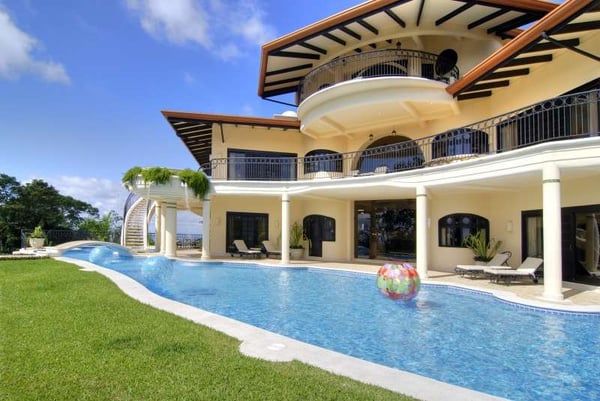 Villa Avalon, located on the central Pacific Coast of Costa Rica is a fantastic destination for any families (including pets) or large groups, looking to explore and get the most out of their trip to this gorgeous country. The house is an hour and a half drive from the San Jose Airport and is located in a secure gated community within Punta Leona. The house has seven bedroom suits sleeping up to 18 people and a full-time maid, cook and concierge service to make your stay as comfortable as possible. The house includes a 40 metre swimming pool with a 33 metre swimming lane and outdoor gym/weights area, with a large Jacuzzi on the above balcony. Adjacent to the kitchen is a breakfast nook and an external barbecue area. There is also a large lounge space with a full-size pool table, board games, an enclosed bar and plenty of relaxation space, with wireless internet access and a telephone. The villa takes advantage of an incredible panoramic view of the ocean and forested mountains, with sunset views all year round. Due to its 100-metre elevation above sea level, the villa experiences wonderful refreshing sea breezes most afternoons. In the mornings you can expect to wake up to a troop of monkeys or a couple of Scarlet Macaws that like to feed on the many fruit trees surrounding the villa; you can even spot the occasional school of whales swimming in the Gulf of Nicoya below! Within a matter of minutes from the house you can find yourself at Playa Blanca, a pristine white sand beach. There is also a small pebbly beach a ten-minute walk at the rear of the property which is exclusive to the local gated community.