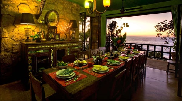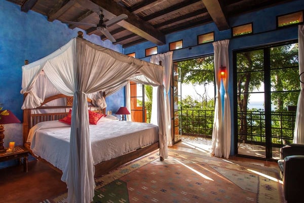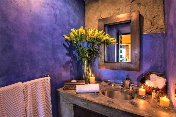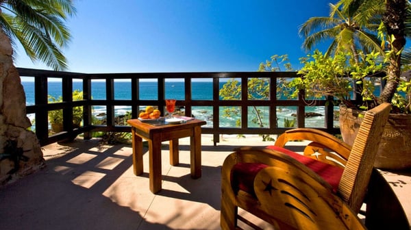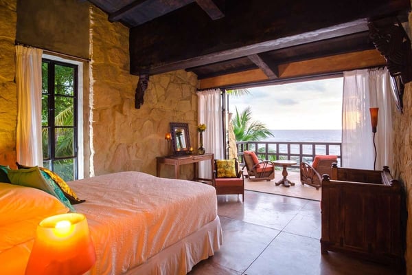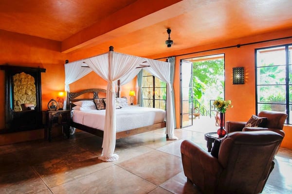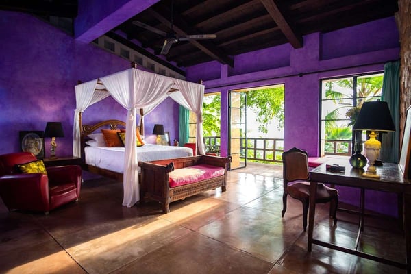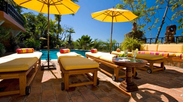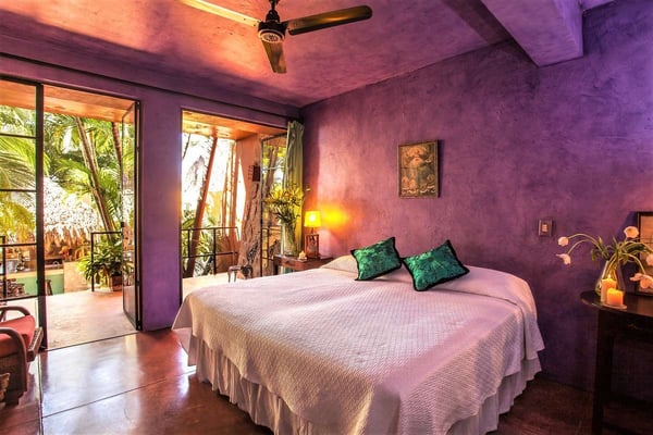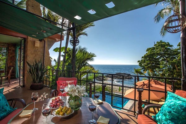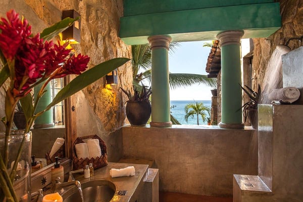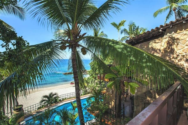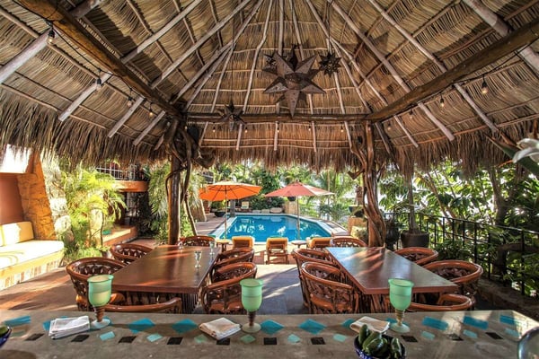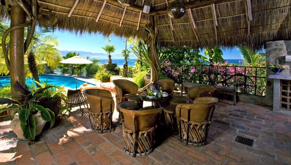 Now with nine bedrooms, Casa Septiembre is our favorite beach house in Puerto Vallarta. It is one of the few large villas near Old Town that has a wide sandy beach below the pool. The ambiance is ultra exotic and relaxed. Lush gardens create a private enclave. The backdrop of white sand, swaying palm trees and aquamarine waters has been described by guests as 'a Hollywood set'. When you find the strength to pry yourself away from this idyllic setting, the popular tourist districts in town are less than five minutes in a taxi or 15 minute hike along the spectacular Conchas Chinas coastline. Casa Septiembre has an artsy, bohemian atmosphere: polished concrete floors, collectors items, vintage photographs and Moroccan antiques are fused with industrial design details. There is a distinctive Art Deco element in the architecture but with organic nuances like flowing muslin curtains, a thatched roof bar and meandering garden paths leading to private, romantic bedrooms. Turkish rugs, religious artifacts, period pieces and imported furnishings add character and style. The fabulous pool and beach are the best features of this property. Located on one of the prettiest beaches on the Bay of Banderas, the tropical style pool cabana is the perfect setting for entertaining, featuring outdoor living area, bar and grill.
