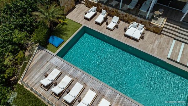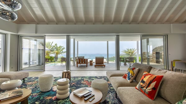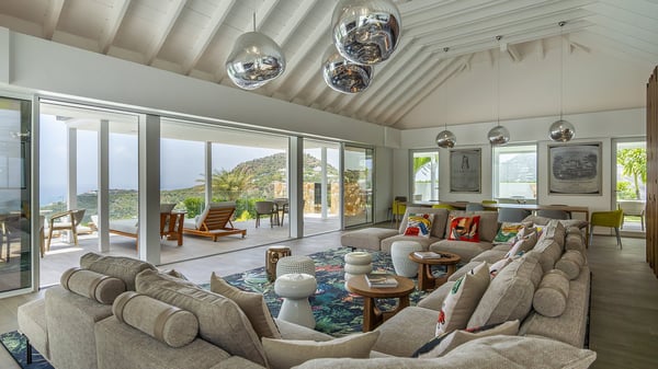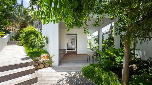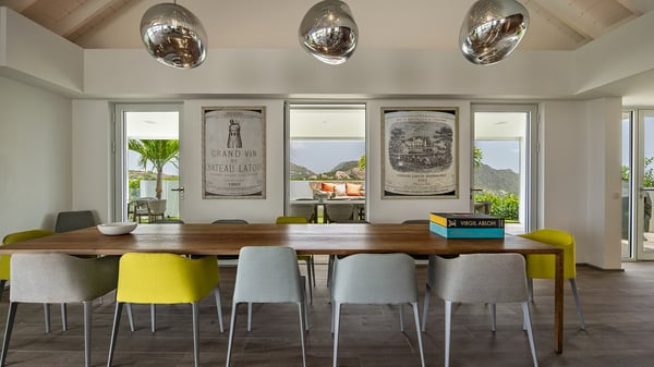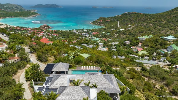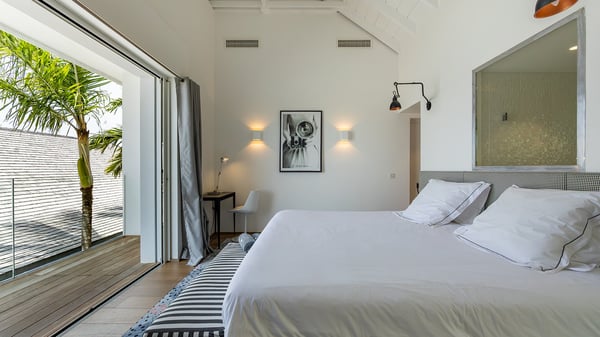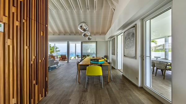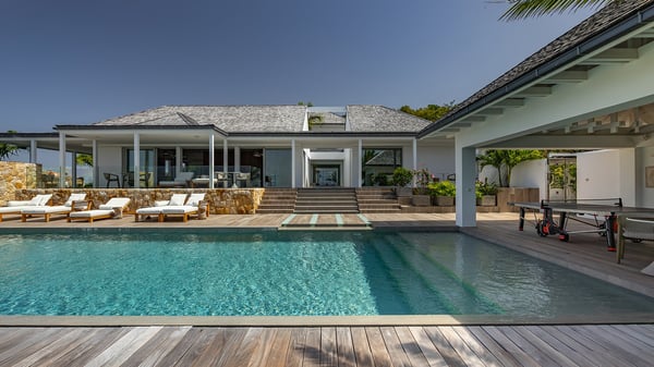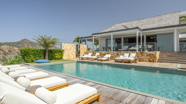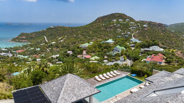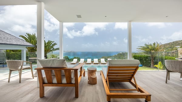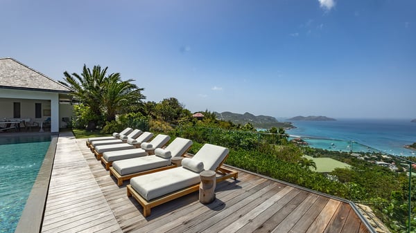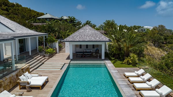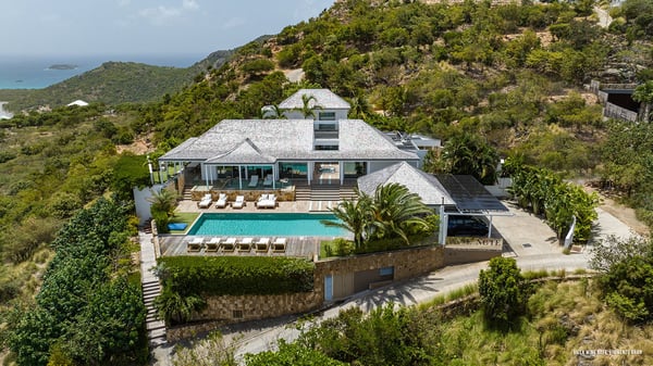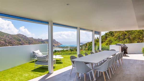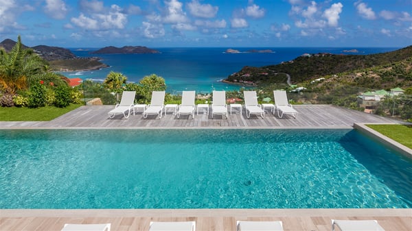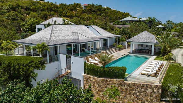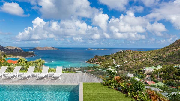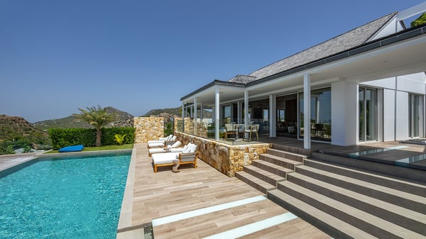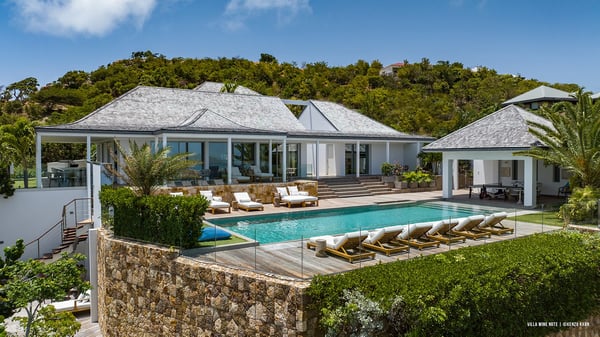 Located on the heights of St. Jean, vacation rental Wine Note is one of the most luxurious villas in St. Barths. With high-end amenities and a sleek decor, this five-bedroom vacation home is the perfect choice for a heavenly stay with family or friends in the Caribbean. Only a few steps away from St. Jean Beach, villa Wine Note is a contemporary property with an airy design reminding fine wine and famous chateaus. As soon as you enter, you'll marvel at the sumptuous glass cellar located near the professional kitchen, perfect for private chef services. The living room widely opens onto the terrace with breathtaking ocean views and features a chic indoor dining room that can accommodate up to fourteen guests. Under the vaulted ceiling, the large windows bring in a truly shining light, in a gray and yellow décor with hints of wood. At the front of the house, the terrace is facing a breathtaking view over the ocean and the bay of St-Jean. An outdoor living room is set up under the covered area, and a second dining room is set up on the side of the house for dining alfresco, next to an outdoor lounge on the green lawn with a panoramic view over Salines. A few steps down, there is a heated mirror swimming pool in an enchanting setting: lounge chairs, a charming gazebo and a romantic daybed are set up on the deck for reading or talking sessions under the sun. In this idyllic scenery, you’ll marvel at the Caribbean lush vegetation while strolling in the tropical garden. The outstanding villa Wine Note is composed of five air-conditioned rooms with private bathrooms and beautiful ocean views. Three of them are in the main building, including one on the lower level, while the other two are located in a separate pavilion for utmost privacy. The amenities are luxurious in a refined décor with terrace access, among which one with a lovely sparkling pool. An air-conditioned fitness room is also at your disposal during your stay. Between sky and sea, the villa Wine Note is an exclusive property, a perfect place for an unforgettable stay in Saint-Barthelemy.