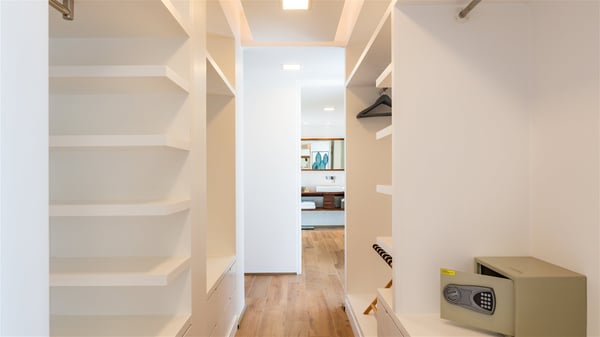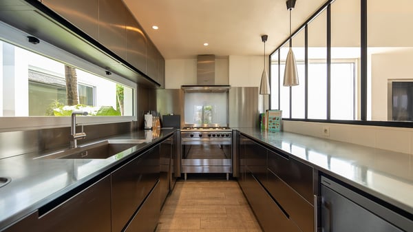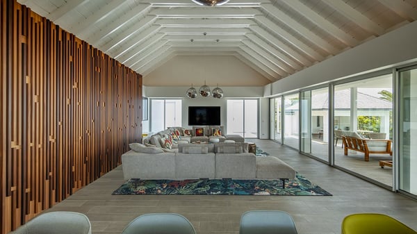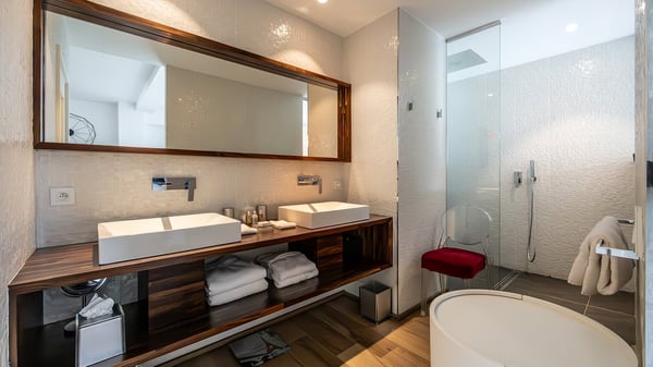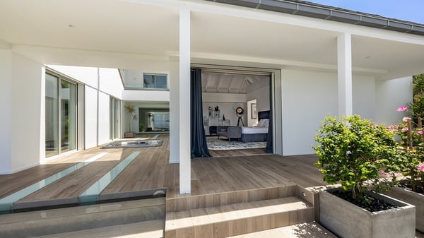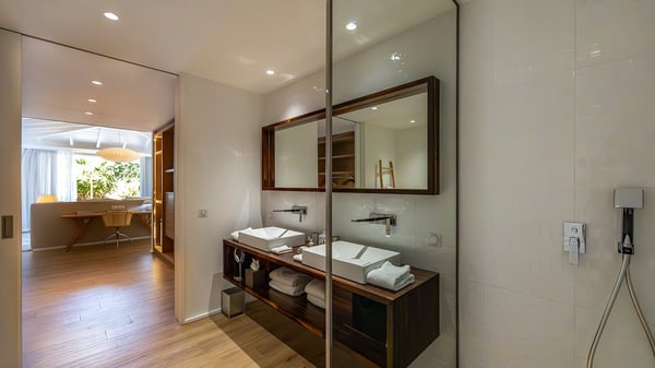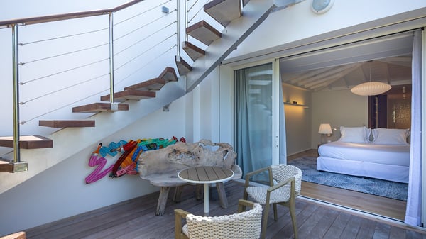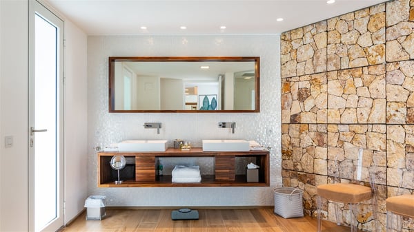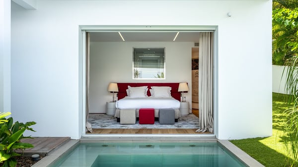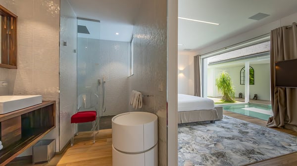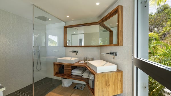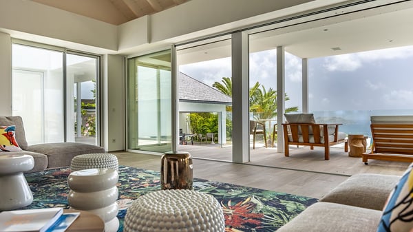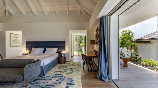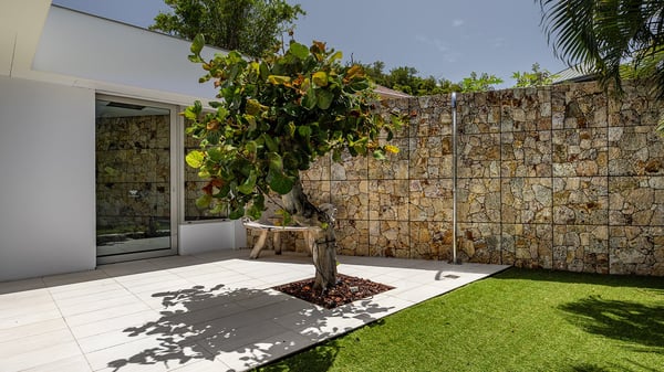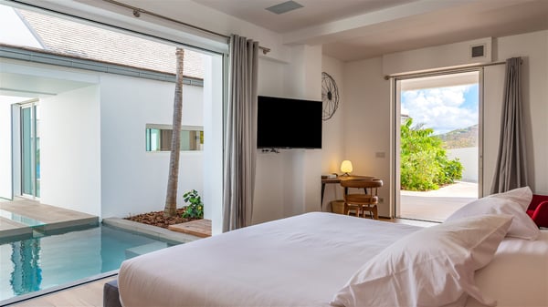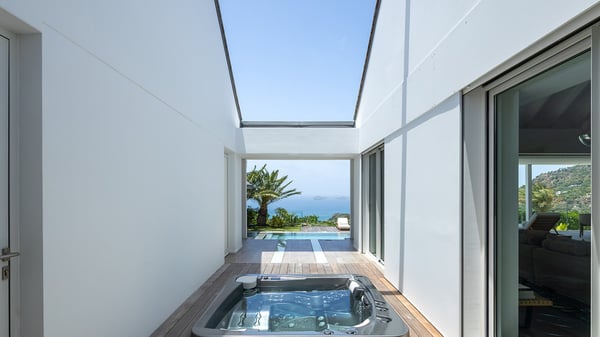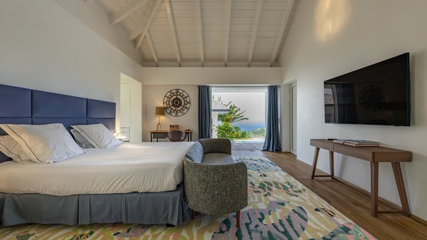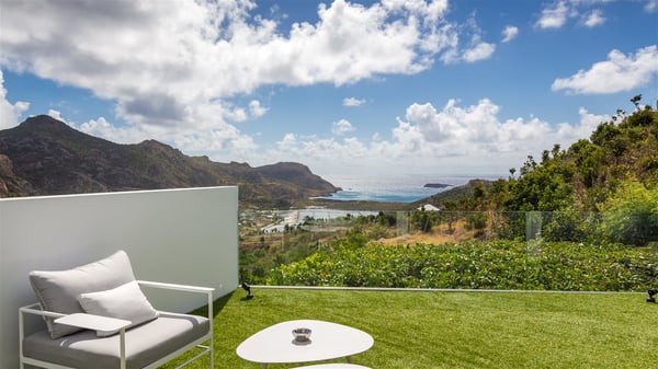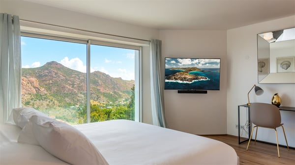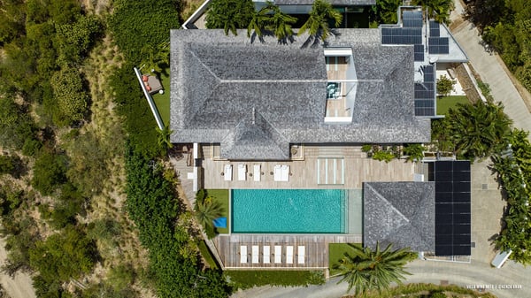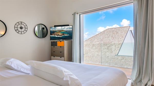 Located on the heights of St. Jean, vacation rental Wine Note is one of the most luxurious villas in St. Barths. With high-end amenities and a sleek decor, this five-bedroom vacation home is the perfect choice for a heavenly stay with family or friends in the Caribbean. Only a few steps away from St. Jean Beach, villa Wine Note is a contemporary property with an airy design reminding fine wine and famous chateaus. As soon as you enter, you'll marvel at the sumptuous glass cellar located near the professional kitchen, perfect for private chef services. The living room widely opens onto the terrace with breathtaking ocean views and features a chic indoor dining room that can accommodate up to fourteen guests. Under the vaulted ceiling, the large windows bring in a truly shining light, in a gray and yellow décor with hints of wood. At the front of the house, the terrace is facing a breathtaking view over the ocean and the bay of St-Jean. An outdoor living room is set up under the covered area, and a second dining room is set up on the side of the house for dining alfresco, next to an outdoor lounge on the green lawn with a panoramic view over Salines. A few steps down, there is a heated mirror swimming pool in an enchanting setting: lounge chairs, a charming gazebo and a romantic daybed are set up on the deck for reading or talking sessions under the sun. In this idyllic scenery, you’ll marvel at the Caribbean lush vegetation while strolling in the tropical garden. The outstanding villa Wine Note is composed of five air-conditioned rooms with private bathrooms and beautiful ocean views. Three of them are in the main building, including one on the lower level, while the other two are located in a separate pavilion for utmost privacy. The amenities are luxurious in a refined décor with terrace access, among which one with a lovely sparkling pool. An air-conditioned fitness room is also at your disposal during your stay. Between sky and sea, the villa Wine Note is an exclusive property, a perfect place for an unforgettable stay in Saint-Barthelemy.