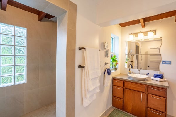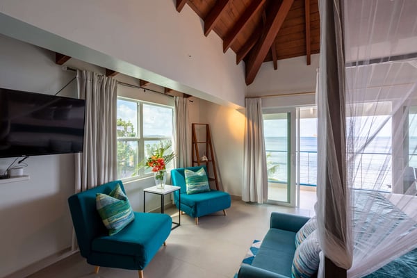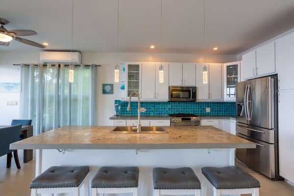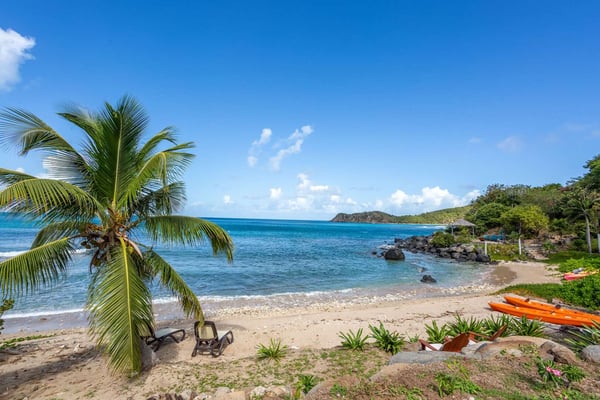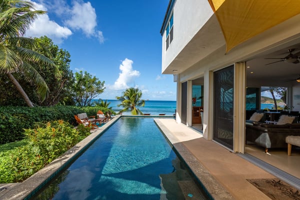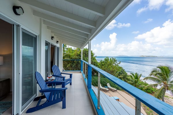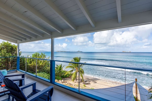 A short drive from Spanish Town along the stunning Nail Bay road takes visitors to the beautiful and exclusive villas of the Nail Bay Resort. Guests arriving at Azure Wish are welcomed to an expansive driveway, surrounded by mature gardens and privacy hedges. Entry to the villa reveals a large air-conditioned foyer, with access to the Coral and Sand Suites with king size beds (the Sand Suite can optionally be configured with two twin beds) and a bright and modern four piece bathroom. The Coral Suite has doors to the foyer and directly out to the pool deck. Turning the corner into the main living area reveals a stunning wraparound view of the Caribbean Sea and the Dog Islands. A new complement of sliding glass doors allow the living, dining and kitchen areas to open wide and capture the fresh Caribbean breezes. Air conditioning is present but rarely needed. The kitchen is large, modern and well equipped with new appliances and concrete countertops. Immediately outside is the new heated pool L-shaped pool with a shallow 10x12 lounging area (perfect for kids) and a generous 10x40 swimming area adjacent to a shaded outdoor dining area. Seaside decks offer recliners or modern wicker furniture for sunbathing atop new quartz decking. Upstairs holds two large master bedrooms, each with grand cathedral ceilings and a well-appointed en-suite bathroom with large double showers. The villa is so close to the water the master bedrooms seem like cruise ship cabins, with sight lines that overlook the beach, directly into the stunning azure Caribbean waters. Close the windows and doors for air-conditioned bliss or leave them open to enjoy the evening breeze and sounds of the ocean. The villa offers amazing snorkeling and spectacular sunsets in one of the most private settings on Virgin Gorda.