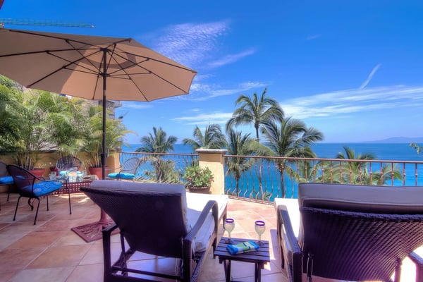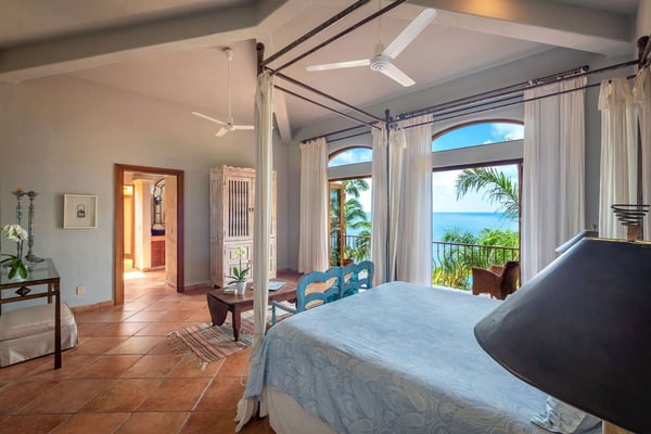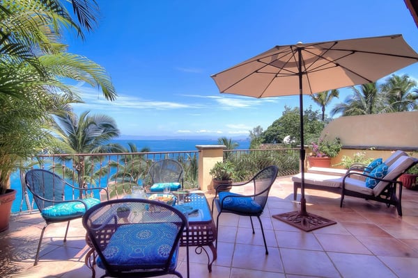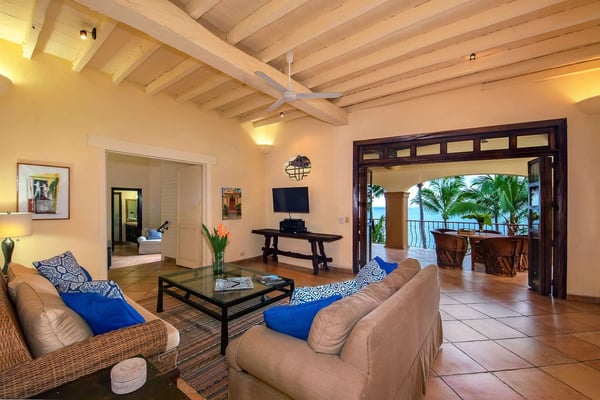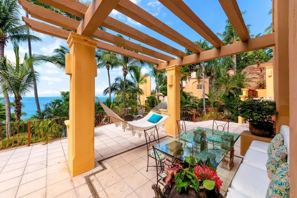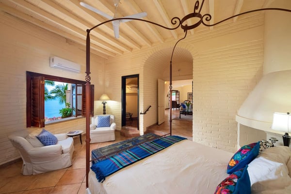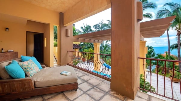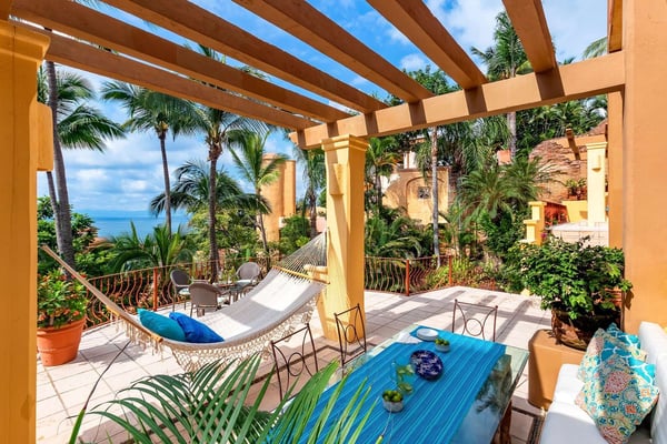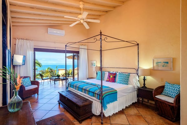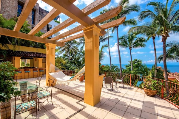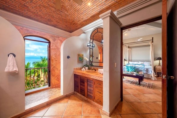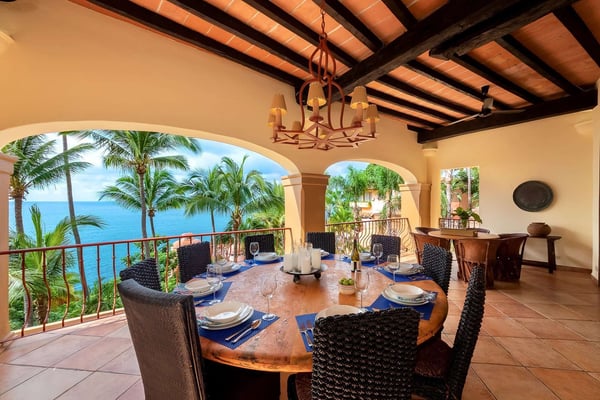 Villa Las Puertas is an elegantly designed seven bedroom Mexican estate with room for fourteen. This 10,750+ square foot villa has plenty of space for your group and overlooks the Bay of Banderas while having direct beach access just 150 steps away down a private staircase. Las Puertas' entrance features a set of astounding Moroccan carved wood doors that open up to a lush courtyard with a private heated swimming pool. There is also a lovely terrace that has a wet bar, multiple living and dining room areas, as well as a large Jacuzzi splash pool. The villa has three levels with the top floor having four bedrooms with access to an outdoor balcony space either private or shared. The main level has two bedrooms, and the lower level has the final secluded bedroom with an ensuite bathroom. All bedrooms have a king-size bed except the 7th bedroom, which is accessed through another room with two twin-size beds, perfect for kids. All but one-bedroom suite have ensuite bathrooms. Walking along the beach, this villa is just a ten to fifteen-minute walk into the Old Town Romantic Zone, or if you prefer to take a taxi or Uber. This property is located next door to Villa Estrella Mar and can be rented in addition should you have a large group that you want to have nearby. Small events with up to 30 total guests are allowed, please inquire for details. No bachelor parties or student groups are allowed.
