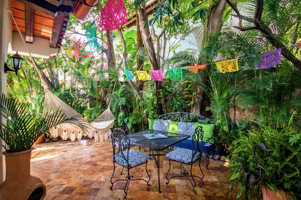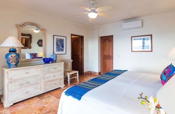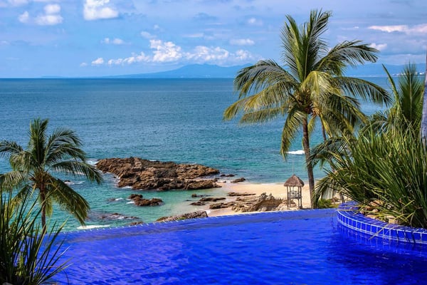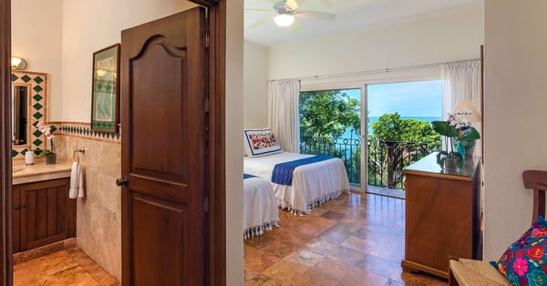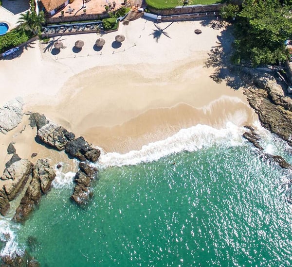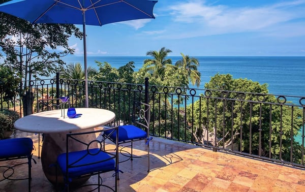 Located approx 2 miles from downtown Puerto Vallarta, beachfront inside a Residential complex, Villa Vista de Aves is completely private and self-contained with a private entrance and pool. Easy access to beach thru the complex garden and elevator and also enjoy the large common pool and Palapa-covered open-air living space on the beach. The villa has over 7000 Sq. Ft of indoor and outdoor living space, a heated infinity pool and a spectacular water feature with 2 giant palm trees to frame the view of the sunset. The main level is an open-concept entertaining area with living, dining and very well-equipped kitchen all flowing out to the main terrace with infinity pool lounging areas and outdoor dining. The 2-level pool is an upper water feature with two giant palms. The lower level is the heated infinity pool approx dimensions 12 X 18 feet and 4 feet deep The villa design is contemporary with simple lines, with an infusion of Mexican hand crafted textiles and one of a kind folk art. The name translates as View of the Birds and you will see many sea birds glide past above the ocean and hear birds in the nearby Trees.