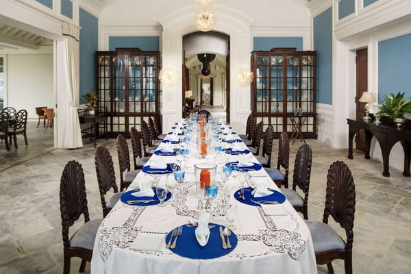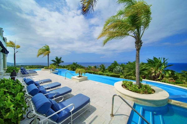 The Tryall Club requires all villa and condo guests to become members during their stay via a Temporary Membership Fee ($) (plus a 15% service charge). Children between the ages of 13 and 15 pay at a discounted rate (plus a 15% service charge). Guests can also pay per day, for guests ages 16 and older, who stay for one to four days. This can be either prepaid or upon arrival at the Club. For children 12 years of age and younger, our Temporary Memberships are complimentary. Please contact a Villa Specialist for exact pricing! The pinnacle of luxury, Twin Palms is intended for those who demand nothing less than the finest. This exquisite home promises an amazing getaway with its unmatched comfort, flawless attention to detail, and breathtaking 60-mile ocean views. Set on 10 acres of lush, manicured lawns, Twin Palms is a seamless blend of Caribbean elegance and European grandeur. Inspired by the Great Houses of Jamaica with touches of Roman and Moroccan influence, the villa’s graceful columns, shaded courtyards, and hand-crafted lanterns create a timeless ambiance. Airy interiors flow effortlessly, allowing the gentle ocean breeze to sweep through, while soothing blue, coral, and red tones enhance the serene atmosphere. The villa’s seven bedrooms are divided into three private suites, connected by a columned walkway leading from the central courtyard. The primary suite features a four-poster king-size bed, a spacious en-suite with a sunken circular bathtub, and an adjacent workout room. Two additional suites each offer a sitting area, a king bedroom, and a second bedroom with two double beds—perfect for families or groups. Designed for both entertaining and more intimate gatherings, the villa boasts a stunning veranda with multiple lounging and dining areas, a bar, and a seven-tiered pool deck. The 60-foot infinity-edge lap pool is complemented by a children’s wading pool and whirlpools. Nearby, a secluded fire pit provides the perfect spot for sunset views. For relaxation or entertainment, guests can unwind in the elegant drawing room, media room with a large flat-screen TV, or the dedicated game room with foosball, table tennis, and cozy reading nooks.