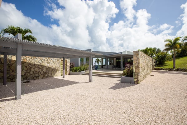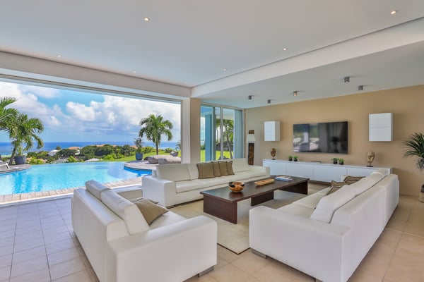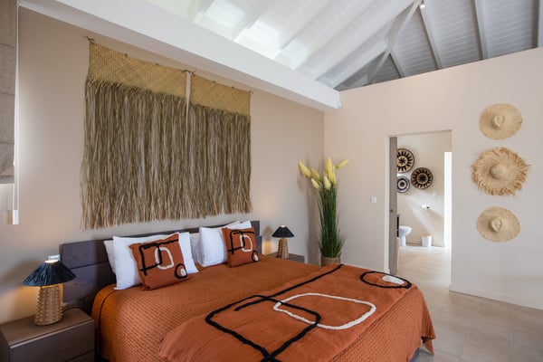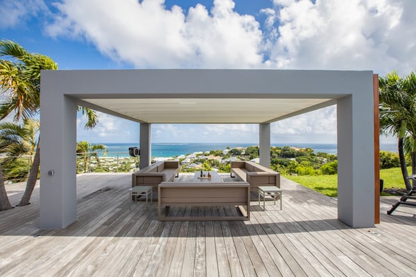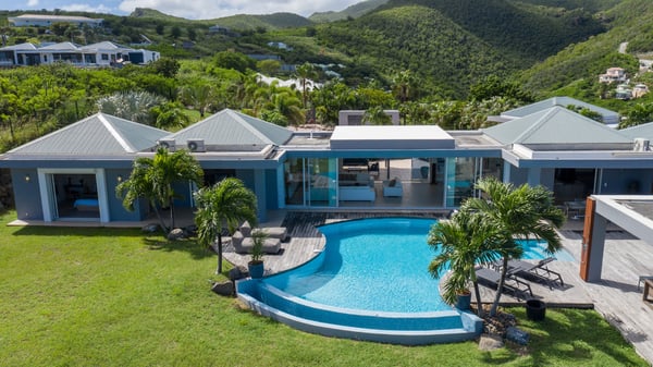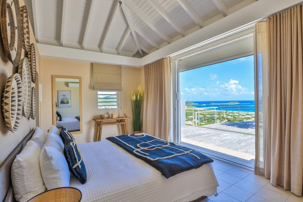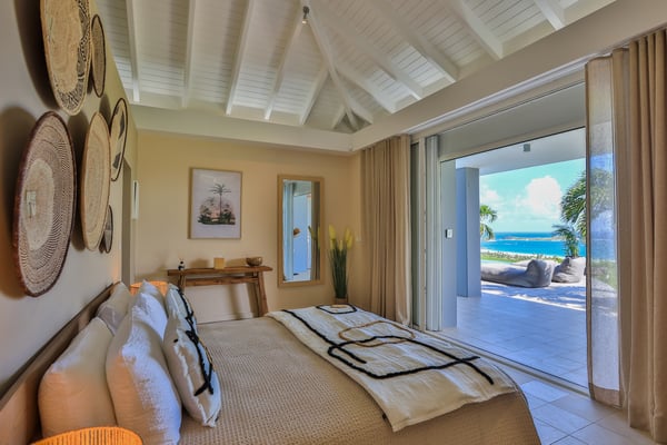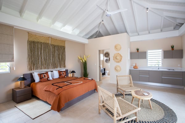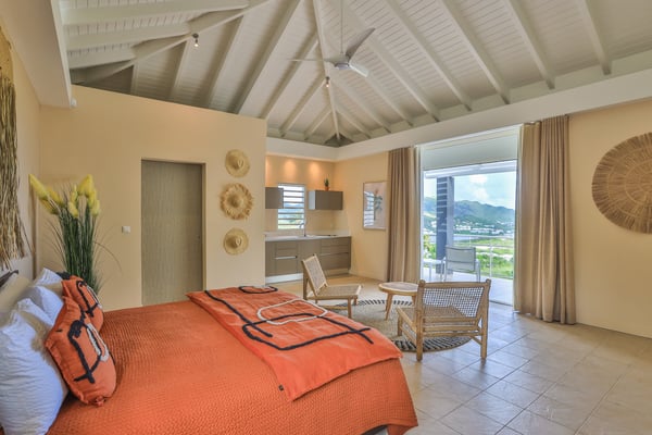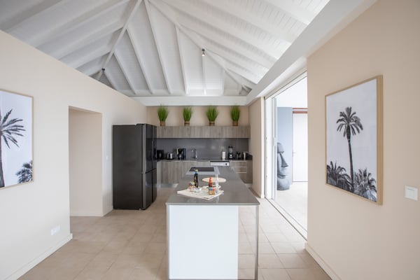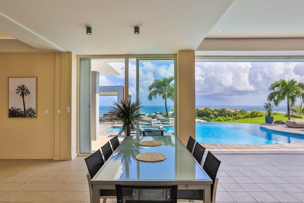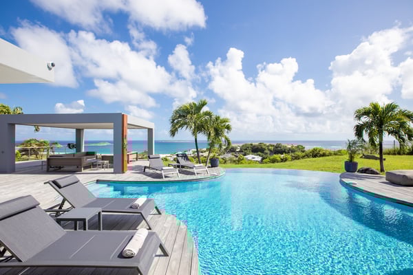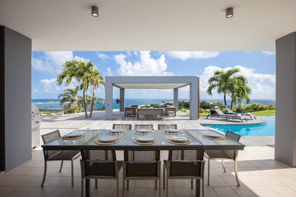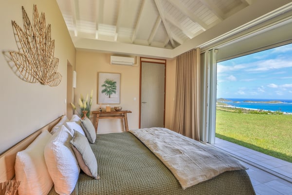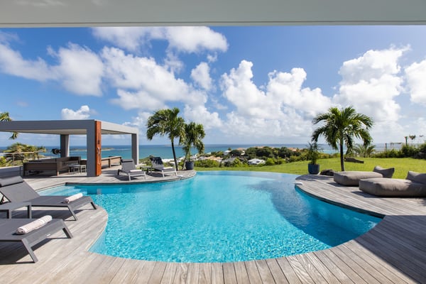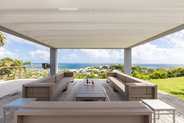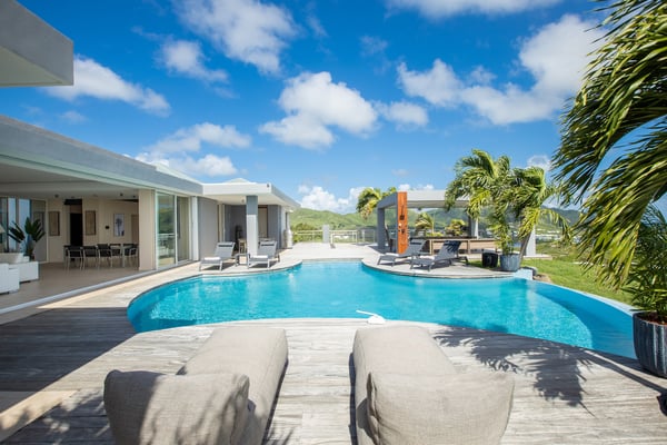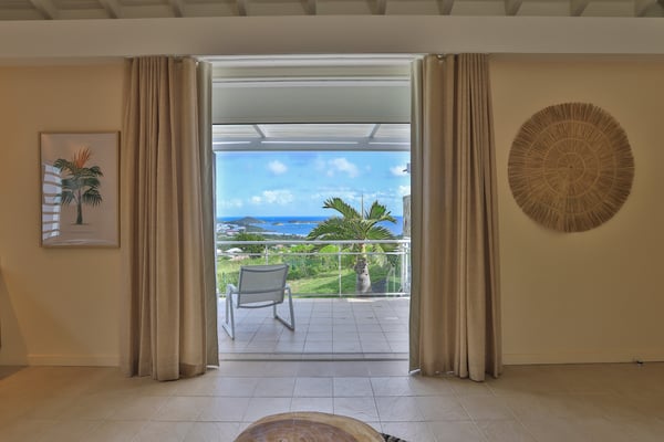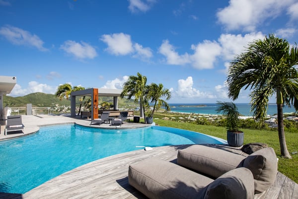 Located on the heights of Orient Bay, Villa Karukera offers a breathtaking 180° view of Orient Bay, Anguilla and St. Barts in the distance. This beautiful, recently renovated, contemporary four-bedroom villa is the perfect place to vacation in St. Martin and enjoy the island life. Upon entering the villa, the incredible panoramic view dazzles with tropical mountains and the endless blue sea and sky. The villa’s beautiful outdoor spaces open to a free-form infinity pool, a large open deck with plenty of room for poolside sunbathing, and a gazebo with a sitting area to enjoy the cool island breeze and views of our smaller neighboring islands, Green Cay, Pinel, and Tintamarre. A covered outdoor dining area, located just steps from the kitchen, is perfect for enjoying al fresco lunches or dinners during cozy times with family and friends. The beautiful entryway leads to a spacious, open living and dining area with views of the pool and ocean. With ample seating, this great room is ideal for spending time with friends and family, as well as entertaining. The villa has a fully equipped kitchen with an island where you can prepare your meals or have them prepared by one of our recommended chefs, while enjoying a beautiful ocean view. The primary bedroom opening to the pool has a king-size bed, an ensuite bathroom with an outdoor shower, and a jacuzzi. The other two poolside bedrooms each have a king-size bed, and an ensuite bathroom with an outdoor shower. The fourth bedroom, located in a separate bungalow, a few steps away from the main house, offers a lot of privacy and a beautiful ocean view. It features a king-size bed, an ensuite bathroom, its own terrace, and a small kitchenette. The villa is ideal for families and couples, with the space and comfort to sit and relax while enjoying the sun and island life. Although secluded, you are only a three-minute drive to the famous Orient Bay beach, restaurants, bars, and stores. You are also a short drive from the fantastic culinary scene of Grand Case, or the beautiful beach of Anse Marcel. This villa can also be rented as a three or four-bedroom villa.