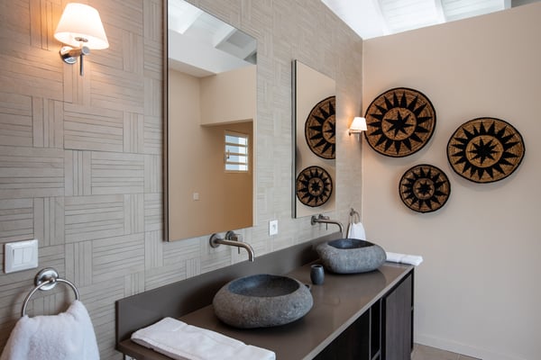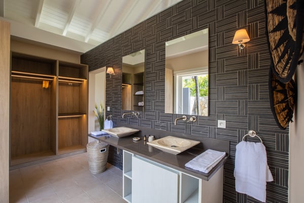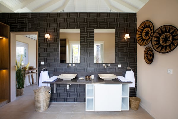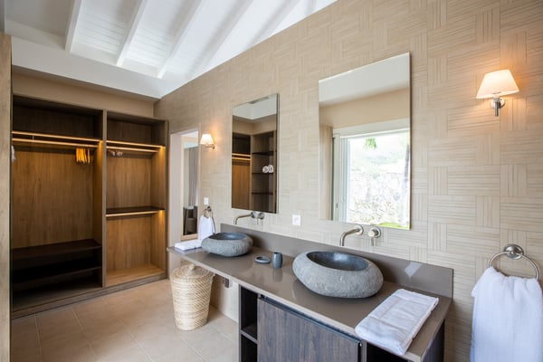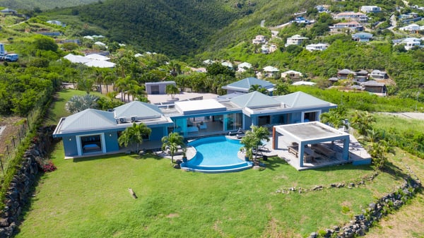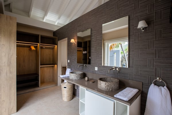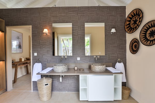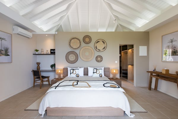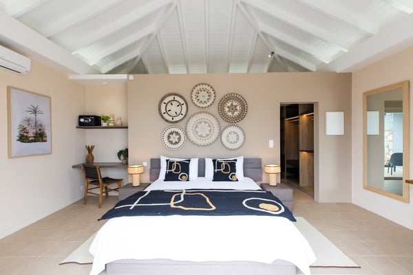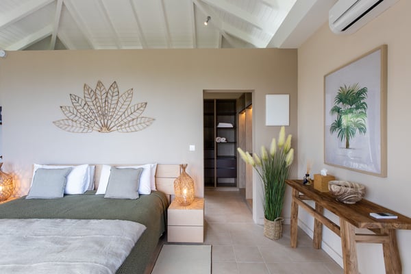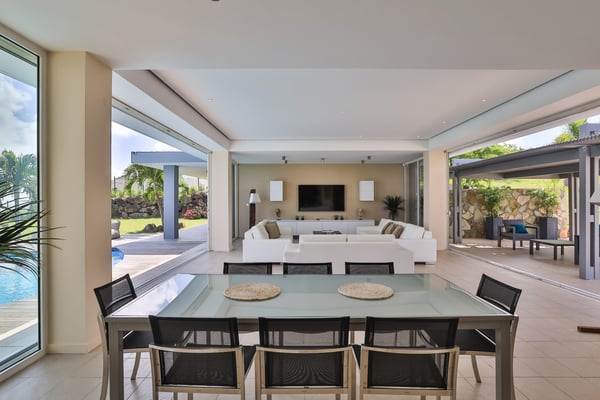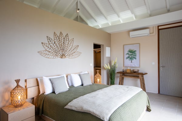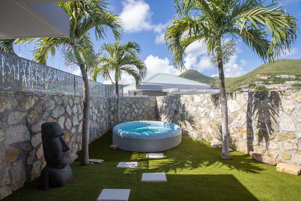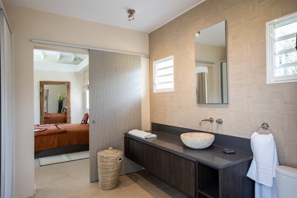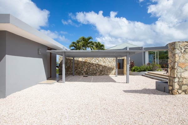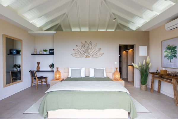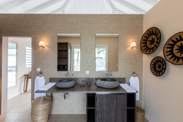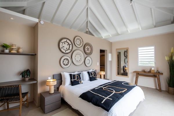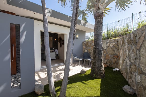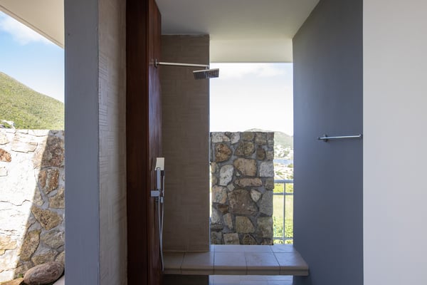 Located on the heights of Orient Bay, Villa Karukera offers a breathtaking 180° view of Orient Bay, Anguilla and St. Barts in the distance. This beautiful, recently renovated, contemporary four-bedroom villa is the perfect place to vacation in St. Martin and enjoy the island life. Upon entering the villa, the incredible panoramic view dazzles with tropical mountains and the endless blue sea and sky. The villa’s beautiful outdoor spaces open to a free-form infinity pool, a large open deck with plenty of room for poolside sunbathing, and a gazebo with a sitting area to enjoy the cool island breeze and views of our smaller neighboring islands, Green Cay, Pinel, and Tintamarre. A covered outdoor dining area, located just steps from the kitchen, is perfect for enjoying al fresco lunches or dinners during cozy times with family and friends. The beautiful entryway leads to a spacious, open living and dining area with views of the pool and ocean. With ample seating, this great room is ideal for spending time with friends and family, as well as entertaining. The villa has a fully equipped kitchen with an island where you can prepare your meals or have them prepared by one of our recommended chefs, while enjoying a beautiful ocean view. The primary bedroom opening to the pool has a king-size bed, an ensuite bathroom with an outdoor shower, and a jacuzzi. The other two poolside bedrooms each have a king-size bed, and an ensuite bathroom with an outdoor shower. The fourth bedroom, located in a separate bungalow, a few steps away from the main house, offers a lot of privacy and a beautiful ocean view. It features a king-size bed, an ensuite bathroom, its own terrace, and a small kitchenette. The villa is ideal for families and couples, with the space and comfort to sit and relax while enjoying the sun and island life. Although secluded, you are only a three-minute drive to the famous Orient Bay beach, restaurants, bars, and stores. You are also a short drive from the fantastic culinary scene of Grand Case, or the beautiful beach of Anse Marcel. This villa can also be rented as a three or four-bedroom villa.