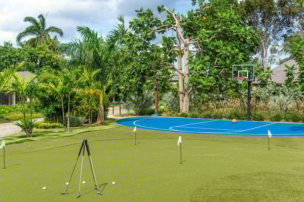 • Five-hole 1,300-sq-ft graded synthetic turf putting green and sand bunker