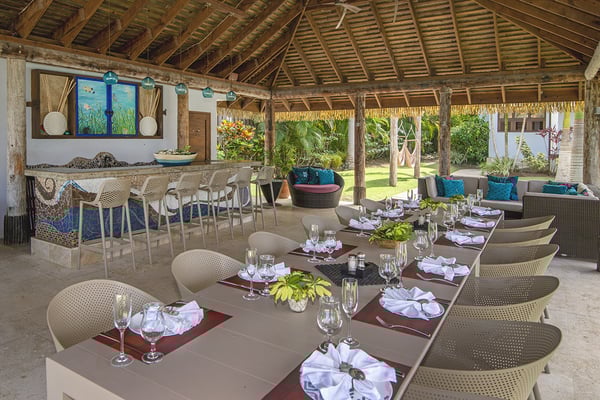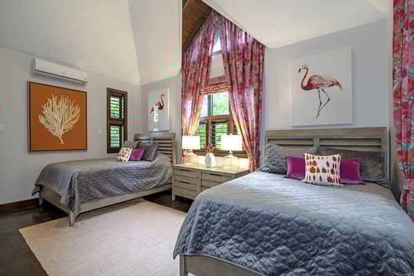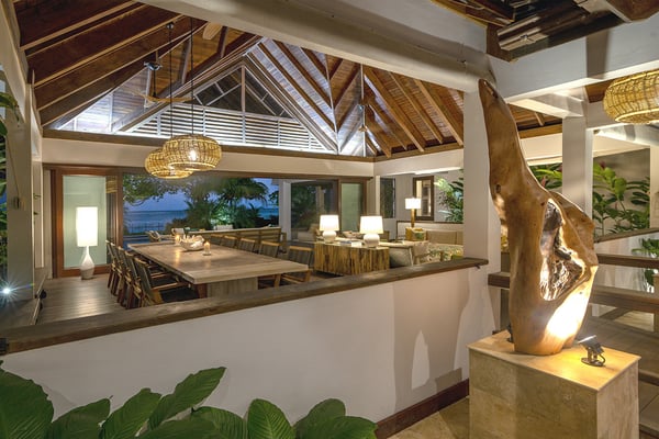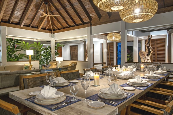 Here is a dream come true for the three-generation family whose wish list of individual requirements includes copious space for togetherness; intimate space to take a nap, finish a novel or have a massage; sporting options to satisfy restless cravings for activity and the stimulation of competitive sports; and spacious dining areas when those other cravings kick in and your chef rings the bell that signals time for another long, leisurely, luscious meal. In short, make your multi-faceted wish list and take a look at Canoe Cove. The 200-foot beach ranges in width from sea wall to surf from 15 feet in high tide to 30 feet in low tide, varying with weather patterns. For joggers or strollers, the extended beach length is approximately 1,000 feet. The uninterrupted view extends all the way to the horizon, punctuated a few times each week by tall white cruise ships drifting silently across your view toward the harbor. Canoe Cove encourages a relaxing vacation with an abundance of sporty options balanced with as much pure relaxation as anyone could want. The location is amazing. The service is excellent. The villa itself is stylish without pretense or overstatement, uncluttered, and totally livable. Inside, textures of exotic woods establish a grounded, organic ambiance as a backdrop against stylish furnishings. Cedar, Jojoba, Honduran pine, marble, coral stone, and natural cement floors are cool under bare feet. Finishes of reclaimed teak and driftwood echo the Caribbean venue. Decorating a hallway is a whimsical six-pendant lamp made entirely of old magazines and looking remarkably like bark. Across the lawn, supporting structures of the gazebo are purloined telephone poles with bamboo-clad bases. Delicate orchids cultivated on-site contrast with other natural materials and adorn most rooms. For tennis buffs who want to bring their own pro from home, onsite sleeping accommodations can be arranged, and the villa staff will look after this guest. Nannies from home may sleep in the child's room.