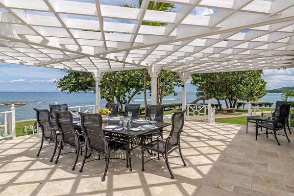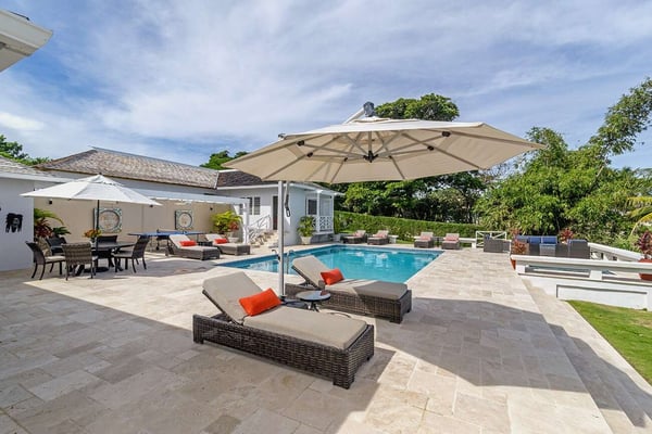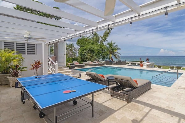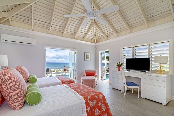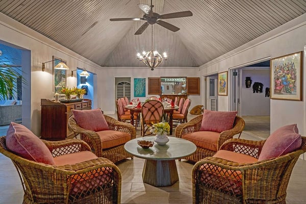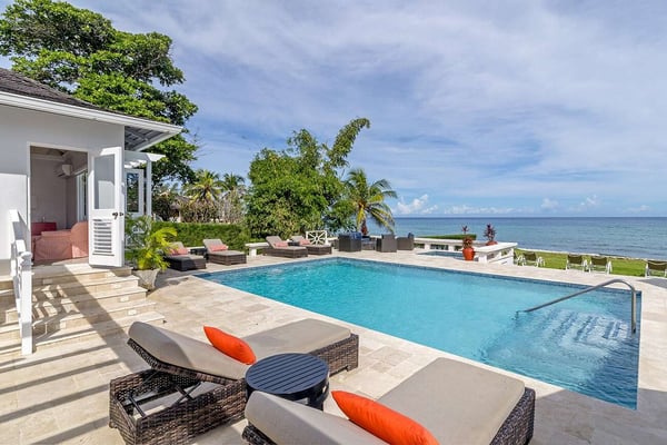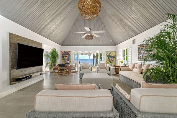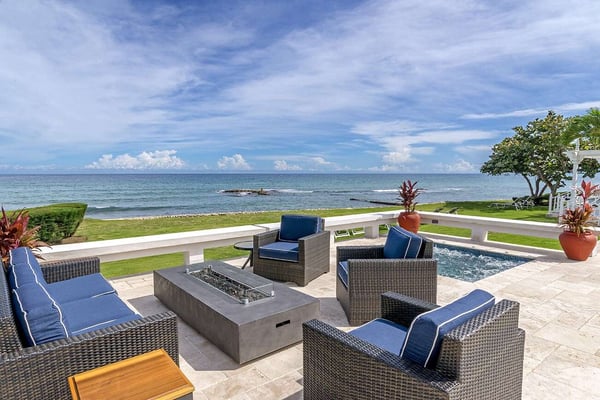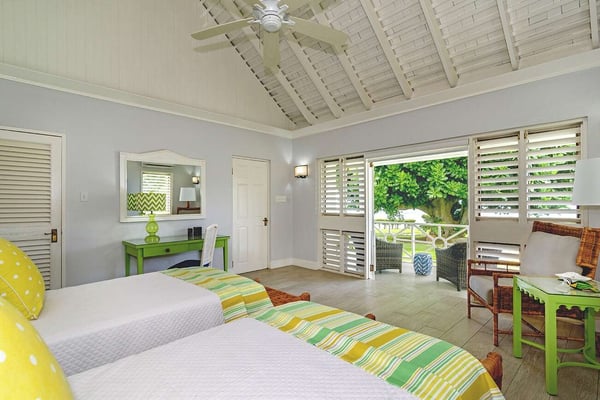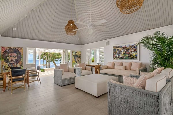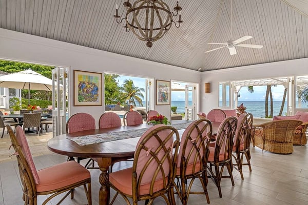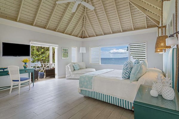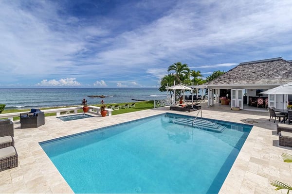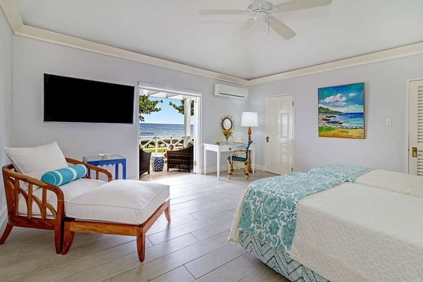 The Tryall Club requires all villa and condo guests to become members during their stay via a Temporary Membership Fee ($) (plus a 15% service charge). Children between the ages of 13 and 15 pay at a discounted rate (plus a 15% service charge). Guests can also pay per day, for guests ages 16 and older, who stay for one to four days. This can be either prepaid or upon arrival at the Club. For children 12 years of age and younger, our Temporary Memberships are complimentary. Please contact a Villa Specialist for exact pricing! Seaspray is the perfect Caribbean retreat with breathtaking ocean views, gentle waves lapping against the reef, and calm trade winds swaying the trees. Nestled in an idyllic cove at the water’s edge, this charming four-bedroom villa is just steps from the championship Tryall Golf Course, the private Club beach, and exciting water sports, making it one of the most complete villas at Tryall. Designed in classic Caribbean style, the villa features lofty ceilings, oversized windows, and expansive terraces that embrace its oceanfront setting. Seaspray is built on a single level and has a main villa and a detached poolside cottage, both decorated in casual coastal elegance. There are three bedrooms in the main villa: two twin-sized bedrooms with private patios and a king-size bed in the master suite. The fourth bedroom in the separate cottage also features twin beds and opens directly to the pool deck. All bedrooms include en-suite bathrooms for ultimate privacy and comfort. Seaspray perfectly captures the spirit of beachside life, from the shaded courtyard entrance to the cozy living area with expansive ocean views.
