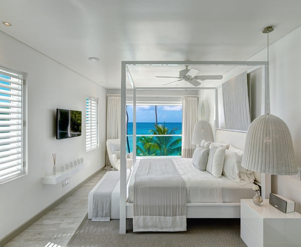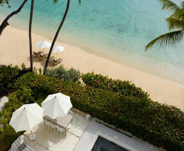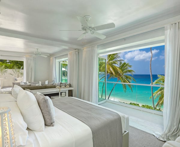 Please note: The beach experiences seasonal fluctuations in its accessibility. Step inside a modern luxury vacation rental on Barbados' best beaches. Footprints offer contemporary design, premium creature comforts, and 5-star service. Enjoy a private infinity-edge pool, a beach-side wading pool, and a fantastic white sand beach. Dine with a view of the sunset from the terrace without lifting a finger. Footprints is a luxury villa rental set on 12,000 sq. ft. of beachfront land. It features 5 contemporary suites in the main house for up to 10 guests and can be rented with one of the two 3-bedroom cottages located just across the street, accommodating up to a total of 16 people. The main house has tranquil neutral décor with pops of color, iconic portraits, and various living areas. The ensuite bedrooms have soothing tones, sleek finishes, and marble tiling. The master bedroom features floor-to-ceiling windows, a rain shower, and sea views. Amenities include a roof deck tub, gym, cinema, wine chiller, private terraces, two pools, and a wet bar for outdoor relaxation.