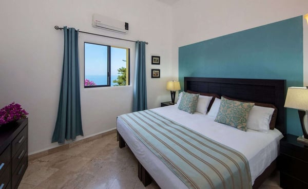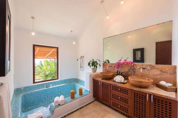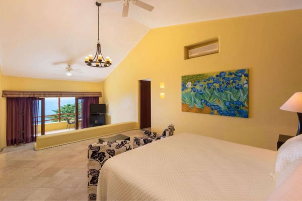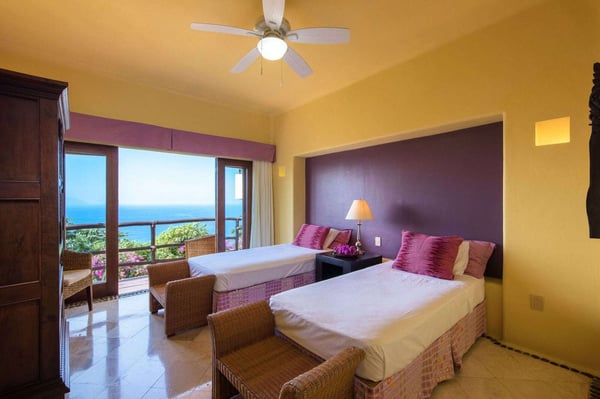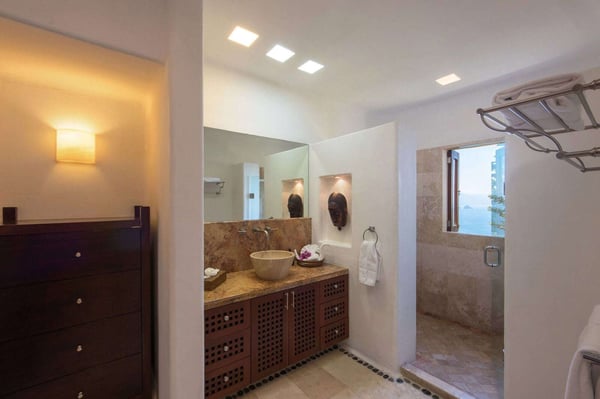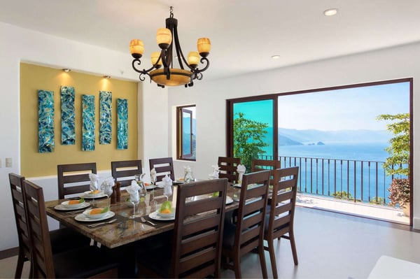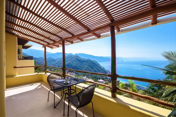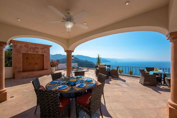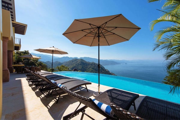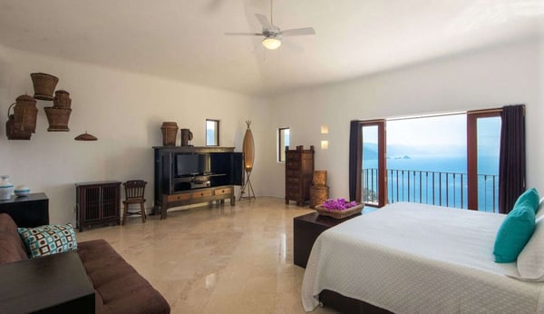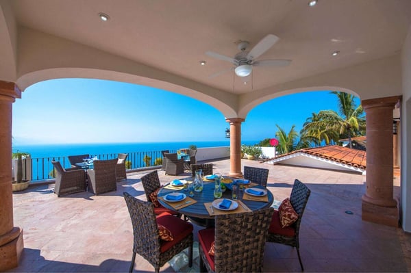 Villa Santa Cruz is located hillside in upper Concha's Chinas with breathtaking views of the South Coast, a short drive from the popular Romantic Zone and Los Muertos Beach. The design is relaxed coastal contemporary with organic details and colorful art and textiles to compliment the setting between the rain forest and the sparkling Pacific Ocean. The spacious eight-Bedroom villa offers numerous spaces for relaxing and entertaining with three indoor interior living/lounging zones plus a spectacular rooftop terrace with a fountain and covered open-air dining. The main level living area has a wall of windows that open completely to flow to the terrace and infinity pool and views to the ocean and south coast. The villa is a tranquil oasis inside a gated residential complex, approximately two miles from town or just a short drive to the bohemian energy of downtown, Romantic Zone restaurants, and Los Muertos Beach. The villa has a large heated infinity pool and includes full staff and all the amenities and comforts for a perfect Mexican getaway. Villa Santa Cruz is perfect for families, groups of friends, or corporate groups.