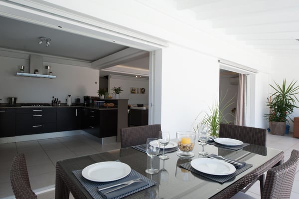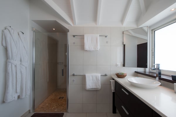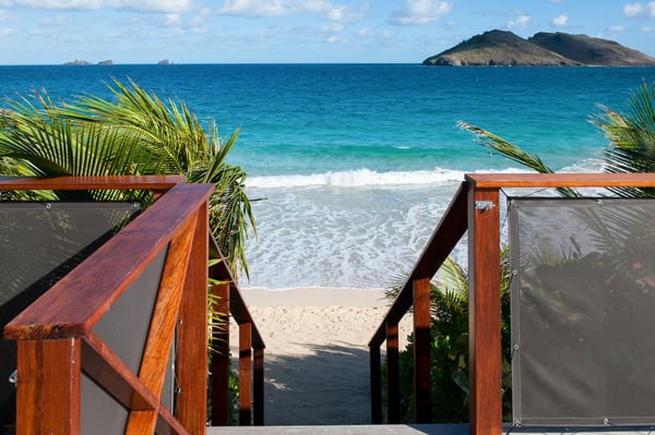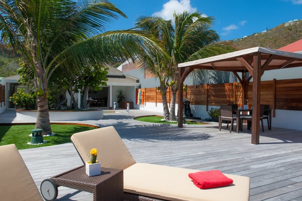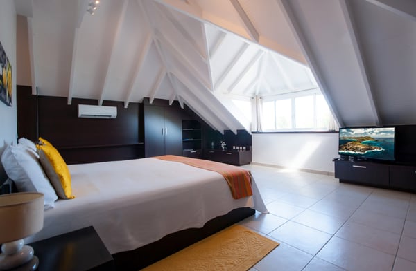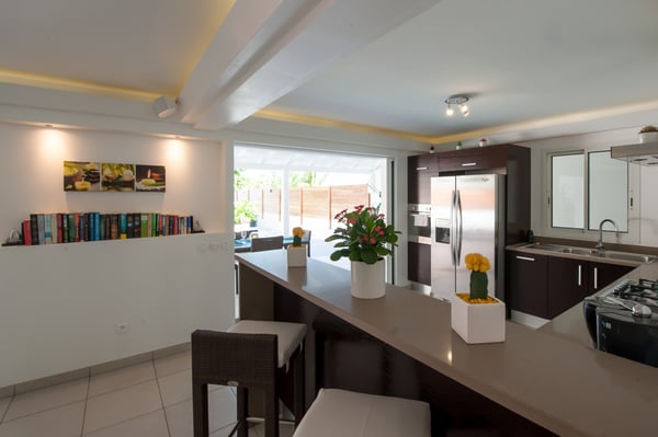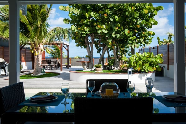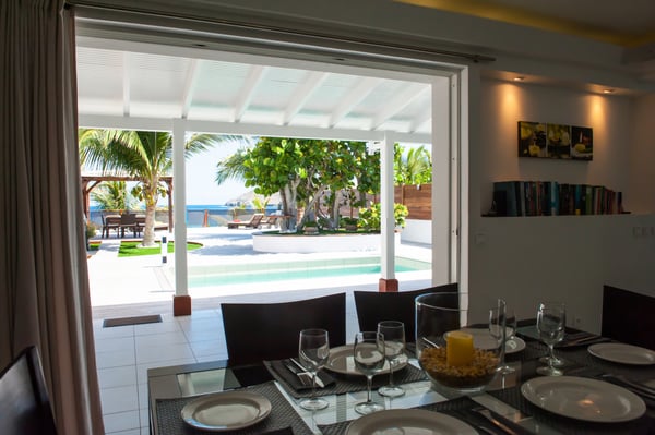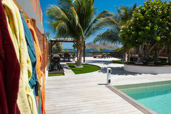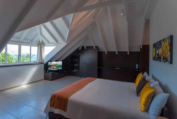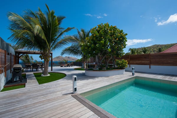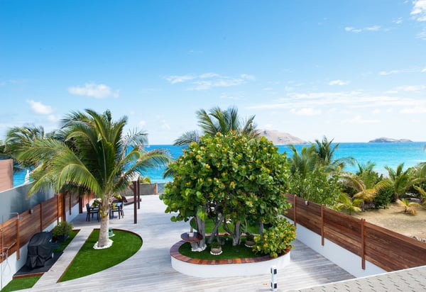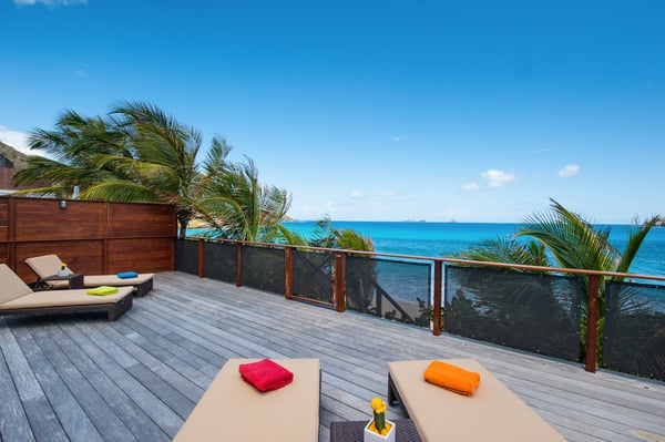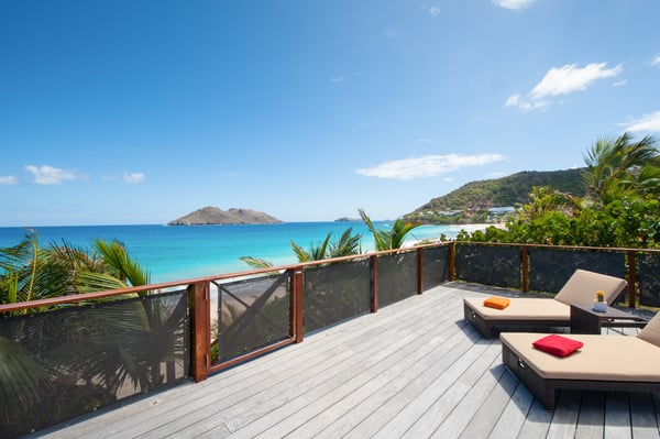 Imagine a sumptuous vacation villa close to the sea, located on the white sand of Flamands beach... The song of waves makes days truly enchanting in the island's mild breeze. The seaside villa Micela is the ideal place for an unforgettable stay in the heart of the Caribbean, facing the deep blue ocean. Built in a traditional style on two levels, the villa Micela in St. Barths is tastefully decorated to create a peaceful haven of peace in front of the sea. The living room is a most relaxing space: the large living room with comfortable sofas made of woven fibres and soft cushions brings a delightful feeling of serenity. The dining room can accommodate up to six guests around the indoor table. And in the morning, you will enjoy having breakfast at the bar with stools near the kitchen perfectly equipped for meal preparation. At the front, the large terrace is planted with palm trees with large chiselled leaves letting the sun rays and the trade winds go through. Near the pergola, an outdoor dining area is set up for nice evenings under the stars. There is also a beautiful swimming pool surrounded by deck chairs for sunbathing sessions. At one end of the terrace, a private wooden staircase leads you to the sandy beach of Flamands for pleasant moments in St-Barths’ salty air. The vacation rental villa Micela is composed of two beautiful and comfortable bedrooms with king-size beds. One of them occupies the upper floor and opens onto a breathtaking view over the ocean and the beach. Under the high mansard ceiling, you’ll feel a delightful feeling of well-being. The second bedroom is located on the same level as the living room, and has its own bathroom. A third bathroom for guests is also available for utmost privacy. Ideal for a family or two couples travelling together, the villa Micela in St. Barths makes your dream vacation by the sea come true.