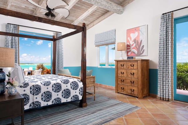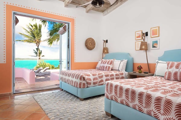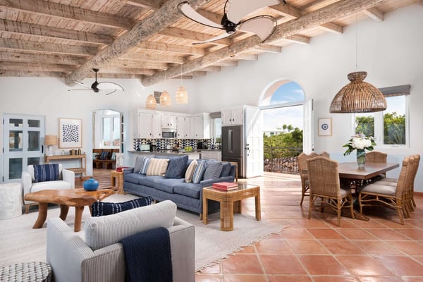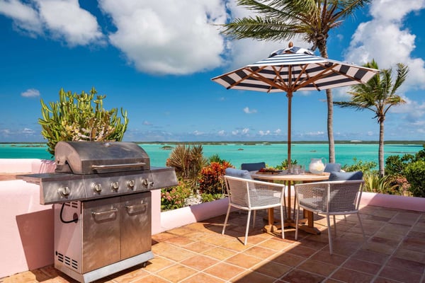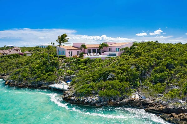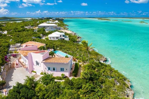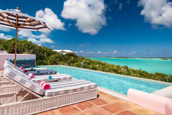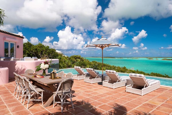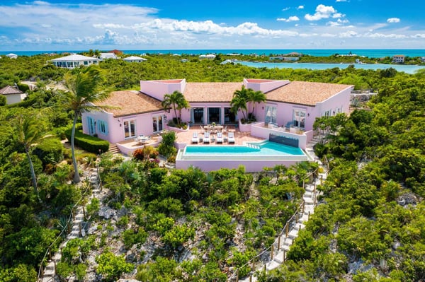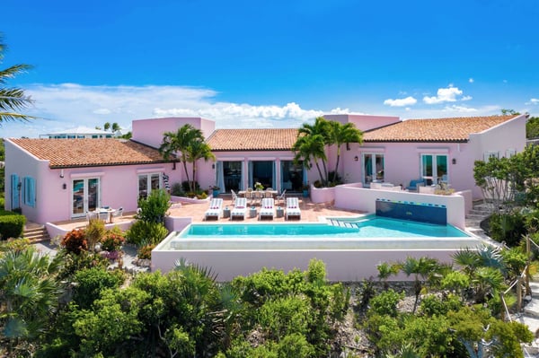 Welcome to Casa Rosada, your Caribbean vacation home. Casa Rosada is an architectural gem, perched on a hill overlooking picturesque Chalk Sound, capturing the cross breeze between the sound and ocean. As you look out upon this magnificent National Park, you will be transported to a paradise where you cannot easily see another home. The interiors feature raw wood beam ceilings and an eclectic mix of South Asian and Coastal-inspired furnishings that create a warm and welcoming ambiance throughout that will help relax you. A central great room is flanked on either side by a media den or the library, each of which leads toward two sets of bedrooms, making it perfect for two families of four, 4 couples or 8 friends. Seating abounds in the home, with a library filled with books and games, and a media room with a large flat-screen TV. Each bedroom boasts water views of the sound and access to the patio. The central great room has three sets of French doors that lead onto the pool deck with a 40-foot-long infinity-edge pool and hot tub that can fit 10 people. The outdoors is configured wonderfully for entertainment and dining al-fresco day or night, complete with a sound system and mood lighting. There is a covered pergola for those who prefer to sit in the shade and take in the view, or read in the evening. Head down to the dock for peace and tranquillity, where you can jump in the crystal waters of the sound, launch a kayak or paddleboard, or just bask in the sun in the hidden lounge nook. Casa Rosada is beautifully landscaped and fully fenced with imposing gates. It sits discreetly on a secluded cul-de-sac off of the main Chalk Sound Road giving it that invaluable extra privacy and peace.