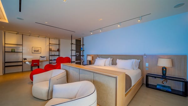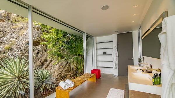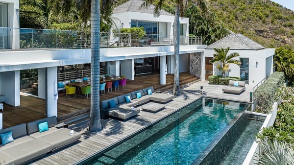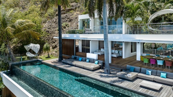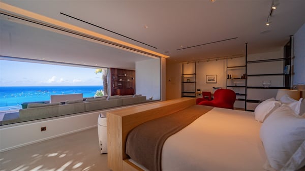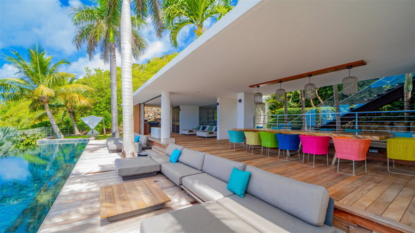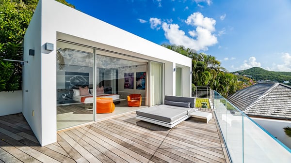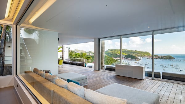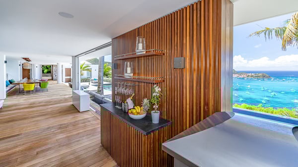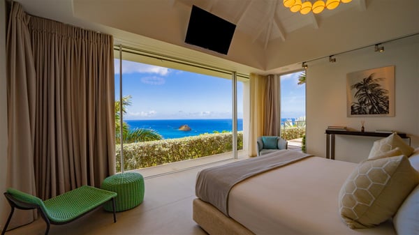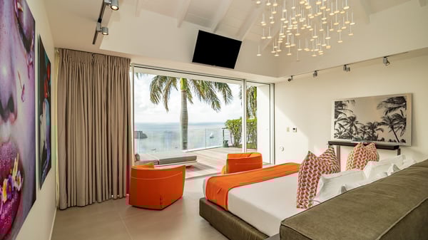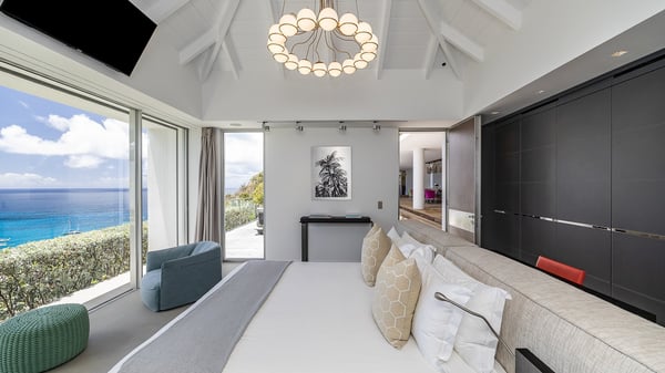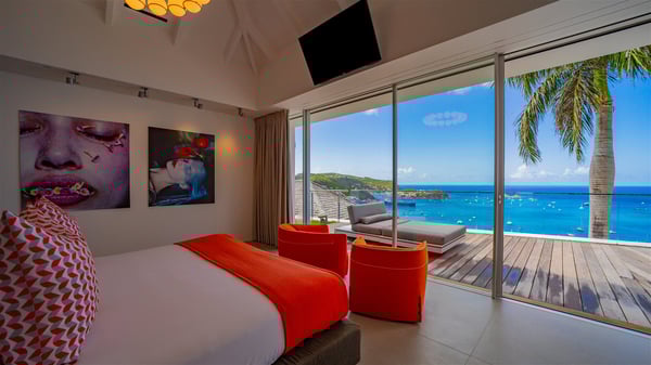 Nestled in the heights of Corossol, the holiday rental Utopic is a sumptuous property with fantastic views over the Caribbean sea and the islands of St. Kitts and Nevis. Spacious and very private, this three-bedroom vacation villa welcomes groups of friends looking for a dream place to stay in St. Barths. Villa Utopic is a very modern and spacious villa featuring an amazing infinity swimming pool in front of the sparkling sea. In the living room, photo works and touches of bright colours tastefully blend with the soothing tones of the fabrics. This most inspired combination makes the living room a true place of relaxation. A retractable screen is also at your disposal for pleasant movie nights. The kitchen is well-equipped to cook meals or to call upon a private chef for any festive event. In addition, the glazed living room opens onto a breathtaking view over the sea and the harbour of Gustavia, like a beautiful art that you’ll love watching and admiring. At the front of villa Utopic, there is a magnificent terrace, with a covered area featuring a dining space, bright armchairs and a solid wooden table. You’ll also enjoy the spacious outdoor living room with benches, ideal to sip a cocktail. Two steps down, the long, infinity swimming pool seems to melt with the deep blue sea. Comfortable daybeds are facing the view, between the tall palm trees that bring a vegetal touch to the whole. In this lovely scenery, there are also original colourful cushions, close to the green lawn with a pretty swing for delightful moments of rest. The rental villa Utopic is composed of three air-conditioned bedrooms over two bungalows. One bedroom is located on the main level and the other two ones are on the second floor. All three have king-size beds, en-suite bathrooms and office areas. They open onto an outstanding view over the sea through the glass walls which provide a pleasant sense of volume to the whole. There are beautiful photographs in each bedroom, with bright colours and soft textiles. What’s more, sports lovers will be delighted to find the fitness room. Like a paradise, villa Utopic is the very perfect place for an unforgettable stay in St-Barths.