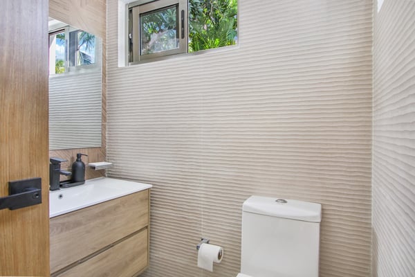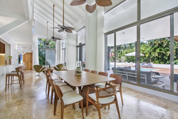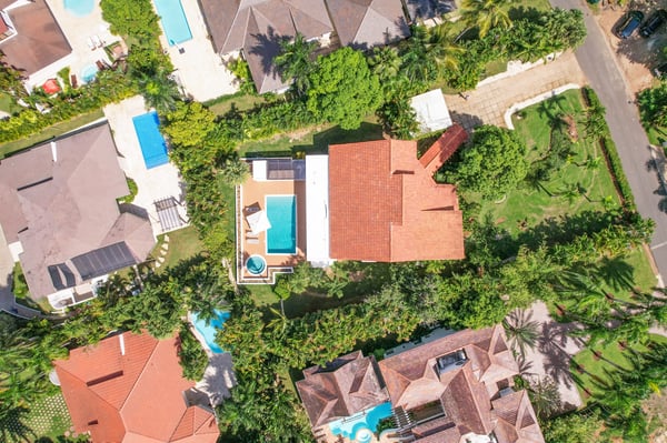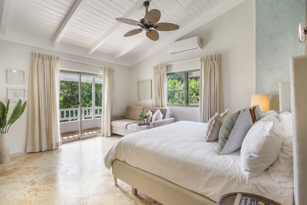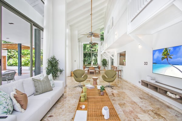 All guests must register with the Casa de Campo Concierge office, and for a small daily fee ($30 per adult per night & $15 per child per night), are granted access to resort areas and amenities. Casa de Campo Resort facilities and amenities include golf courses ($), the fitness centre ($), racquet center ($), restaurants ($) and bars ($). Contact Rental Escapes for more information about pricing. Elegance Retreat is a lovely 5-bedroom, 5 1/2 bath, 2-story villa, completely renovated and remodeled with all new indoor-outdoor furniture in the fall of 2023. The villa is perfect for families who want to spend a nice, relaxed vacation in the Caribbean! The first thing you see when you come through the beautiful double front door at Elegance Retreat is the grand entrance hall with double-height ceilings. The open living- and dining area is the heart of the villa with stunning 23 ft. ceilings and windows that give you plenty of natural light. The living room has a comfortable sitting area with sofas, chairs, and a TV. The dining table seats 10 people comfortably and is a great place to enjoy your “formal” dinners. Next to the living-, and dining areas, there is a second living room with comfortable sofas, air-conditioning, and a ceiling fan. This living room can be closed off from the main living- and dining room and is perfect if you need a more quiet space to relax. The kitchen is fully equipped with everything you need AND the villa includes a private cook who will cook all your meals during your vacation (food and beverages are not included). Slide open the large terrace doors in the living- and dining areas and step out on the outdoor terrace and pool area. The outdoor space was renovated and updated in 2023. The large, covered terrace has an outdoor kitchen with a BBQ, an outdoor dining table, and a TV area with comfortable sofas. The pool, pool deck, and Jacuzzi were completely redone to give this outdoor space a contemporary and clean look while maintaining the privacy and surrounding tropical landscape. This is the perfect place to sunbathe, swim and relax. The pool area also has an outdoor shower. In the front of the villa, there is also a green lawn area with trees and palm trees where kids can run and play.