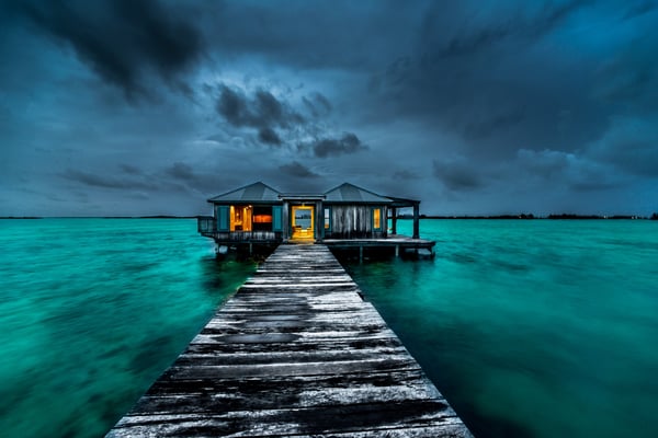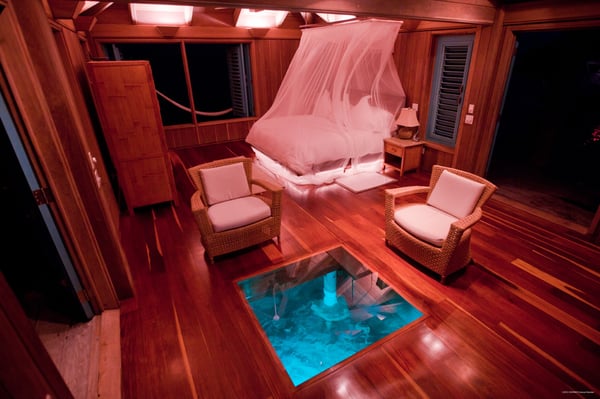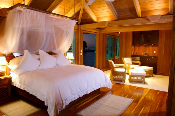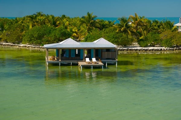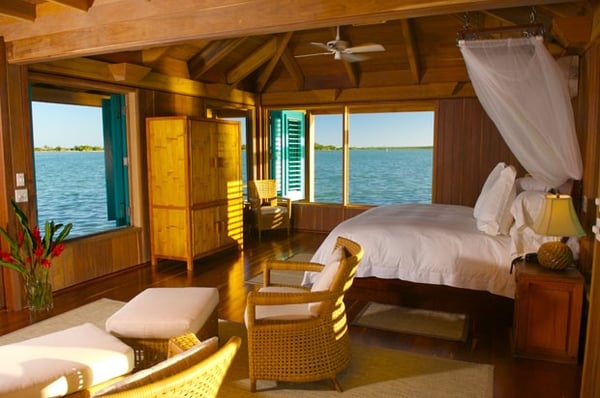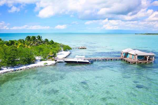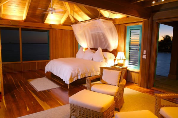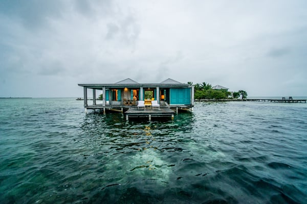 Our one-bedroom, over-water bungalow is designed in the same style as all of our other villas, thoughtfully appointed with every imaginable comfort, custom-crafted furnishings and amenities. This unique bungalow is the most intimate, romantic and requested accommodation on the island. Casa Ventanas is situated on the island's main dock, which stretches over 150 feet off the island. Surrounded on all sides by the beautiful, turquoise-blue Caribbean Sea, Casa Ventanas now features a glass floor section, which is a picture-perfect window into the exotic water world of Belize. Guests are always enchanted by all of the sea life swimming right past or under their bungalow. 1100+ square feet.