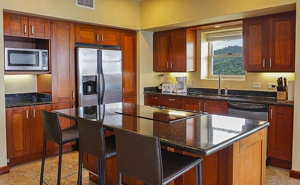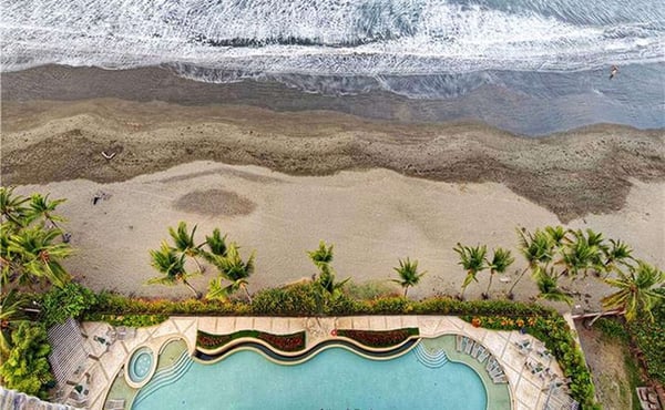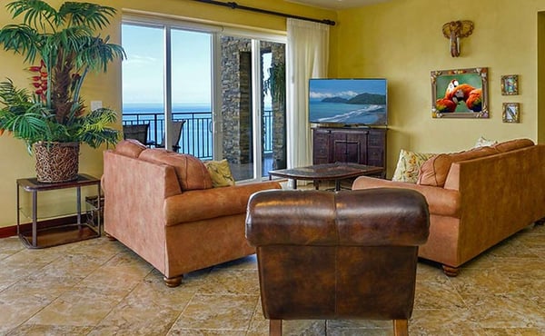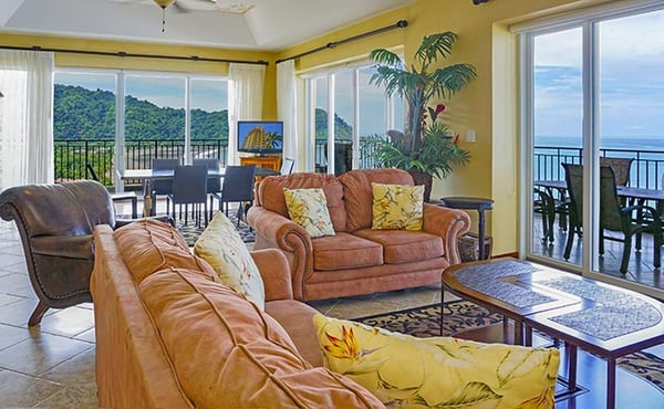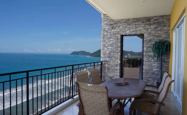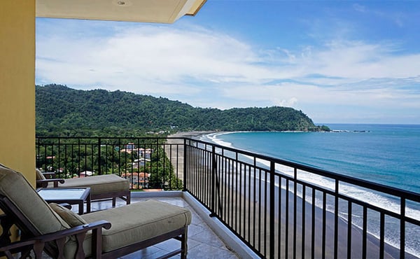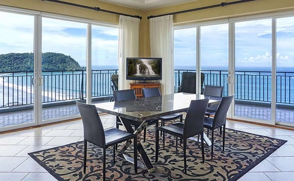 Deja Vu at Vista Las Palmas is a professionally-managed sky villa that covers the entire 15th floor of the plush Vista Las Palmas on Jaco Beach. With 5,600 square feet (520 m2) of air-conditioned space and 2,500 square feet (260 m2) of outdoor living space, this is one of the largest penthouses in Central America. The living room-dining room-kitchen has an open floor plan with floor-to-ceiling windows with spectacular views of the Pacific Ocean, from one end of Jaco Beach to the other plus the rainforest. Don't miss anything... the great room is equipped with two flat panel televisions! The chef's kitchen is fully outfitted for entertaining, including two commercial refrigerators. Vista Las Palmas is Jaco's must luxurious oceanfront condominium; it's also the second-tallest building in all of Costa Rica! Guests enjoy the oceanfront swimming pool, Jacuzzi, complimentary air-conditioned fitness facility, 24/7 security, and covered parking.