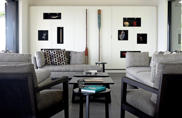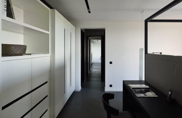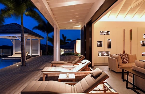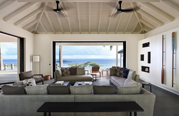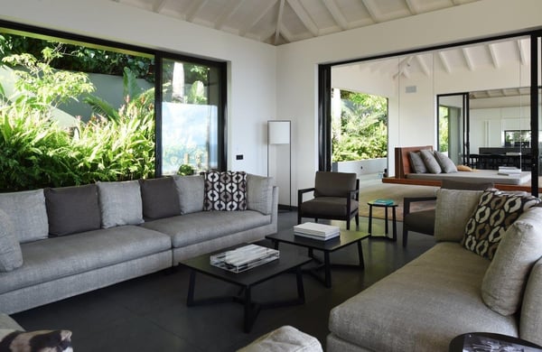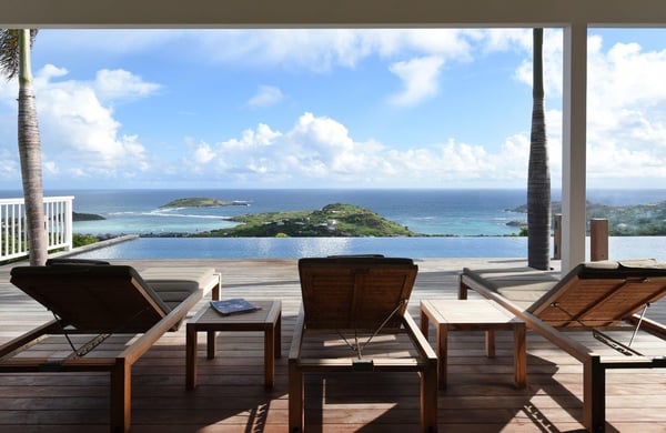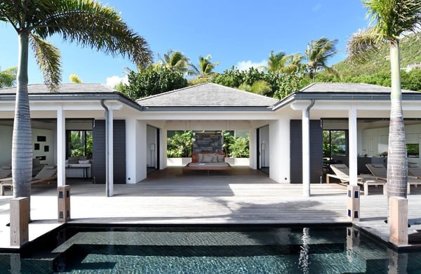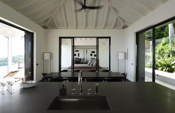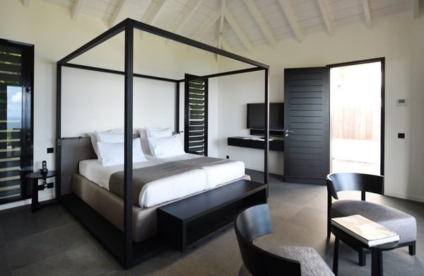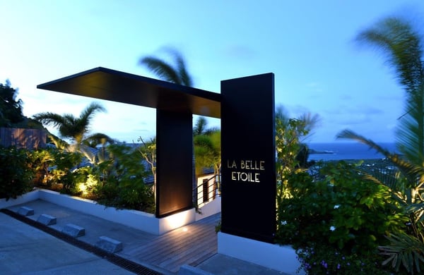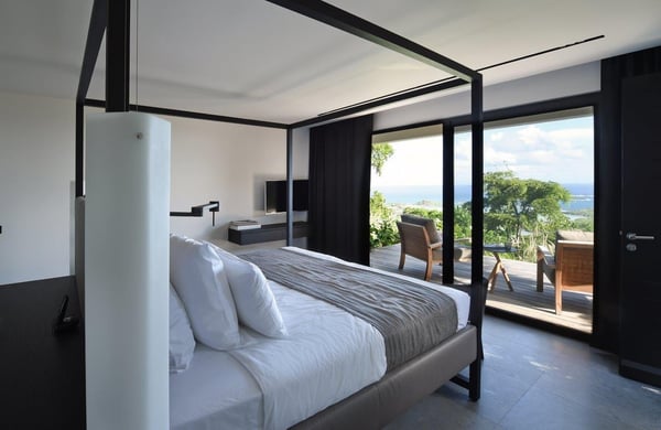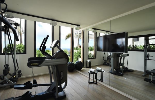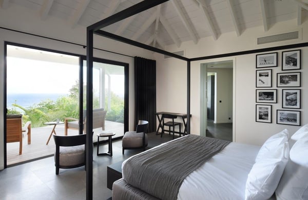 Tucked into the hills of the lovely and pristine area of Dévé, the magnificent luxury villa Belle Étoile is a contemporary and stylish vacation rental property in St-Barths, with a 28-meter pool overlooking a breathtaking panoramic view. With its 5 bedrooms and cozy spaces, Belle Étoile is one of the top vacation villas in St. Barths, and the ideal setting for holidays with friends or family. Recently built by a famous local architect, the entrance of the rental property is surrounded by palm trees in a lush tropical garden. The main level of the villa welcomes you with its panoramic and dramatic view over the bays of Grand-Cul-de-Sac and Toiny. The open and airy spaces allow you to enjoy the scenery from every spot of the villa; you can relax in the air-conditioned living room on the sumptuous sofas covered with cushions facing large openings onto the ocean and the vegetation. In the contemporary decoration, you will enjoy a pleasant feeling of privacy and well-being. The well-equipped gourmet kitchen with an oversized island is perfect for preparing delicious meals or calling upon a private chef for exclusive gastronomic menus. for wonderful moments around the indoor dining room table that can accommodate up to ten guests, facing the ocean. On the terrace, a 28-meter-long heated infinity swimming pool invites you to swim endlessly, facing the unforgettable blue horizon. A resting bed is under a gazebo, seeming to be floating on the surface of the pool, the most idyllic place of Belle Étoile for relaxing. On the covered terrace, a suspended bed faces the ocean, close to the most comfortable deck chairs. The vacation rental property Belle Étoile consists of five air-conditioned bedrooms with private terraces and en-suite bathrooms. Three of them are located on the main level, while two suites are on the lower one. Four of them are in a separate building, two of which are connected, and the fifth occupies its own bungalow apart from the main house, next to the living room. The black and white decor gives this luxury vacation rental home a refined elegance that will make your stay an unforgettable souvenir of St. Barths. For sports lovers, an equipped fitness room is available with a splendid view over the ocean and the lush vegetation.