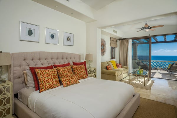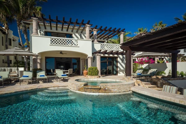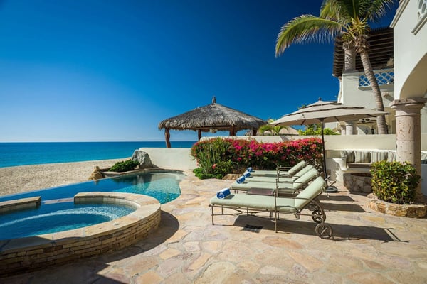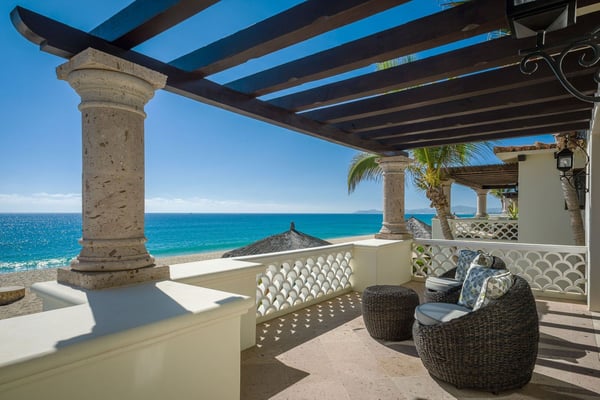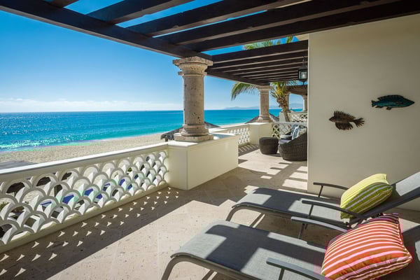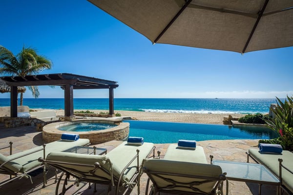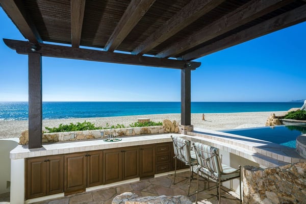 A gracious beachfront setting delivers stunning ocean views and upscale delights at Casa Cielo. The sweeping natural beauty of Cabo San Lucas comes alive, as guests wake up to the dazzling beachfront and the sparkling blue water of the Sea of Cortez. The property may sit mere steps from the sand and water, but it also presents the enjoyment of a luxury lifestyle in El Encanto. A true focus of the property is the private infinity edge pool and Jacuzzi overlooking the sand beach, with plenty of room for outdoor lounge chairs and shaded dining space. Spend your afternoons out on the sand or in the water, then relax the evening away by the fire pit as the sun sets over your own private slice of paradise. Easily blending indoor and outdoor space, most rooms in the home look out over the sand and water, with oversized sliding glass doors leading out from the comfortable living room and indoor dining room. Supplemented by the mostly neutral decor and finishes, the home instead puts the focus on the brilliant surroundings. Dual master suites on the upper level open up to more ocean views from a second-floor terrace, while two more bedrooms downstairs provide additional space for guests, including one detached bedroom with its own private access. As part of a gated community, the property also offers complimentary access to the gym and beach club, with a grand swimming pool and more space for lounging and dining while enjoying unmatched ocean views.