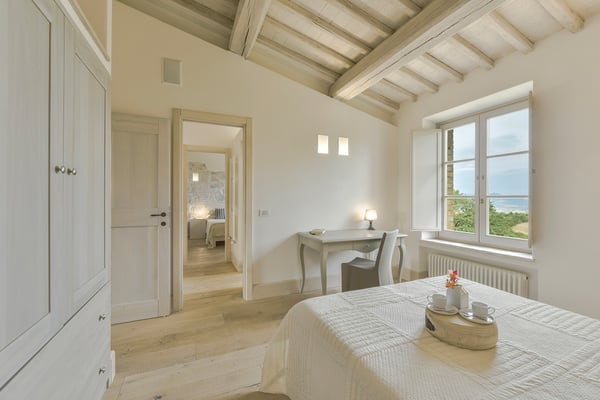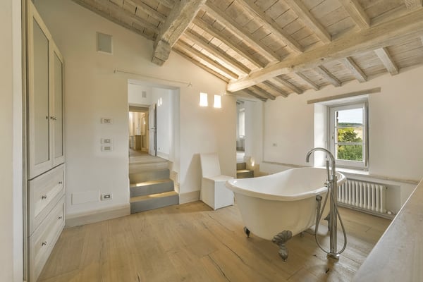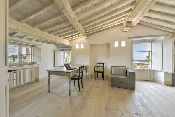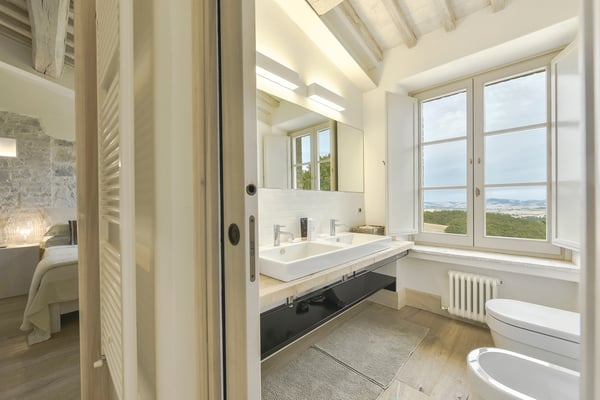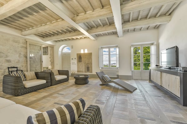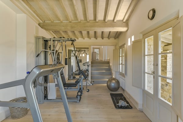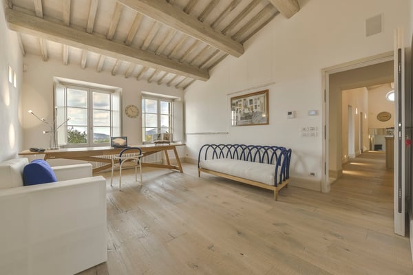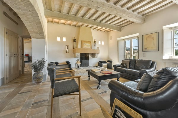 This two-level luxury villa is one of the most unique and stunning homes in this area. Set atop a hill, this elegant contemporary property dominates the surroundings and offers dramatic panoramas of the rolling Tuscan Hills. An exquisite selection of custom-made furniture and extraordinary artisanal finishing are evident throughout the house, from the ample airy social rooms to each of the bright seven bedrooms; an impressive list of luxurious amenities make this villa a superb choice for first-class vacation retreats. The recent meticulous restoration brought this property back to its authentic character with an eye on modern sophistication through high-quality materials, attentive detailing, and a soothing colour palette. The custom-built private wellness area includes an indoor swimming pool with a counter-current swimming system, a steam room, a sauna, a shower, and a fully equipped gym. These features make the villa an ideal retreat also in the colder months.