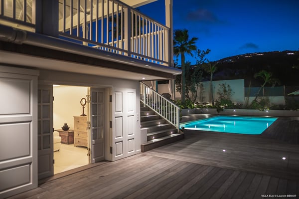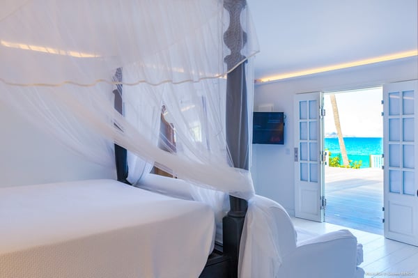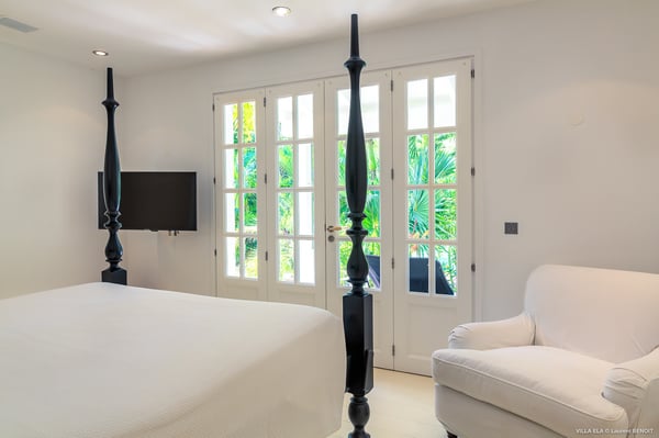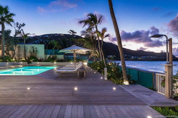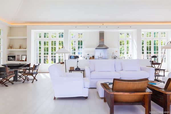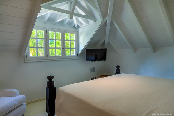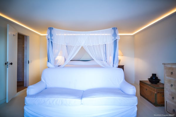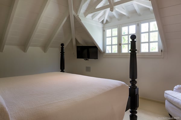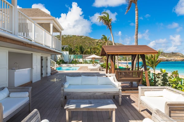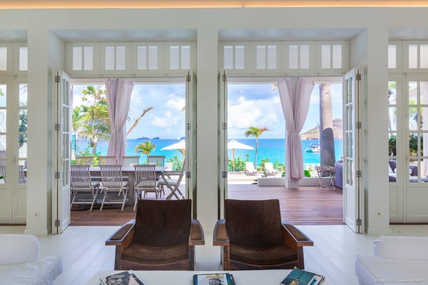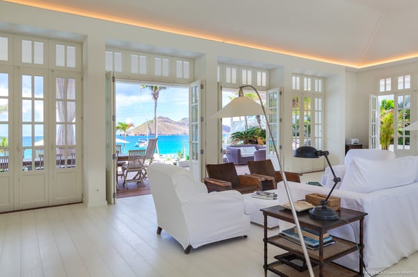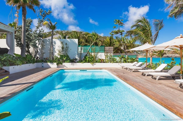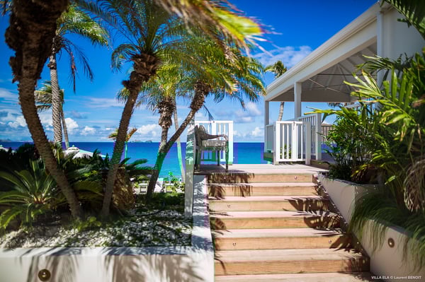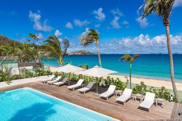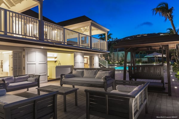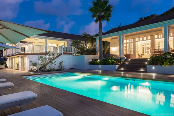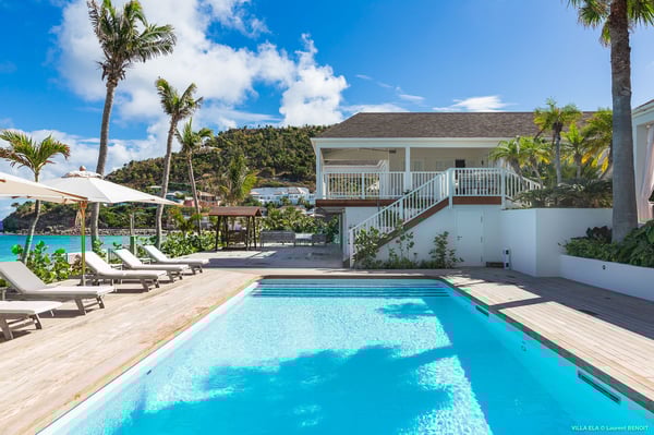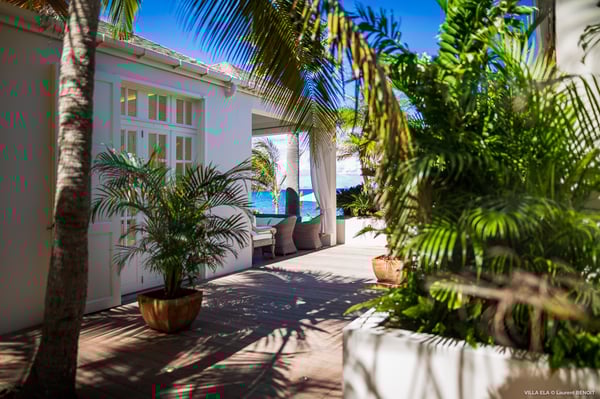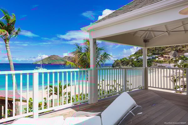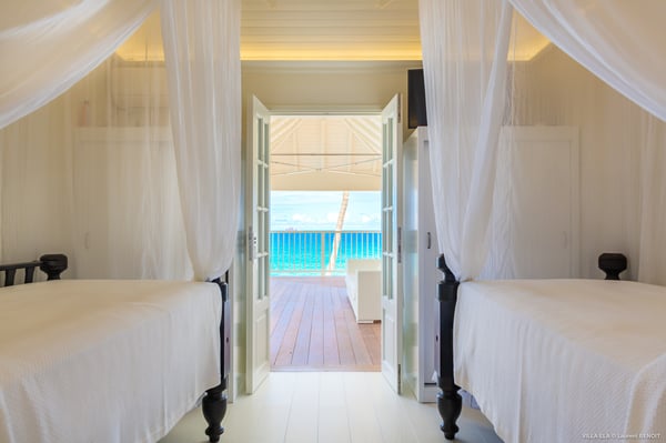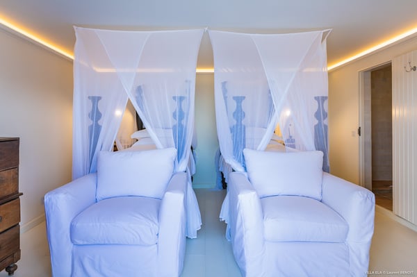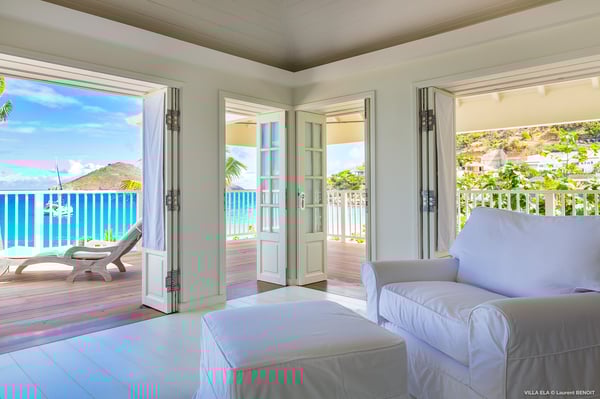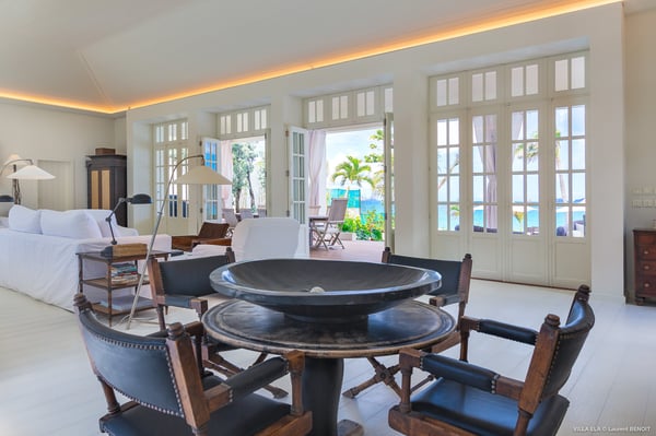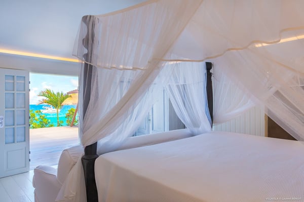 The magnificent vacation rental villa Ela is a luxury property located on the famous Flamands Beach in St-Barths. Coming with eight bedrooms and amazing ocean views, it is the perfect spot for a large family or group of friends wishing to share a beachfront villa in the Caribbean. Villa Ela was designed in a Caribbean style, blending the local architecture in multiple pavilions with a decor of white fabrics, dark and light wood floors and mahogany. This is one of the spacious beachfront properties in St-Barths that offer a subtle blend of modernity and authenticity, while always creating a peaceful and soothing atmosphere in every part of the house. In the main central building, the large air-conditioned living room is a pure delight, with white parquet floors, a white sofa and armchairs, under a superb high whitewashed vaulted ceiling. In the elegant and beguiling great room, time seems to pass more slowly. In the back, the modern kitchen is well-equipped for self-catering or private chef services. Open on three sides to the ocean breezes, this refined living room has an amazing view over the ocean and the magnetic Flamands beach. At the front, a beautiful two-level terrace faces the breathtaking view. There are large teak sofas, outdoor dining and a beautiful and azure-coloured heated pool for delightful outdoor moments. A covered swing and deck chairs are shaded by generous umbrellas. On the lower level, remote-controlled awnings provide additional shade. You can go to the beach a few steps from the terrace. Utmost luxury in St-Barths, there is also a private tennis court near the villa's garden. The elegance of this luxurious holiday rental villa in Saint Barth Ela is also in the decor of its eight air-conditioned suites. Four bedrooms are located in a separate, two-floor building, across the terrace from the main pavilion. They all have large mahogany beds, except for one suite with twin beds, and each bedroom has a terrace, an en-suite bathroom and spectacular ocean views. The other four rooms are located in a two-story guest house with its own living and kitchen areas. They all have a black mahogany four-poster bed and en-suite bathrooms. On the beachfront, materials and colours create a beautiful harmony between the traditional and the modern ways, making this fantastic St-Barts holiday home a true island gem.