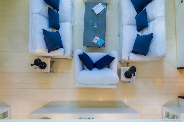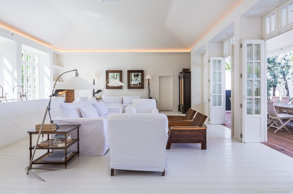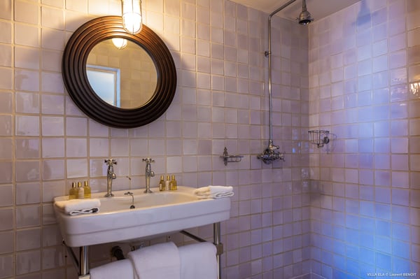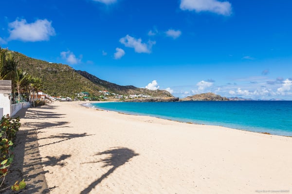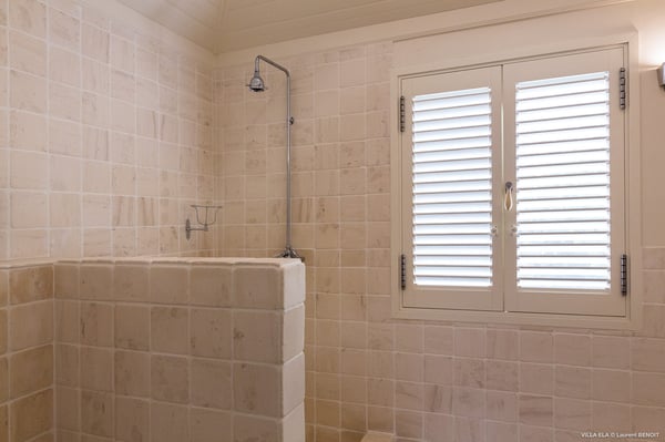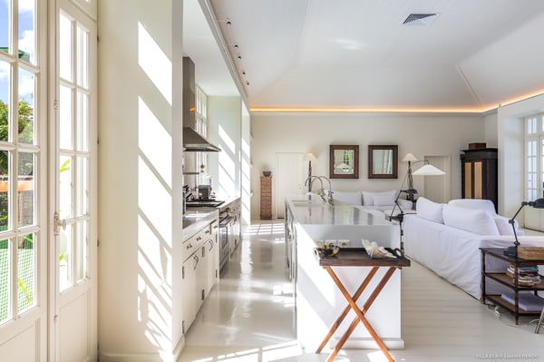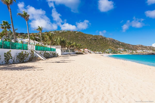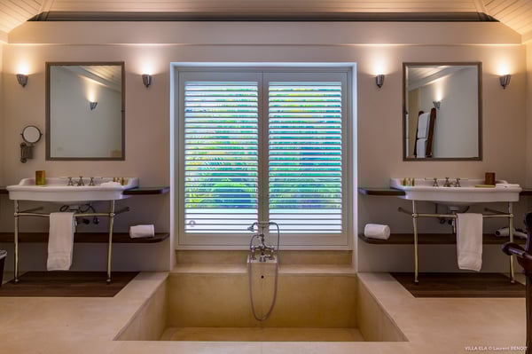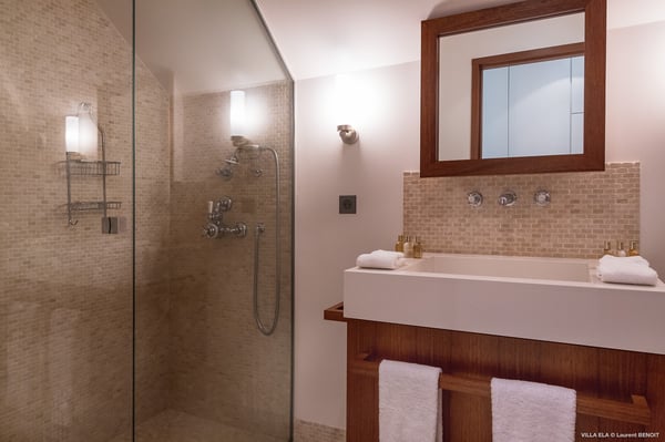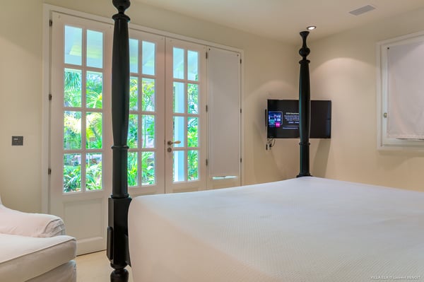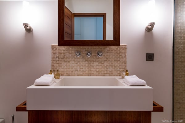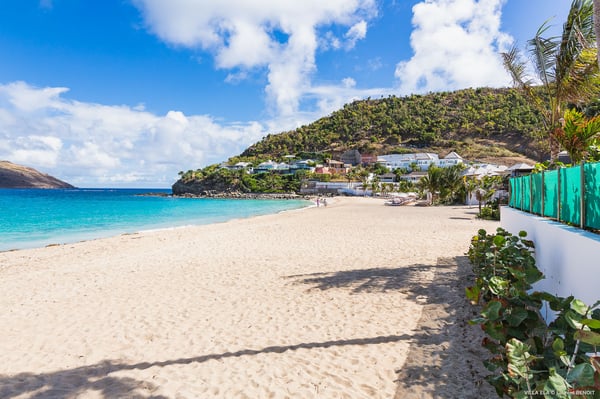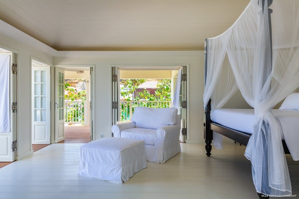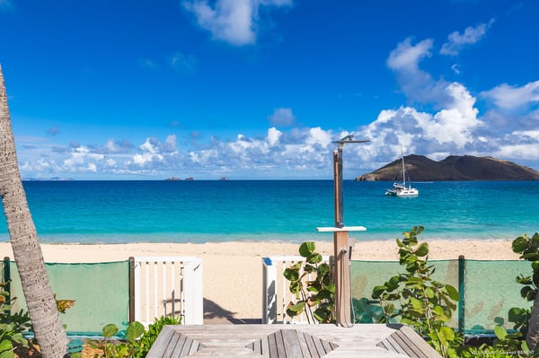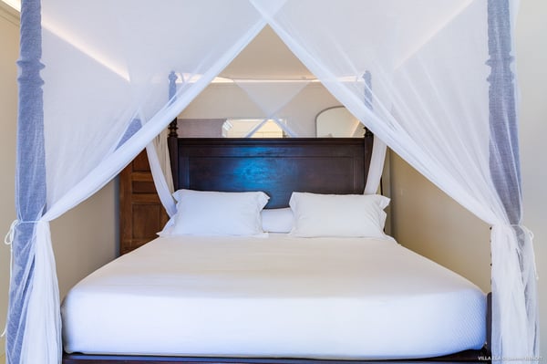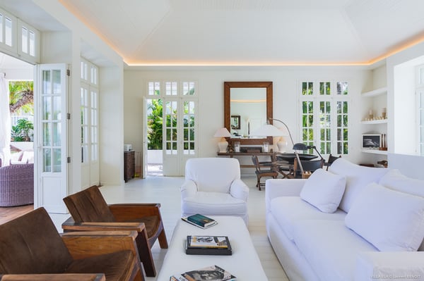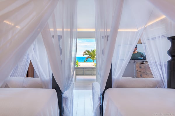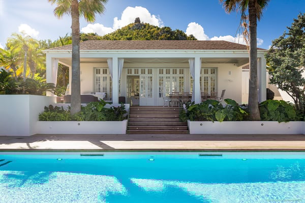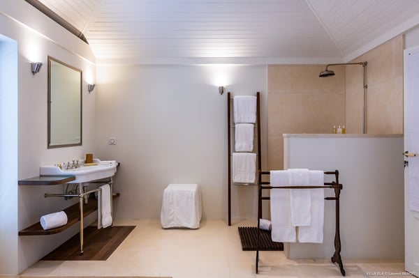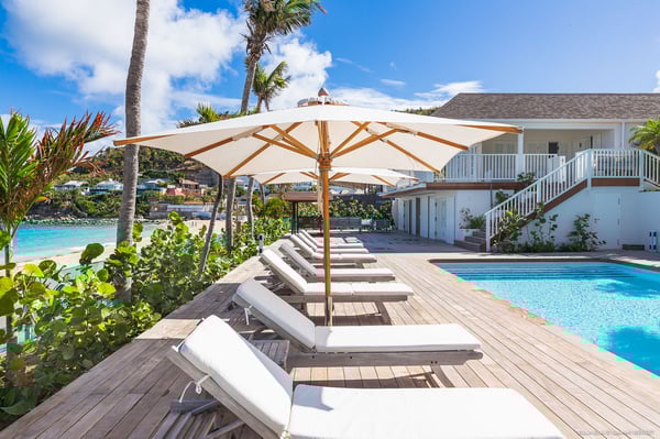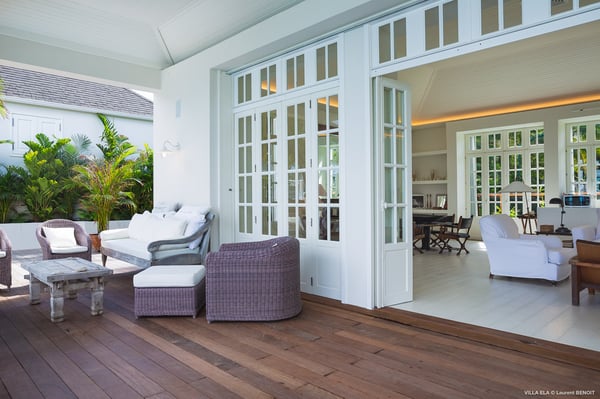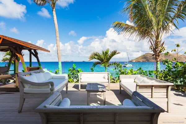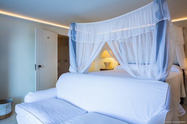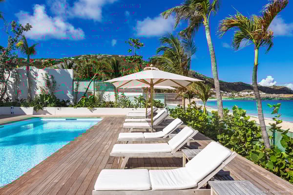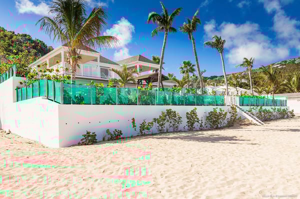 The magnificent vacation rental villa Ela is a luxury property located on the famous Flamands Beach in St-Barths. Coming with eight bedrooms and amazing ocean views, it is the perfect spot for a large family or group of friends wishing to share a beachfront villa in the Caribbean. Villa Ela was designed in a Caribbean style, blending the local architecture in multiple pavilions with a decor of white fabrics, dark and light wood floors and mahogany. This is one of the spacious beachfront properties in St-Barths that offer a subtle blend of modernity and authenticity, while always creating a peaceful and soothing atmosphere in every part of the house. In the main central building, the large air-conditioned living room is a pure delight, with white parquet floors, a white sofa and armchairs, under a superb high whitewashed vaulted ceiling. In the elegant and beguiling great room, time seems to pass more slowly. In the back, the modern kitchen is well-equipped for self-catering or private chef services. Open on three sides to the ocean breezes, this refined living room has an amazing view over the ocean and the magnetic Flamands beach. At the front, a beautiful two-level terrace faces the breathtaking view. There are large teak sofas, outdoor dining and a beautiful and azure-coloured heated pool for delightful outdoor moments. A covered swing and deck chairs are shaded by generous umbrellas. On the lower level, remote-controlled awnings provide additional shade. You can go to the beach a few steps from the terrace. Utmost luxury in St-Barths, there is also a private tennis court near the villa's garden. The elegance of this luxurious holiday rental villa in Saint Barth Ela is also in the decor of its eight air-conditioned suites. Four bedrooms are located in a separate, two-floor building, across the terrace from the main pavilion. They all have large mahogany beds, except for one suite with twin beds, and each bedroom has a terrace, an en-suite bathroom and spectacular ocean views. The other four rooms are located in a two-story guest house with its own living and kitchen areas. They all have a black mahogany four-poster bed and en-suite bathrooms. On the beachfront, materials and colours create a beautiful harmony between the traditional and the modern ways, making this fantastic St-Barts holiday home a true island gem.