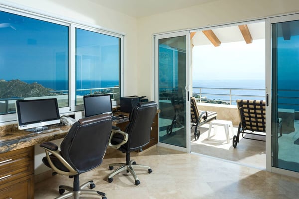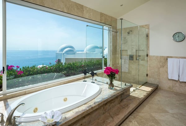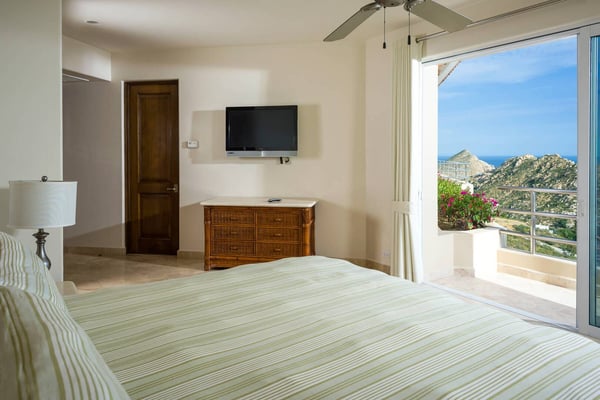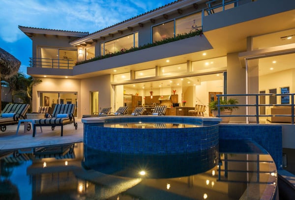 With vistas that span from the azure Sea of Cortez over to the mighty Pacific Ocean, Villa del Mar (House of the Sea) showcases the amazing natural beauty of Los Cabos. A thoroughly modern home, Villa del Mar's contemporary architectural design complements the chic interior decor. Creamy Travertine flooring, exquisite granite countertops, and rich wood furnishings add touches of elegance to the villa. Each one an oasis of calm, the bedroom suites feature fine linens, stylish decor, luxurious en-suite baths, and amazing ocean views. The amenities at Villa del Mar are simply unparalleled. They include an office with all the necessities: internet, computer, phone, and fax; an entertainment room with a TV, surround sound, and deluxe loungers; a fitness suite with top-of-the-line exercise equipment, a beautiful cedar sauna, and a separate commercial elevator. Ideal for large groups, Villa del Mar has a spacious and comfortable living and dining area with floor-to-ceiling windows that frame the beautiful seascape beyond. A massive recessed glass door connects the gourmet kitchen with the glamorous pool deck perfect for transforming an indoor soiree into an outdoor fiesta! The ideal luxury playground, Villa del Mars outdoor deck includes a palapa shade, plush lounge beds, bar and grill areas, and a stunning waterfall that flows into the grand infinity pool all overlooking endless ocean vistas.