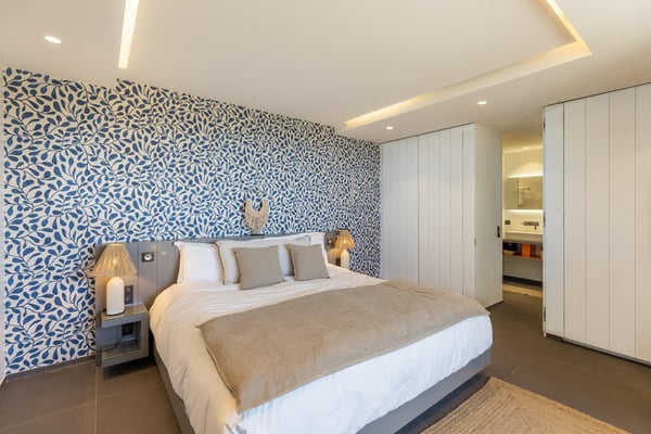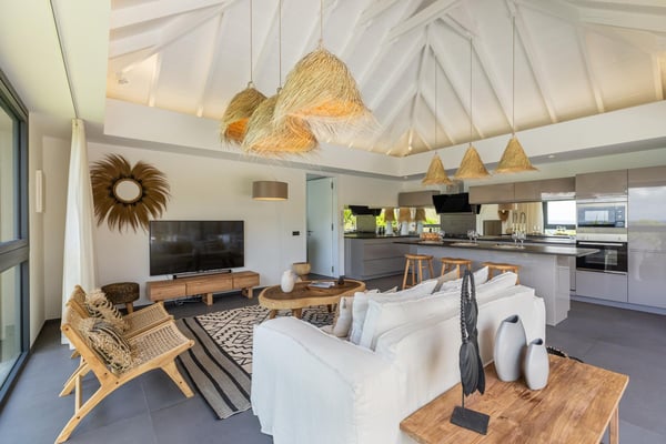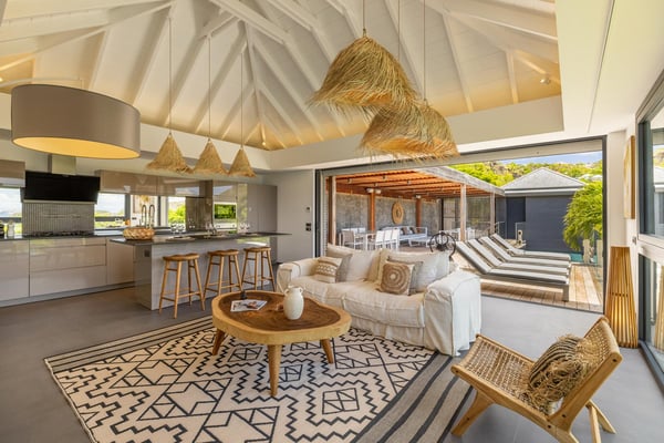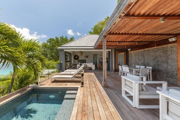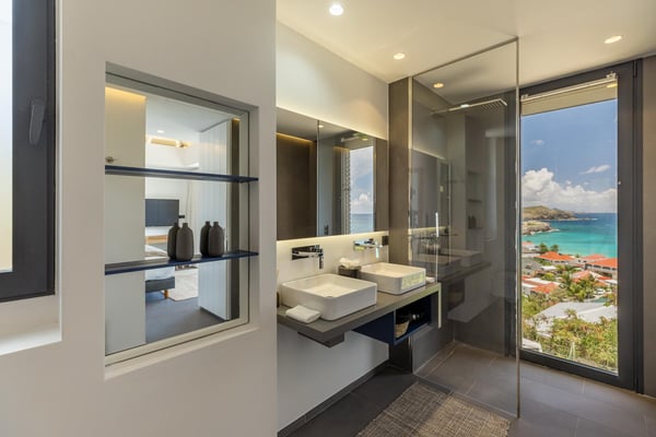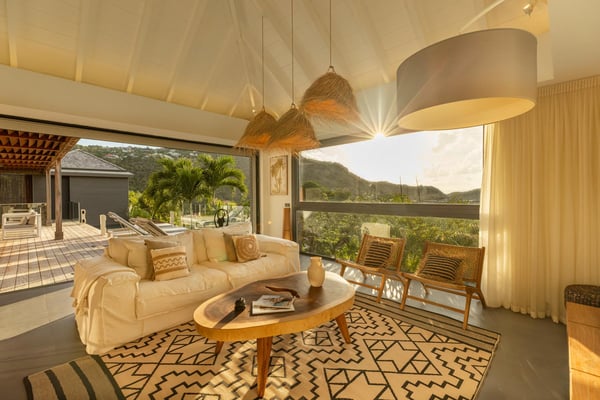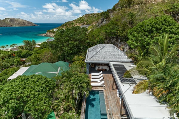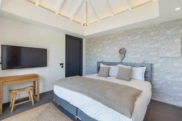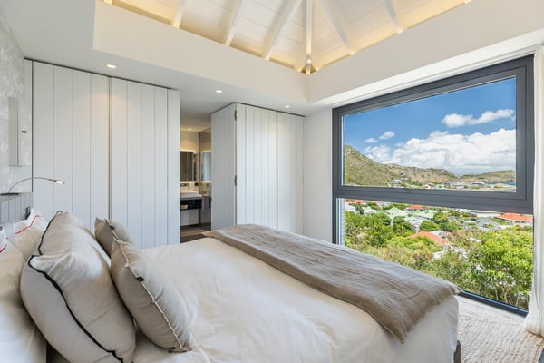 Nearby construction may result in noise disturbances. For further details on how this might affect your stay, please reach out to a villa specialist. Construction is expected to continue through mid-May 2026 Located on the heights of Flamands, Santa Alicia is a beautiful property which opens onto a fantastic view over the ocean and the islands of Saint Martin and Anguilla. Very functional and decorated with refinement, this three-bedroom house is the perfect place for a wonderful stay with family or friends in St Barths. Built over a main pavilion and a separate bungalow, Santa Alicia offers a magnificent view over the bay of Flamands. The bright, air-conditioned living room is well furnished with two large sofas facing a flat-screen TV and a large bay window above the breathtakingly beautiful panorama, and opens onto the spacious terrace. In the evening, the many lights create a cozy and warm atmosphere, an ideal setup for relaxing and enjoying the beauty of the island. The kitchen with a central island is well equipped to cook meals in a minimal ambience. Under the high white vaulted ceiling, you’ll feel quiet and serene while watching the magnificent view as the gentle trade winds blow through the windows. On the terrace, you’ll be delighted to enjoy the beauty of the environment. In front of the stunningly beautiful view, the covered area houses a lovely outdoor dining area ideal for pleasant al fresco dinners. On the wooden deck, there are lounge chairs with cushions for reading or sunbathing sessions after swimming in the heated pool. Palm trees and rolling hills make up this idyllic picture, in front of the deep blue ocean horizon. Santa Alicia consists of three air-conditioned bedrooms with splendid ocean views. Two of them are in the main building on two different levels, while the third one is in a separate pavilion for utmost privacy. They all have a king bed, TV and en-suite bathroom, one bedroom even has an outdoor shower. Purple, taupe, blue: the colours are deep and create a very private atmosphere that you will love in the evening after beautiful days under the island’s sun. Comfortable and most refined, Santa Alicia is your dream home in the heart of the Caribbean, for an unforgettable stay with family or friends.