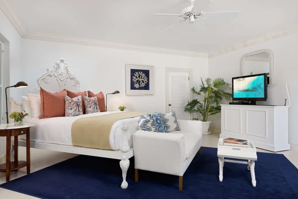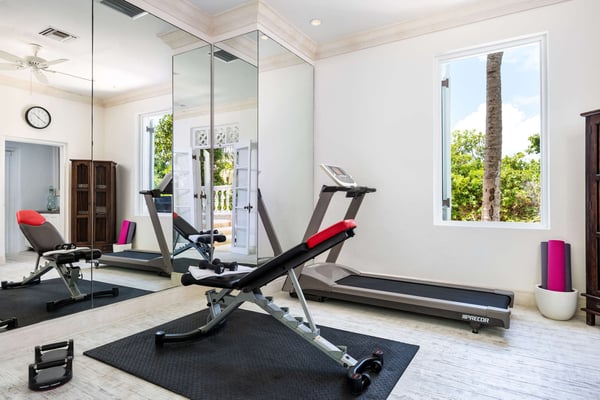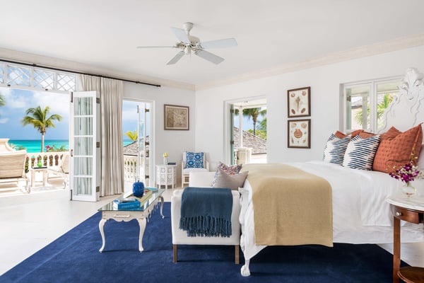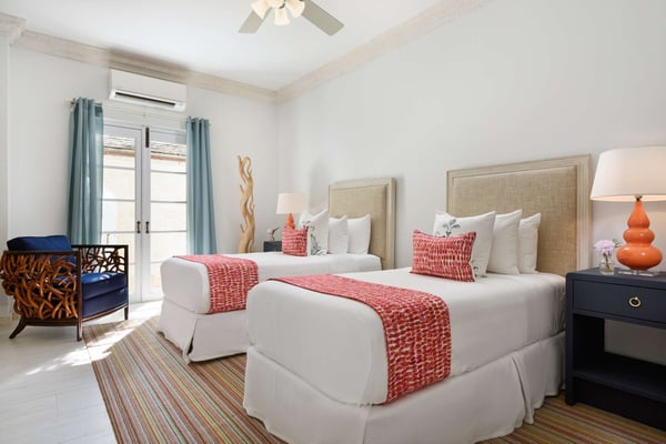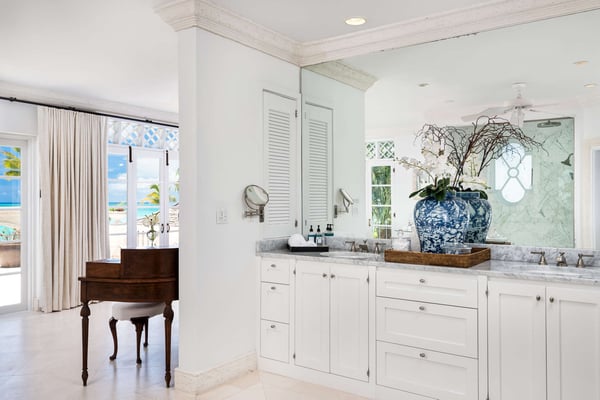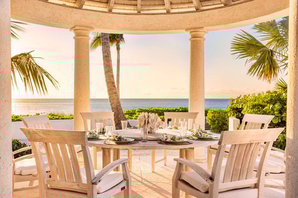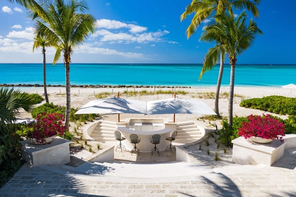 Colonial-style elegance and contemporary comforts combine in this gracious beachfront mansion. Inspired by Oliver Messel designs, Coral House, an exquisite home on the shores of Grace Bay, cannot fail to enchant with its pink-hued coral stone walls, plant-filled courtyard and breezy verandas. With seven-bedroom suites, a variety of gorgeous gathering spaces indoors and out, and professional staff to attend to your every need, it’s an ideal property for multi-generational groups. Between the heated pool surrounded by loungers, the pristine beach with decadent daybeds set back from the shore, and the complimentary kayaks and SUPs, turquoise waters play a leading role at the Coral House. When you tire of the sun, move over to the gazebo to watch the action on the beach, or take a pew at the beach bar and admire the views while your butler mixes you a cocktail. With an outdoor dining pergola and a firepit that the whole group can gather around to star watch, there’s ample space to eat, drink and relax outdoors, as a group or individually. Arranged around the romantic courtyard, with a vibrant flame tree at its centre, there are just as many enticing indoor gathering spots, with a living room, an attached outdoor sitting area, a welcoming library and a cozy media and games room. Also on the first level is the kitchen with a large island – ideal for pulling up a stool and chatting to your chef – a dining room where you can throw open the French doors to let the breeze wash through, a fitness room and one twin/king bedroom. The remaining bedroom suites, all spacious and decorated in fresh tones, are on the second level. Three of these have private patios and ocean views, two can be set up with king or twin beds, and two have queen-sized beds.