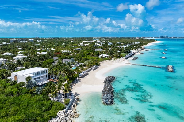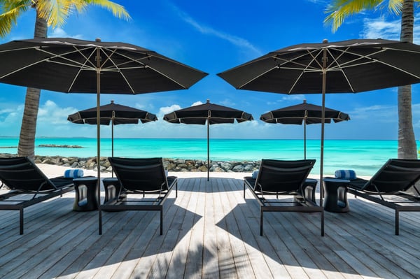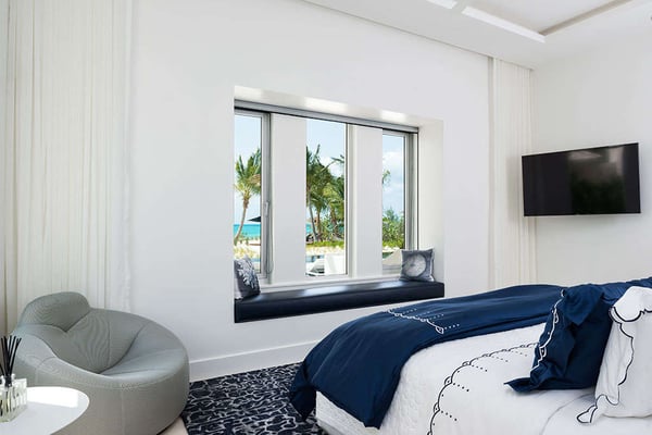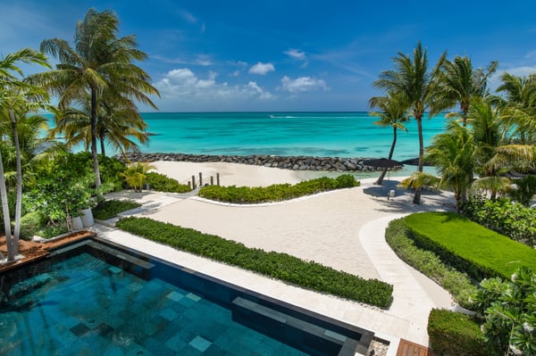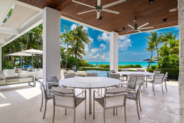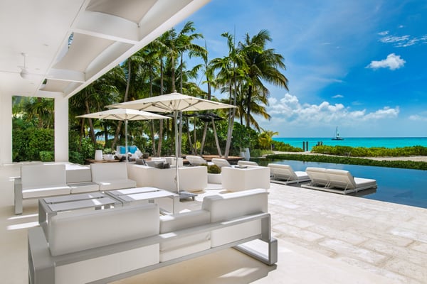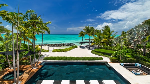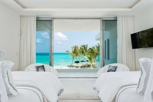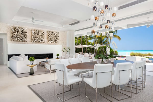 An irresistible fusion of sleek, contemporary architecture and enchanting outdoor spaces, designed to be savoured with friends and family. With fully pocketing glass doors that open the cool, white living space to the vivid views of Grace Bay beach, Villa Awa is a triumph of indoor-outdoor design. The lava stone-tiled negative edge pool, with loungers that appear to float on its inky surface, is the focal point of the exterior space. A cluster of armchairs and a hot tub shaded by coconut palms to one side invite daytime relaxation, and sunken fireside seating on the other is perfect for after-dinner drinks. Follow the winding flagstone path to discover a beach deck lined with sun beds and hammocks screened by swaying palms. Multiple shaded dining and lounging areas mean the majority of one’s time is likely to be spent revelling in the gentle breezes and warm sunshine. Clean lines and fresh tones dominate indoors, with natural stone, wood and metallic accents lending warmth and glamour to the shared spaces. An open-concept dining and living space frames exquisite views of sugar-white sand with an impossibly blue sea, and provides ample space to gather indoors. A playfully decorated media room gives younger guests an independent space, while for adults, a restful massage room awaits. Villa Awa features six bedrooms with ultra-modern ensuite bathrooms. The upper level features one principal suite with a king-size bed, outdoor shower and a private terrace plus three guest suites, each with two queen-size beds and sea-view balconies. A second principal suite and a further guest suite are situated on the lower level. With non-motorized water sports provided and a full staff, including a butler, chef and housekeeper, Villa Awa cannot fail to impress.