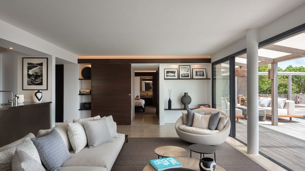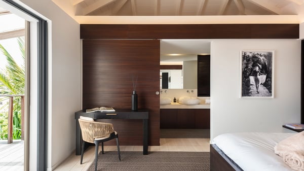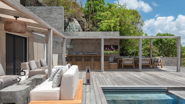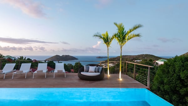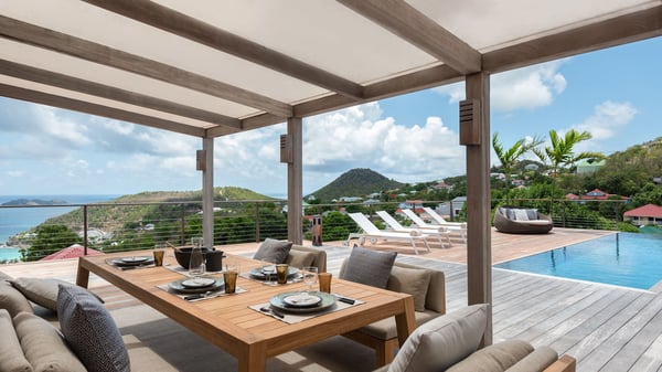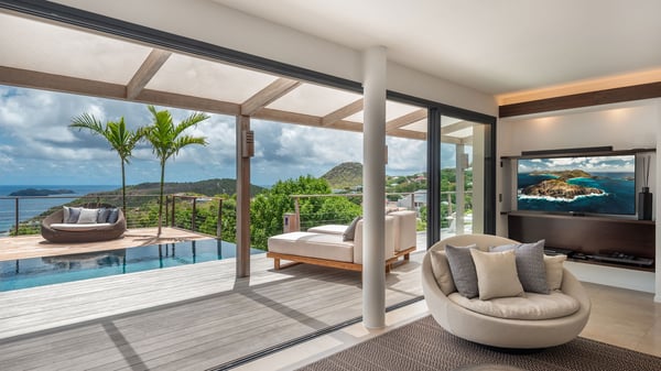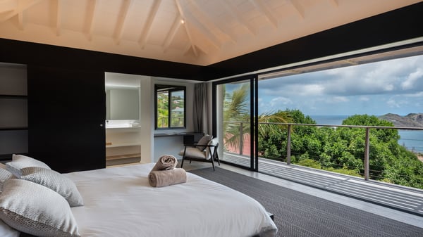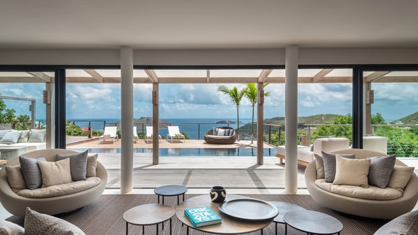 Located near Flamands and Saint-Jean, the luxurious villa The One is a splendid property in front of the ocean and the Bonhomme and Frégate islands. In a paradise setting of green hills, this three-bedroom vacation home is both elegant and refined, a perfect place for an unforgettable stay in Saint-Barth. Recently renovated, the vacation rental The One welcomes guests in bright spaces with contemporary decor and clean lines. The large living room opens entirely onto the terrace with a fantastic view over the ocean. Itis furnished with large armchairs with curved lines as well as a deep sofa for relaxation. The well-equipped kitchen is located at the back of this beautiful open space where the trade winds gently blow and bring a pleasant feeling of well-being. Wall frames, black and white photographs, woven rugs, cozy cushions and refined decorative objects create a peaceful atmosphere you will enjoy immersing yourself in, as time seems to be suspended. On the terrace, a beautiful alfresco dining room which can accommodate up to six guests is set up under the covered area for delightful dinners in the gentle Caribbean air. There is also a pleasant outdoor lounge, the perfect place to sip a drink or have a chat in the mild air of Saint-Barth. At the front, there is a splendid swimming pool in front of the ocean view, surrounded by lounge chairs perfect for sunbathing, reading or relaxation sessions. The tropical vegetation of the hills provides a lovely green touch to this enchanting setting, between tall palm trees and local shrubs. The luxury villa The One offers three beautiful air-conditioned bedrooms with ocean views and en-suite bathrooms. They feature king-size beds and office areas in a very refined decor. Two bedrooms are located on either side of the living room and open onto the terrace with pool, while the third one has a private balcony with a breathtaking view over the blue waters of St. Barth. Exclusive and very private, the vacation rental THE ONE is the perfect place for an unforgettable interlude with family or friends in the heart of the Caribbean.