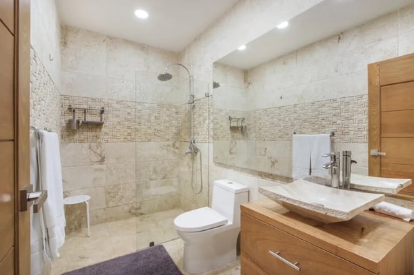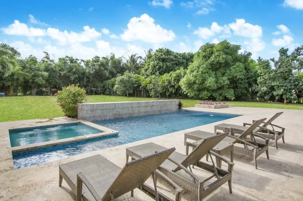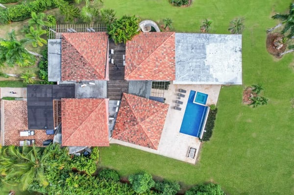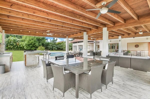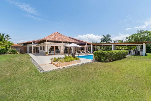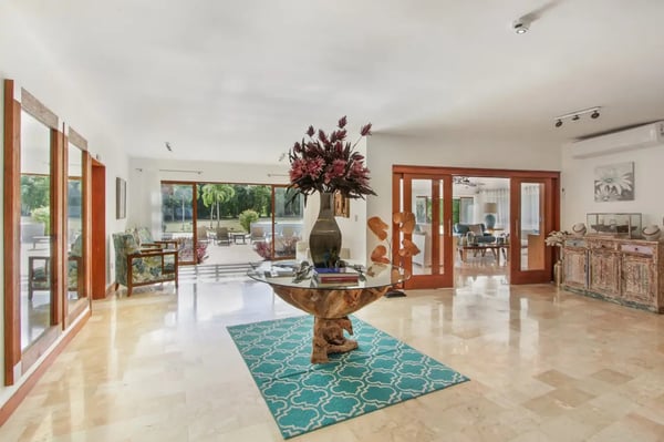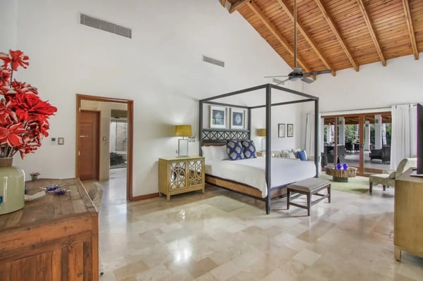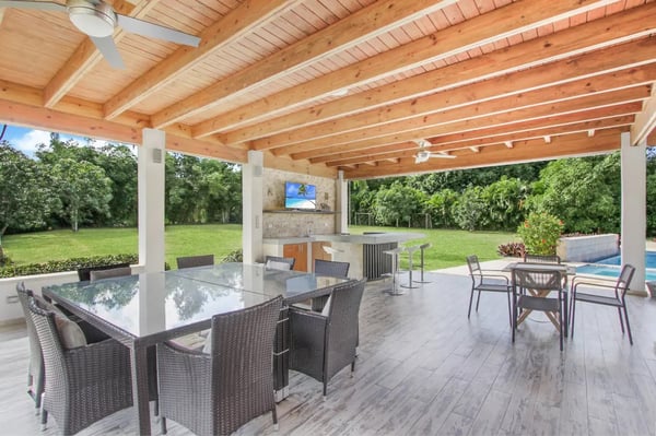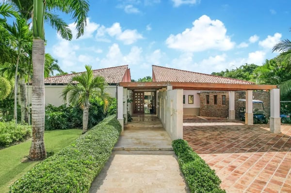 All guests must register with the Casa de Campo Concierge office, and for a small daily fee ($30 per adult per night & $15 per child per night), are granted access to resort areas and amenities. Casa de Campo Resort facilities and amenities include golf courses ($), the fitness centre ($), racquet center ($), restaurants ($) and bars ($). Contact Rental Escapes for more information about pricing. Tropical Paradise is a luxurious 5-bedroom, 5 1/2 bath, single-level villa, which makes it very convenient for multi-generational families of all ages. Step into the villa and find yourself in the beautiful entrance hall that connects the entire house. The grand living room has high, vaulted ceilings with ceiling fans and a beautiful chandelier, double sofa sitting area, custom built-in furniture and TV. Open the big sliding windows, which give you direct access to the outdoor pool area. The villa has a great outdoor, covered living- and dining area with a bar (beverages are not included), TV, games, and a unique Japanese teppanyaki (hibachi) grill (food is not included). This is a great “entertainment zone” where you can have so much fun spending the best time together with your family & friends. The formal indoor dining room is an elegant space with a unique chandelier and a spectacular dining table that seats 12 people comfortably on plush dining chairs. This is the perfect place to host your formal dinners. The covered, outdoor terrace also has a dining table if you prefer to dine more casually. A spacious kitchen with island and marble countertops comes fully equipped with everything you need to cook delicious meals during your vacation – AND your villa rental includes a chef, so you don’t have to worry about cooking (food & beverages are not included)! Enjoy a private swimming pool & Jacuzzi with a large pool deck and furnished terrace, huge private backyard with a big lawn area. If you are traveling with children, they’ll love playing in this backyard. The villa is furnished with contemporary furniture, unique décor pieces and artwork. Enjoy this private oasis, spend your days in and around the pool and soak up the sun by the pool. This is your dream vacation…