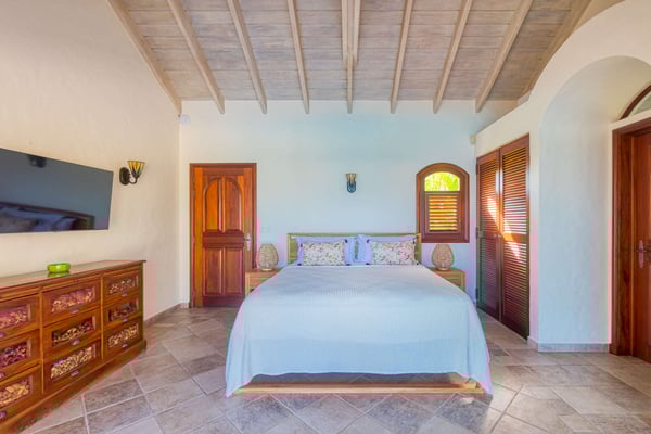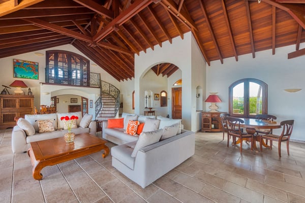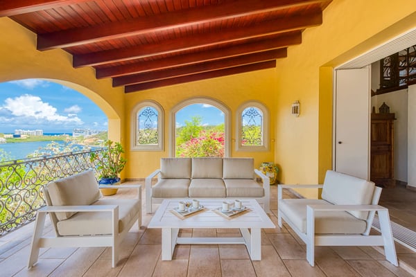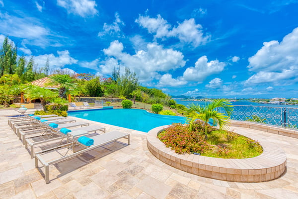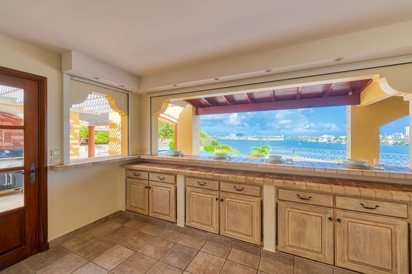 This beautiful residence has all the modern amenities and features over 5,000 square feet (500 square metres) of luxurious interiors, including four bedrooms and four and a half bathrooms, a large living room, a media room, an office, and a fully equipped kitchen. Extensive terraces surround the large 50' by 30' (15m by 10m) infinity pool and Jacuzzi, and a poolside gazebo area provides ample space for shaded outdoor dining and lounging. All four bedrooms feature large ensuite baths with showers, and two are part of a primary suite which includes a private outdoor terrace and a large outdoor Jacuzzi tub on a deck overlooking the lagoon. The remaining two bedrooms are located on the opposite side of the house, facing the infinity pool and overlooking the lagoon with views of Saba in the distance. Each of these two independent bedrooms has its own full bath and can be accessed by guests from either the poolside or the gated driveway carport arrival area. An additional one-bedroom, one-bath unit is located on a lower level below the pool. The property also features a boat dock for access to the Simpson Bay lagoon. The Lowlands are the location of some spectacular beaches: Baie Longue and Baie aux Prunes (Long Beach and Plum Beach) are secluded, have public parking, but no services. Neither beach is ever crowded. Baie Rouge is set amongst some dramatic red cliffs. The elegant homes in Terres Basses are sitting on generous lots, most of them with gorgeous views of either the Lagoon or the ocean, or both. By car it's about 10 minutes away from Marigot, and 15 minutes away from the Airport.