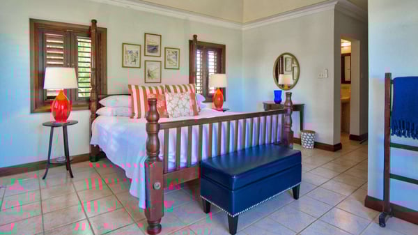 Selah is a lush four-bedroom villa located in Runaway Bay. It sits on the sea where the waves gently break on shallow reefs and roll in, providing their own music. The beach is one mile of white sand for sunbathing, strolling, and swimming. Selah is situated on the edge of a nature reserve, hundreds of years old, which is home to doves and local bird life. The villa is furnished in British Colonial tradition with rich mahogany and luxurious fabrics. The living room and dining room areas open onto a large covered verandah and then to the pool and beach. The upstairs living room gives an additional, more private seating area. This common area also has a computer, internet, and fax. The villa is located on its own fantastic, private, white sand beach (220 feet) with excellent swimming. The pool is fresh water and 40 x 40 ft. The villa has an excellent lighted tennis court and two kayaks for your enjoyment. See additional exterior photographs. The four spacious bedrooms are beautifully furnished, and all have spectacular ocean views. Each bedroom has air-conditioning, ceiling fans, a balcony, and private bathroom.
