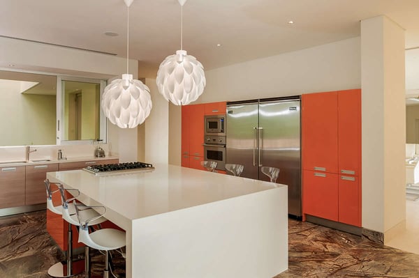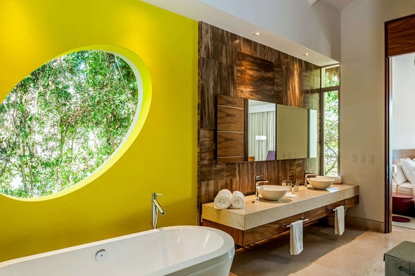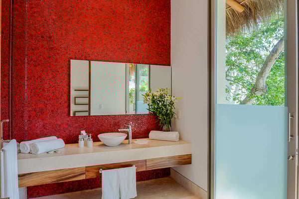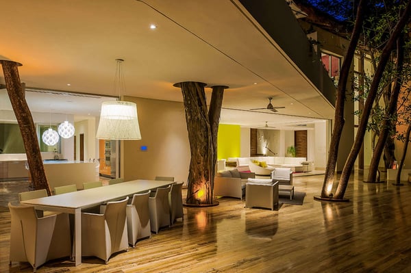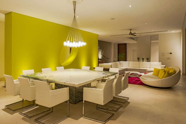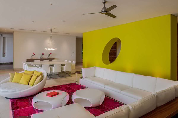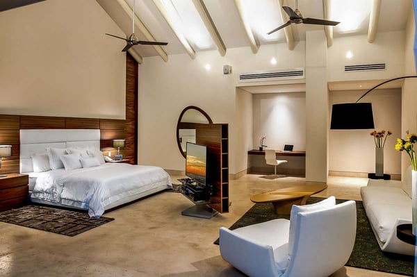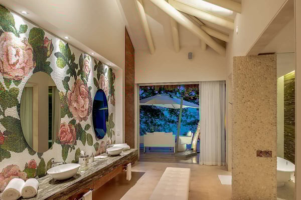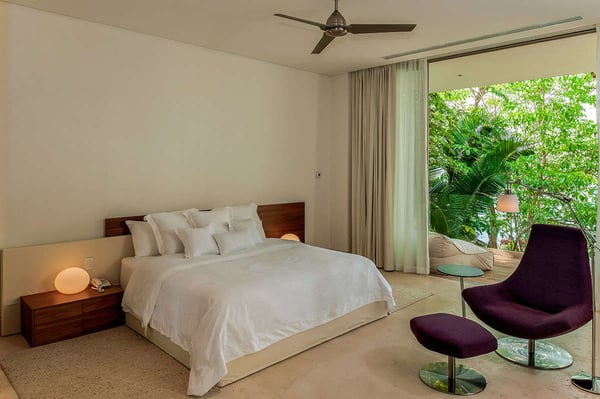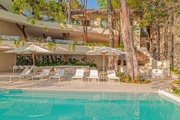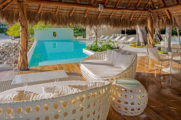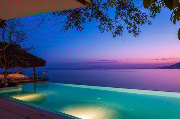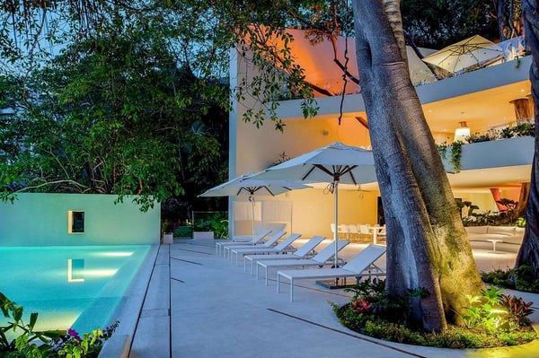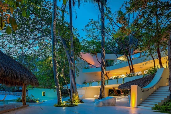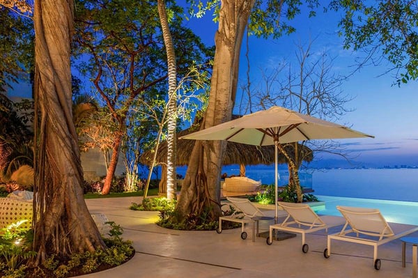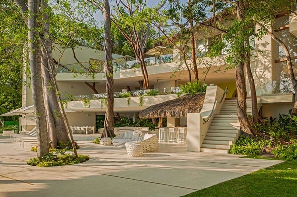 The 13,000-square-foot oceanfront home has five bedrooms, a sleek contemporary style, and indoor living spaces that seamlessly transition to outdoor terraces. Its location on the El Paredon Resort on Banderas Bay means guests have access to the resort's amenities, plus perks like a daily maid and cook service. The back of the house features three floors looking over the private pool and beach, with plenty of room for sunbathing, dining and even grilling on the barbecue. Refresh yourself in the outdoor shower and private spa, work out in the exercise room and stay comfortable in the in-room air conditioning. Casa Papelillos is a unique mix of sleek contemporary furnishings and natural features. Trees growing through the oceanfront balconies have been left intact, making the open-plan living areas feel as though they've grown out of the landscape. In the living room, clean-lined white seating is cool and modern, while pops of colour like a red carpet and yellow cushions add a whimsical touch. A statement stone dining table has room for twelve, and the fully equipped kitchen has a spacious breakfast bar. Each of the villas five bedrooms has an en-suite bathroom, in-room air conditioning and a ceiling fan. There are two bedrooms with king beds, walk-in closets and ocean views; one has access to a terrace and the other opens to a balcony. A third bedroom has two queen beds, a walk-in closet and a balcony, and the fourth bedroom has a queen bed, double bed, trundle bed, walk-in closet, sitting room and oceanfront balcony. The fifth bedroom has two twin beds, a sitting area, kitchenette and a small terrace. Additional bedding is available in the media room, where you'll find a double Murphy bed. During your stay at El Paredon, you'll have access to the resort's private beach and beach club. It's a one-minute walk to Playa Palmares and less than five miles to both Los Muertos Beach and Olas Altas Beach. From Casa Papelillos, it's one minute to bungee jumping, ten minutes to a supermarket, restaurants, and nightlife, and 29-minutes to the mall. It's about 20-minutes to the Nuevo Vallarta, Mayan Palace, and Flamingos golf courses, five miles to Isla Cuale and just over nine-miles to Puerto Vallarta proper. The international airport is about 11 miles away.