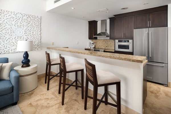 This generous, airy suite with 1968 square feet, ten-foot ceilings and Travertine marble floors feels more like a home than a vacation suite. Upon entry, delightfully open interiors boast a magnificent backdrop of turquoise views through double pocketing, floor-to-ceiling glass doors which open to the patio. Casually elegant British West Indies-inspired décor accents the interiors including the expansive living room, dining area, kitchen and master suite. The living room invites the outdoors inside via sliding glass doors and provides stunning views from a lovely oceanfront terrace to breathtaking water views. The terrace boasts furniture that beckons guests to enjoy Caribbean breezes from their balconies. Granite countertops highlight a thoughtfully appointed gourmet kitchen – complete with dark wood cabinetry and KitchenAid appliances. A glass vessel sink accents the powder room. The master suite features a king pillow-top bed, a spacious, private oceanfront terrace, and an en-suite marble bath with an oversized walk-in shower. The island view guest bedroom has a separate keyed entry from the suite entrance and features either a king, queen or twin pillow-top beds, an en-suite marble bathroom, as well as a convenient kitchenette. The 2 Bedroom Deluxe Oceanfront Suite is located in buildings 1 & 2.