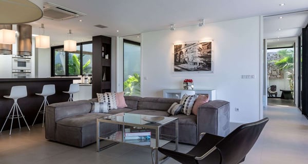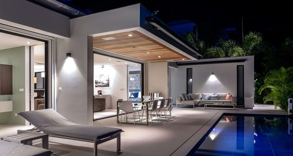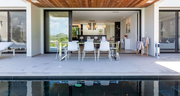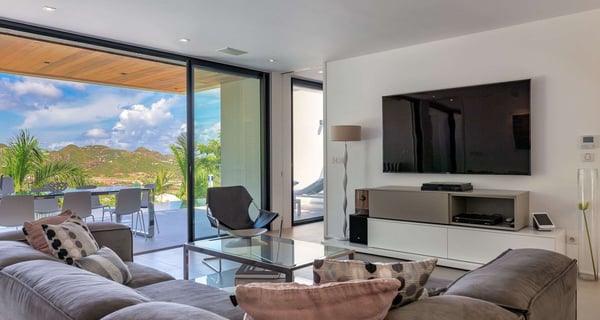 Villa Indyana is a beautiful three-bedroom property with a pool nestled in the lush vegetation of St-Barths. Located in St-Jean, Indyana offers upscale amenities in a modern and sleek decor. With high-end facilities and bright spaces, the villa rental Indyana is the perfect place for an unforgettable stay for six people in St-Barths. Designed in a contemporary style, the vacation rental Indyana welcomes you in a soothing atmosphere with mineral tones ranging from white to charcoal, illuminated by the surrounding palm tree vegetation. Modern and refined, Indyana features a magnificent, air-conditioned lounge with a large sofa facing an HD screen. The open layout leading to the terrace with a pool allows the trade winds to gently breeze through. Behind the living room, you’ll find the fully-equipped kitchen around a bar with stools to talk over a coffee, with white and stainless steel hints in a sleek atmosphere. The light fixtures and the view over the Caribbean hills create a tropical ambiance, gently blown by the sea breeze, perfect to quietly relax. At the front, villa Indyana's terrace opens onto an amazing view over the environment and, in the distance, the bay of St-Jean with the Caribbean translucent waters. The heated swimming pool (9m x 3m) glistens under the sun, near the loungers and the outdoor comfy lounge set up at the end of the terrace. Under the covered area, the al fresco dining room can accommodate up to eight guests for delightful dinners in the mild Caribbean air, in the very private ambiance of this luxury, modern and refined villa. There are palm trees and local shrubs planted over the villa's surroundings, bringing a refreshing charm and a fine poetry, making your stay in St-Barths a timeless moment. The vacation rental Indyana consists of three air-conditioned bedrooms with en-suite bathrooms. Furnished with king-size beds, two of them are located on either side of the living room, and the third one, with a king-size bed convertible into twins, is in an independent studio with a kitchenette. Spacious and comfortable, the bedrooms are true havens of peace, to quietly rest and relax after beautiful days exploring the treasures of St-Barths. Ideally located in St-Jean in an enchanting environment, the vacation rental Indyana is the perfect place for a great getaway with family or friends in St-Barths.
