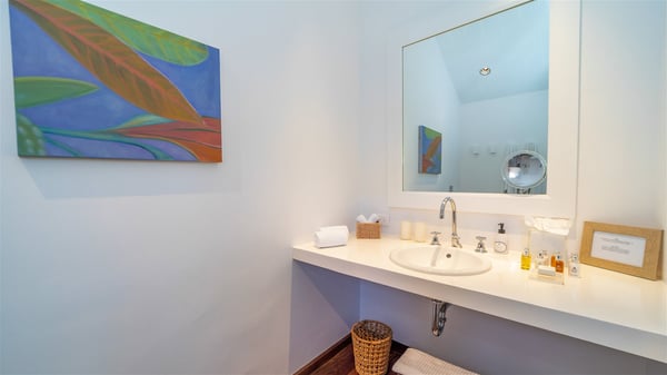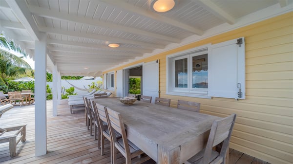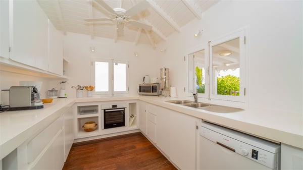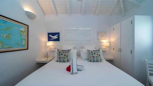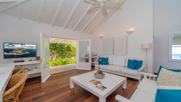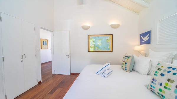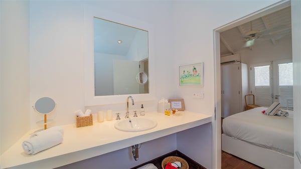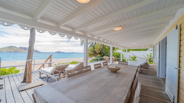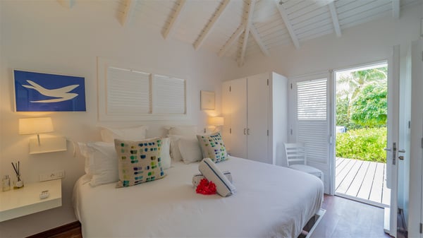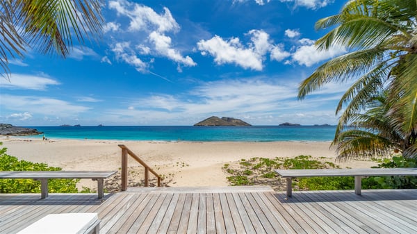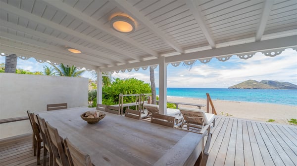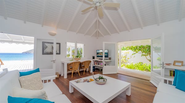 The villa rental Fay is a charming Caribbean property located on the west side of Flamands Beach. Bright and comfortable, this beachfront home offers beautiful spaces facing breathtaking views over the white sand and the deep-blue ocean. Surrounded by a beautiful terrace and featuring two bedrooms with en suite bathrooms, villa Fay is the ideal place for an unforgettable four-people getaway in St-Barths. A single-story house built on Flamands Beach, the vacation villa Fay is the ideal beach house in St-Barths for an unforgettable stay in the Caribbean. Widely open onto the view over the turquoise waters of St-Barths, Fay welcomes guests in its comfy lounge under a whitewashed vaulted ceiling, furnished with a sofa and a bench covered with blue cushions, close to the desk area; nearby, the fully-equipped kitchen opens onto the terrace with the amazing ocean view. In a peaceful and most relaxing atmosphere, you'll enjoy sipping fresh drinks and breathing in the trade winds that gently blow through the openings onto the terraces all around the villa. At the front, the terrace opens directly onto Flamands Beach, a few steps from the deck. You’ll love walking on the white sand and breathing in the mild air whenever you wish. Under the covered area, the al fresco dining room seats up to ten guests in a lovely Caribbean decor with white mantling. Loungers are also available on the deck planted with tall palm trees and fine leaves. A second table for four guests is located at the front of the terrace, perfect for a morning coffee or an evening cocktail. On the side, there is a crocheted hammock for pleasant and restful moments to be enjoyed in a very private atmosphere. Villa Fay consists of two bedrooms with king-size beds that can be converted into twin beds and en-suite bathrooms. Located on either side of the villa, they open onto the rear terrace, which is furnished with sun loungers in a gentle tropical scenery. The striking white decor and cozy furnishings, with desk areas and closets, make these sleeping areas true cocoons of well-being, the right place to relax after days exploring the island's treasures. Facing Flamands Beach, Villa Fay is the ideal place to enjoy a four-people dream stay in the tropical beauty, in a very private atmosphere.