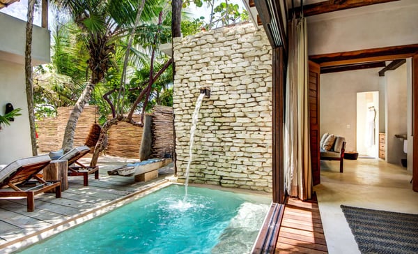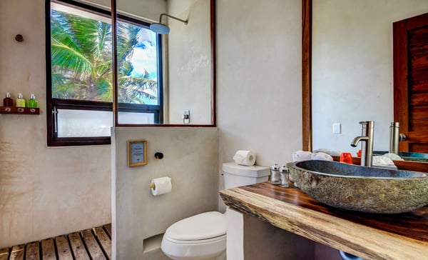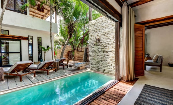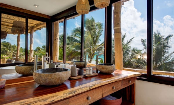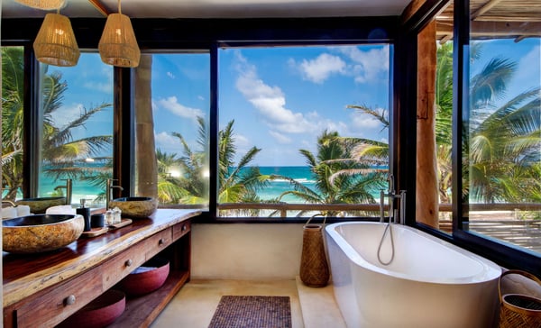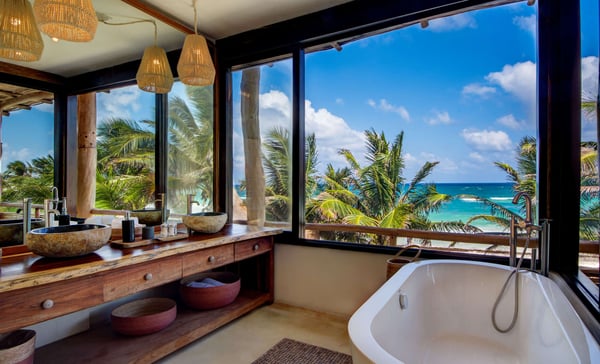 Designed for leisurely dinners and afternoons well spent with friends and family, Casa Chukum is the star of three houses located in one of the trendiest spots in Tulum’s hotel zone. Every corner in Casa Chukum will make you feel at home. Custom-made furniture gives the villa the authentic charm of a stylish beachside hut with finishings in stone and wood. It comprises four spacious suites with private bathrooms, spacious interior common areas, a fully equipped kitchen and dining room, and a beachfront terrace lounge. The master bedroom also has an ocean-facing balcony. Adjacent to the pool, you will find the guest house, where there is one extra double room from where you can jump into the water. Casa Chukum is the largest of the three homes that make up Aldea Canzul’s beachfront property. The estate sits right in the heart of Tulum’s hotel zone, close to some of the most famous restaurants and nightclubs. Its location makes it ideal for experiencing the town at its best. Meanwhile, it offers the privacy one needs to relax, be it on the beach loungers, the couches of the rooftop terrace, or the bathtub with those epic sea views.