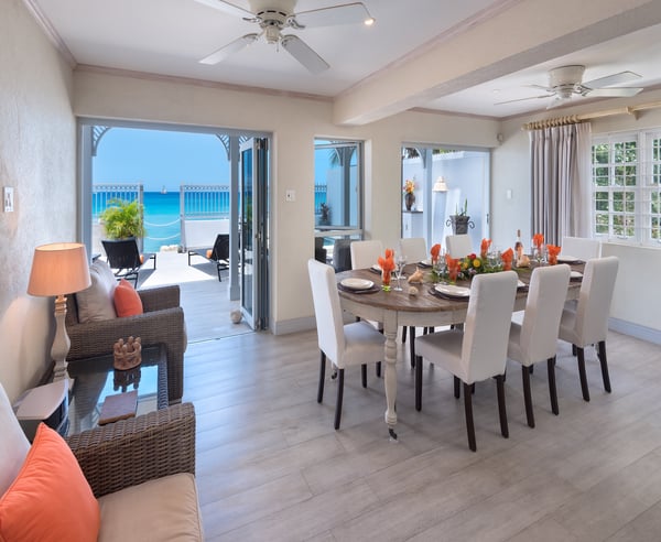 Nearby construction may result in noise disturbances. For further details on how this might affect your stay, please reach out to a Rental Escapes villa specialist. The beach experiences seasonal fluctuations in its accessibility. Set back from the coast road this two storey villa is ideal for families or groups of up to eight looking for privacy but also coastal convenience. The villa has been newly renovated with an open plan modern design featuring high ceilings, bright and airy bedrooms, a spacious covered deck and stunning views of the turquoise Caribbean Sea. The entrance way leads straight through to the airy kitchen and dining rooms and the picturesque views of the bay beyond. The kitchen is modern with a pantry off to the side and open plan dining with a formal eight seater table as well as a casual breakfast bar and Caribbean chic décor with ocean hues. The partially covered sun deck is enclosed for privacy but has access via stairs down to the sandy beach below. Guests can look forward to spending the day sunning on the loungers on the deck, snorkeling with the visiting sea turtles and sipping cocktails from the plunge pool at sunset before heading out to one of the many popular restaurants and hotspots that can be found on the famous Platinum Coast of Barbados. There are two bedrooms on the main floor, a master room with casual seating area, king bed and an en-suite with tub bath and rain shower and a second bedroom with twin beds, built in closets and an en-suite bathroom. The second floor is definitely the place to relax after a day in the sunshine. Open and airy it features a spacious living area with oversize comfy sofas and big screen entertainment centre as well as a more causal seating and dining area that opens out to a spacious balcony, cool ocean breezes and gorgeous panoramic views of the quiet bay. On this floor you will find another master bedroom set to the rear of the house featuring a king bed, walk in closet, en-suite bathroom with tub bath and rain shower as well as a second en-suite guest room with king bed. There is also a powder room in the corridor for visitors. Westshore is fabulously positioned just five minutes drive from the picturesque town of Speightstown which is home to many lovely beachfront restaurants and cafes. The bustling Holetown is ten minutes drive away and there you will find trendy boutiques, casual dining and popular nightclubs. For the golf enthusiasts, Sandy Lane Golf Club and Westmoreland are only moments away.