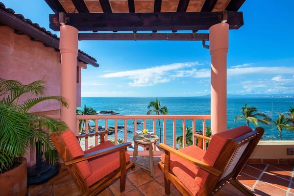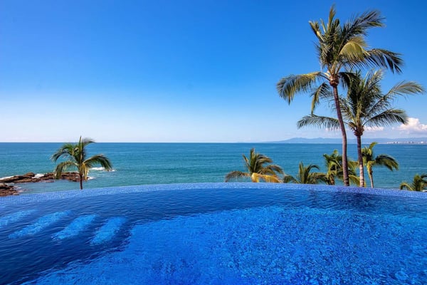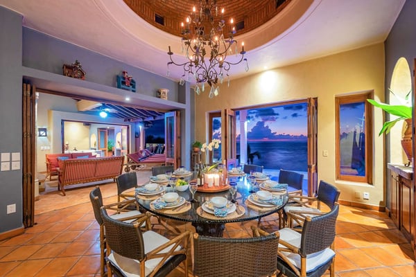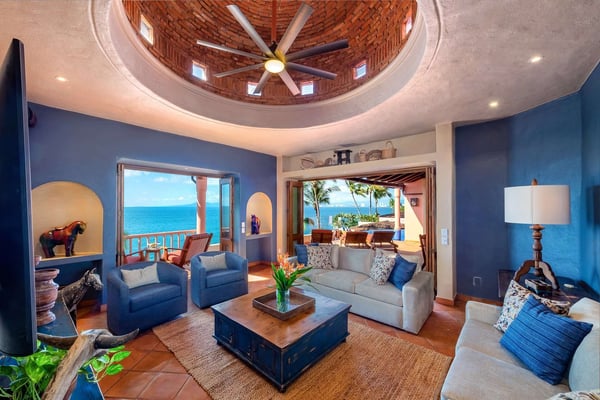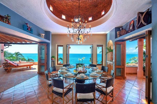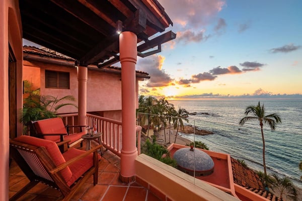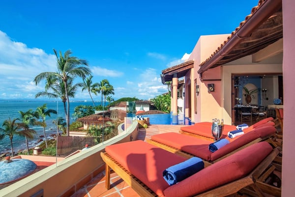Discover Beachfront living at its best, the experience is relaxed at Villa Marea Alta a 5 bedroom private beachfront villa perfectly located just a couple miles from Downtown Puerto Vallarta, the iconic Romantic Zone and Los Muertos Beach. Walk along the beach during the day time to the lively energy of Los Muertos Beach, or just chill at the beach in front of the villa or poolside. Enter the villa from a cobblestone street through a hand-carved wooden door, into a walled residential, hear the splash of fountains in courtyards. The charming staff will greet you and hand you a frosty margarita served with gracious Mexican hospitality. Villa Marea Alta captures the color and romance of Mexico in warm blend of traditional Mexican Architecture and Puerto Vallarta Coastal design with 6000 sq ft of indoor-outdoor living, breathtaking views across the bay and a full staff to make an unforgettable experience.