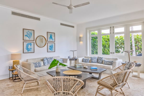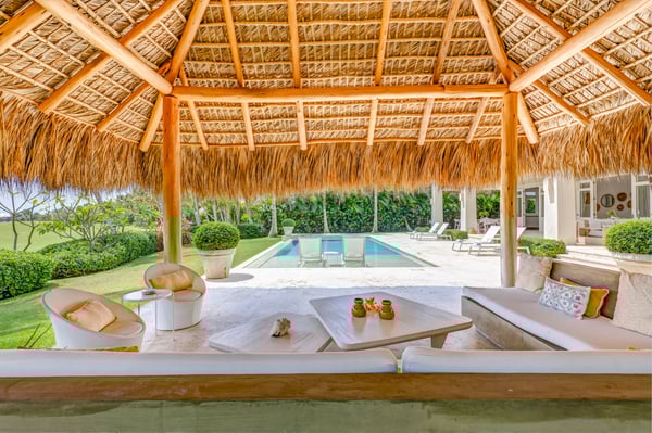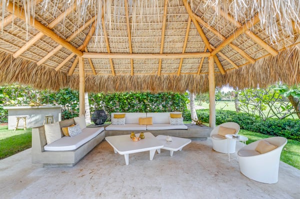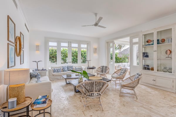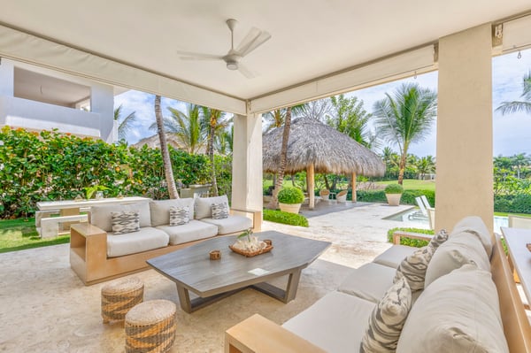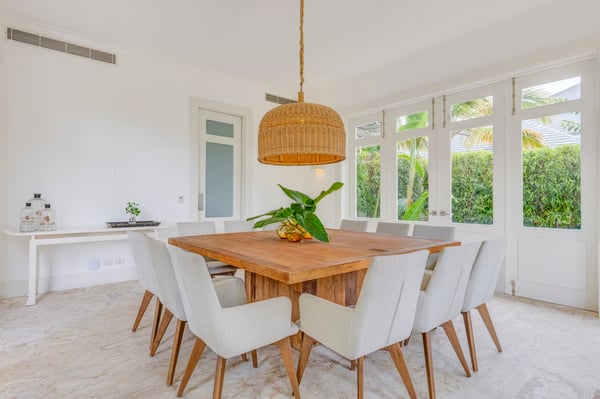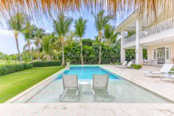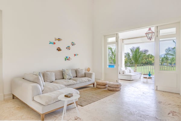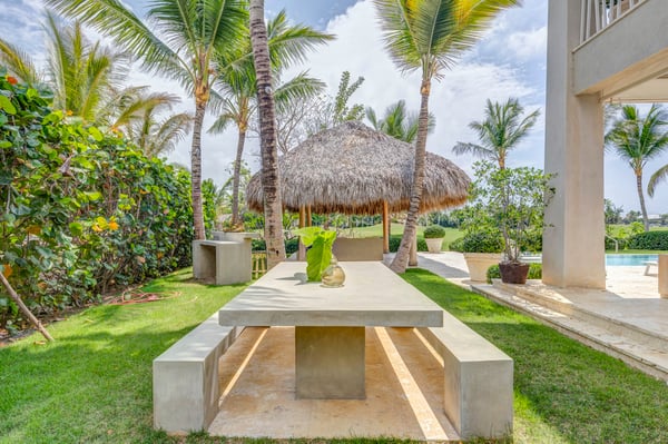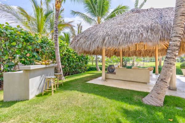 Guests staying within Puntacana Resort & Club will have access to all resort amenities and facilities. Resort amenities and facilities include two golf courses ($), two beach clubs ($), Six Senses Spa ($), restaurants ($), bars ($), and tennis centre ($). Entering the main gate, a water mirror reflecting the candid Caribbean sun surrounded by coralina tiles is a unique attraction before stepping into the high-ceilinged outdoor foyer with a massive lantern-like chandelier and balcony, a staircase to the second floor, and access to the garden. The modern fully equipped kitchen governed by a white with gray stripes offers all you need to prepare a traditional Dominican meal or enjoy breakfast on the island while talking about your beach day. Moving to the living area a rustic chandelier welcomes you to rest on any of it cozy mat chairs or the sofa while gentle breezes sneak in. The dining area offers seats for 12 guests on its large hardwood squared table.