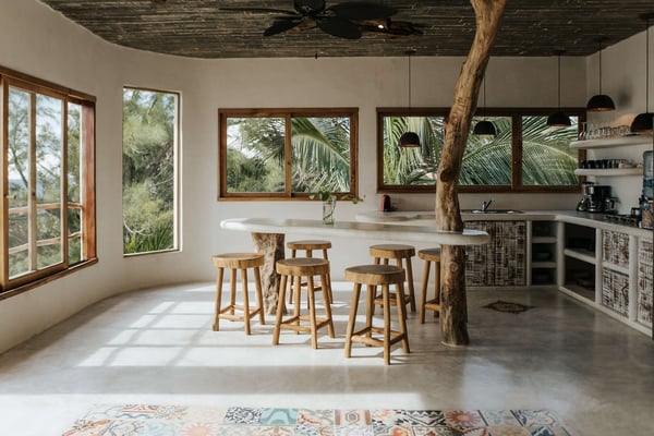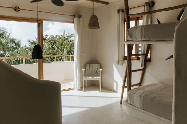 Zorba Beach Homes is a stunning collection of boutique rental homes located on a gorgeous property on Tulum Beach at KM9. Enjoy unrestricted beach access, pool access, yoga shala, rooftop patio with incredible views, air conditioning and the comforts of a full-service home while exploring the vibrant culture of Tulum. Enjoy stellar views of Tulum beach from this incredible penthouse perch! Bird's eye view of the white sand and turquoise sea from this exclusive two-bedroom home. Let the sea breezes flow through the glass doors into your open living area or sit outside on the patio to enjoy the incredible vista. Carefully designed to connect with the breathtaking beauty of Tulum from each room. Natural elements and artistic touches throughout the house reflect the lovely laid back vibe and feel of Tulum. Prepare meals in the kitchen and enjoy the sounds of the sea. The layout provides a home suitable for two couples or a family. The master bedroom has a king bed and en suite bathroom. The second bedroom has a queen bed and two singles with an en suite bathroom. Sleeps four to six guests. Both bedrooms overlook the pool.
