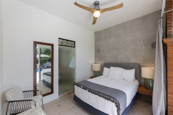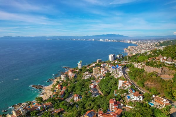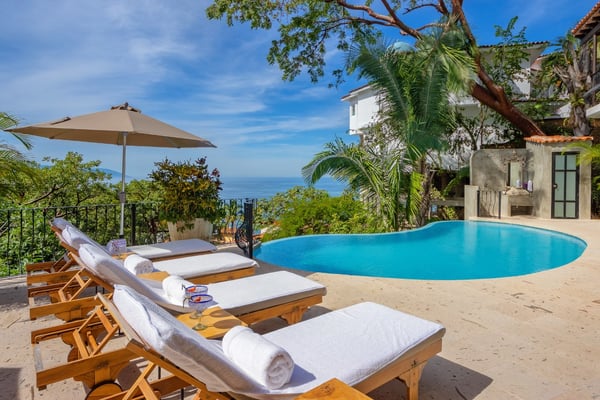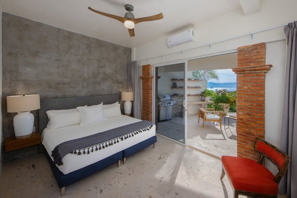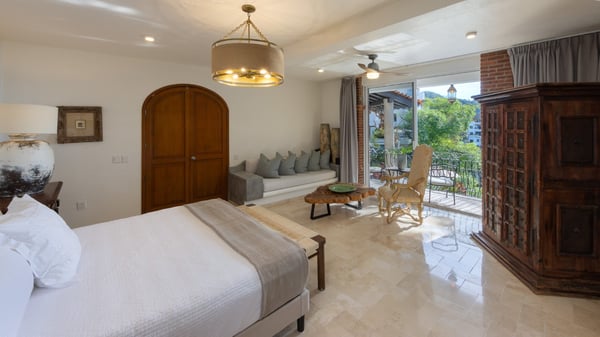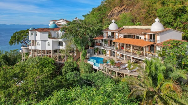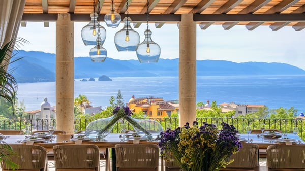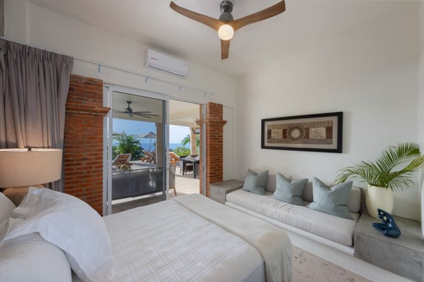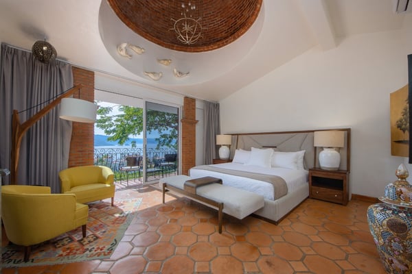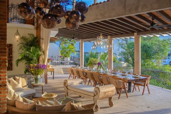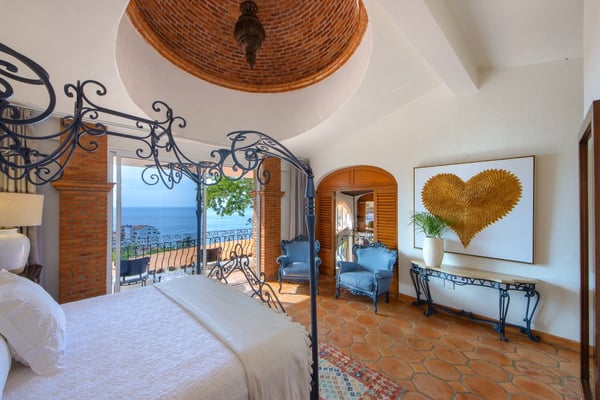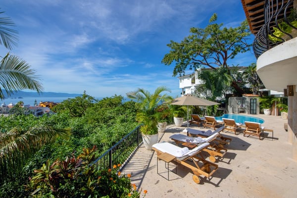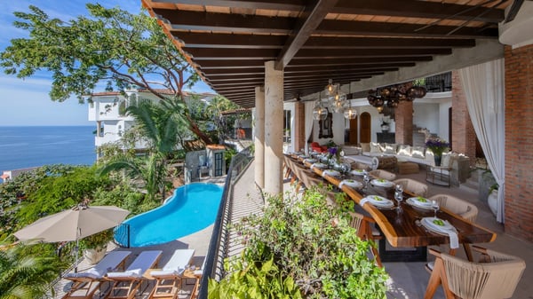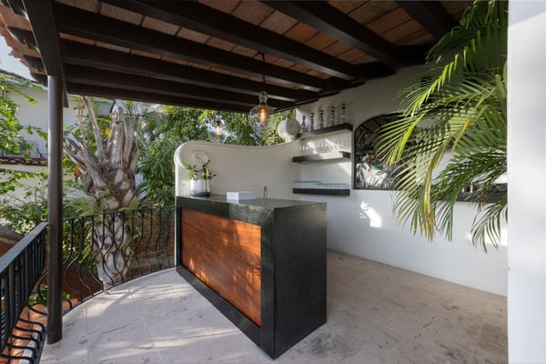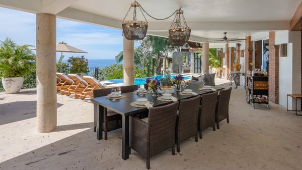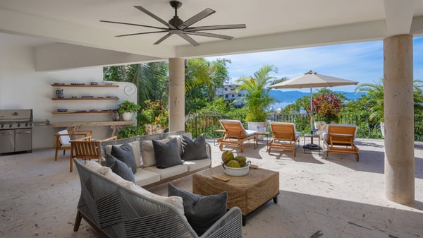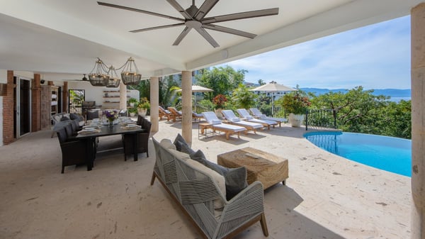 Discover Villa Alexa located hillside in the coveted enclave of Conchas Chinas with breathtaking views of Banderas Bay, the south coast and Los Arcos islands, just a short 5-minute drive to the Romantic zone and popular Los Muertos beach. The villa is the essence of gracious elegance and comfort, as Coco Channel once said “Luxury must be comfortable, otherwise it is not Luxury”. The Villa is designed for indoor/outdoor living at its best to appreciate Puerto Vallarta’s sublime climate. The villa reflects the perfect balance of traditional Mexican architectural details juxtaposed with a minimal midcentury modern style. Enter to the main level and middle floor with expansive living /dining space perfectly located to appreciate the ocean views, with a vaulted ceiling.