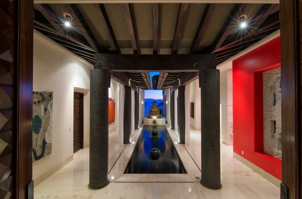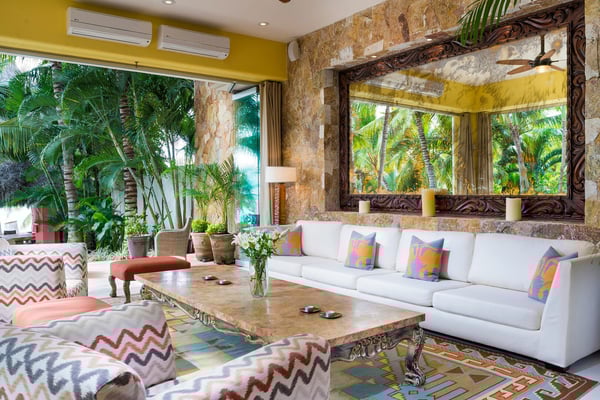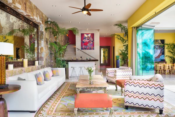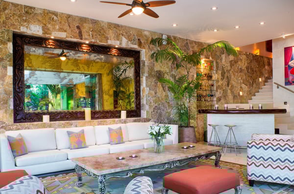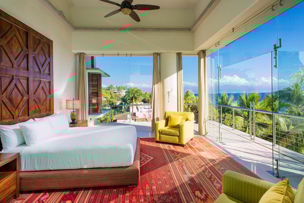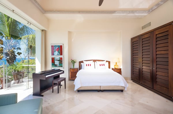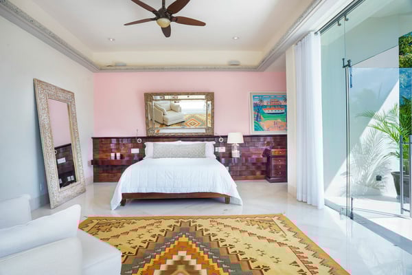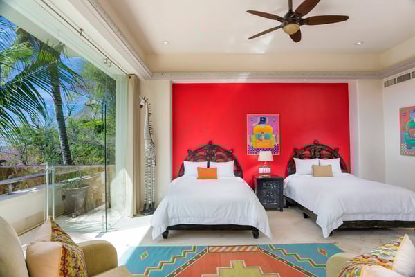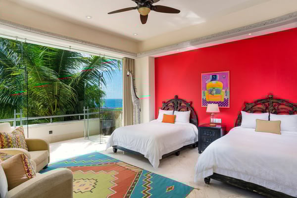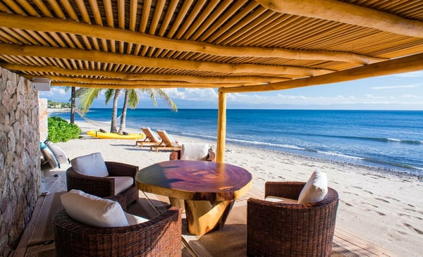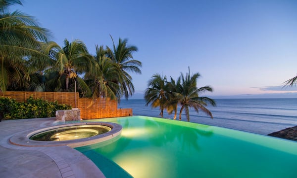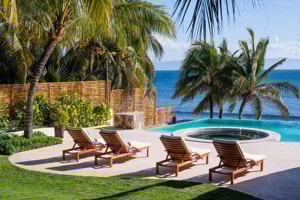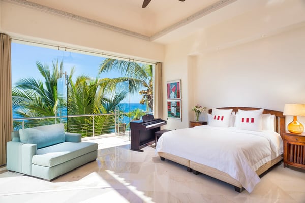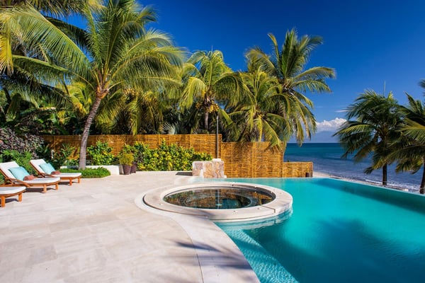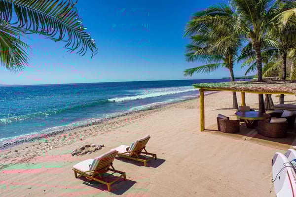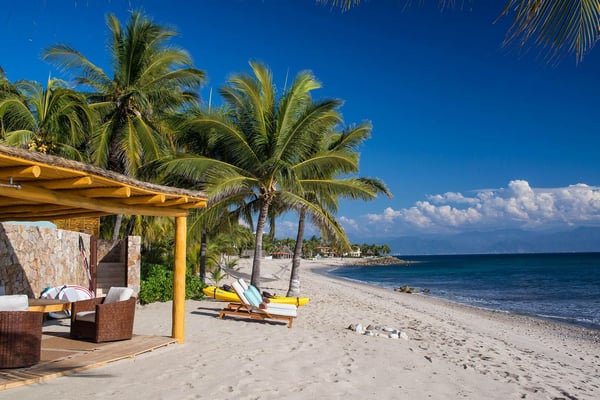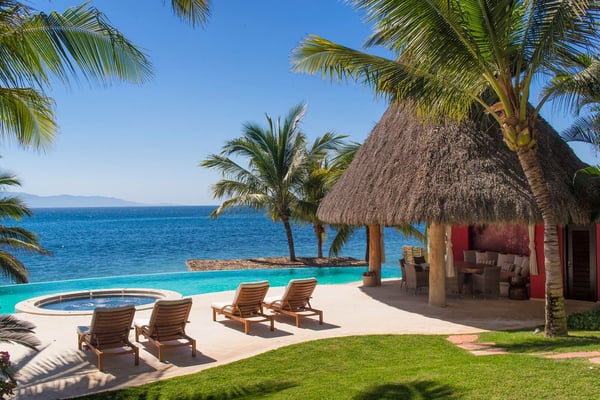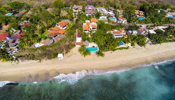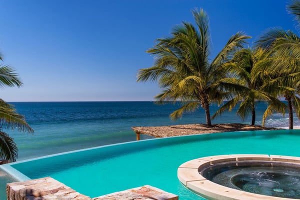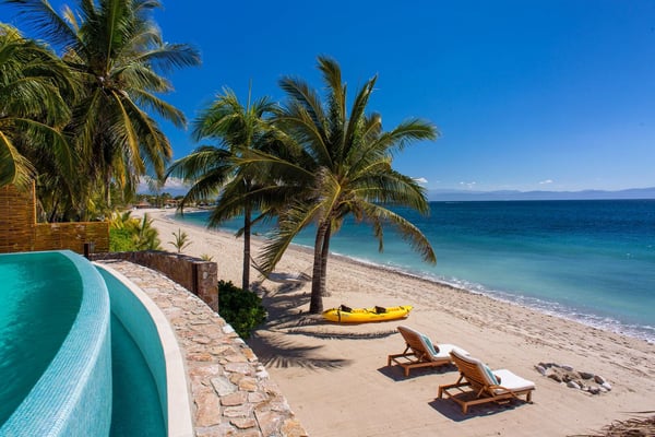 Casa Blanca is a beautiful beachfront home with expansive rooms, vibrant Mexican colors, and stunning ocean views. It features a shaded beachfront terrace with a hanging daybed, perfect for all-day relaxation. Located in the private, secure community of Punta Del Burro, it's just a 7-minute drive from Punta de Mita's restaurants. This three-story villa has an elevator, spacious bedrooms with ocean-view terraces, an entertainment floor with an infinity pool, a media room, gym, and kayaks.