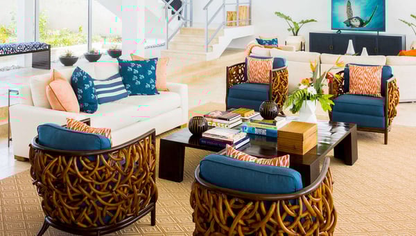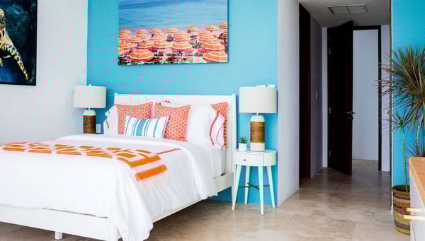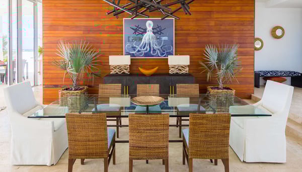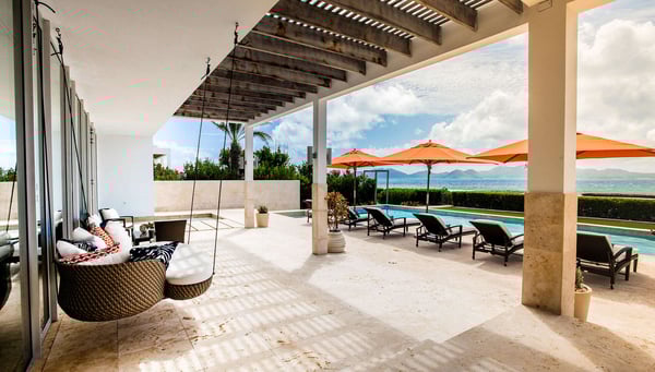 This luxury villa in Anguilla promises to be one of the destinations you'll want to visit time and again. Designed to highlight its oceanfront location, it offers an indoor and outdoor living experience like no other. Whether you want to host your dream wedding, family or friend reunions, or even a quiet island retreat, Champagne Shores provides the perfect setting. Approximately six years since its last renovation, Champagne Shores is a jewel in the Anguilla landscape, with interiors curated by renowned New York designer Alexis Parent. The tropical elegance reflected through luxurious textures and colors makes the villa's design emphasize and harmonize with its picturesque surroundings. Large floor-to-ceiling windows frame spectacular views of Anguilla's rugged coastline and open onto an inviting courtyard; relaxation is taken to the next level thanks to cool Caribbean breezes. The private stone terrace with a sparkling pool, accompanied by a series of sun loungers and a relaxing Jacuzzi, is strategically positioned so that guests can enjoy a maximized view of the ocean and the distant silhouette of the island of St. Martin. If outdoor dining is a plan in mind, the villa offers a barbecue area ideal for cooking local seafood, accompanied by a shaded alfresco dining space. It is certainly an ideal space to enjoy meals amidst the natural beauty of the island. Champagne Shores never fails to dazzle with its luxurious indoor amenities. In addition to a state-of-the-art fitness room, this venue features a stocked wine cellar for your pleasure and a modern sound system complemented by high-speed Wi-Fi to keep you entertained and connected. This continuous flow that enhances the overall ambiance is essential for both the interior and exterior design to blend seamlessly. Similar to Beaches Edge Anguilla, the meticulous attention to detail ensures an unparalleled experience for guests. Two distinct living areas and a dining table that comfortably accommodates eight people create an open-concept living room that will draw much of the guests' attention to this Lockrum villa. Yet, what truly becomes the attraction of the living room is the panoramic ocean views that fill the space with natural light and beauty. The modern kitchen, with its turquoise backsplash and sleek white cabinetry, reflects the colors of the ocean.