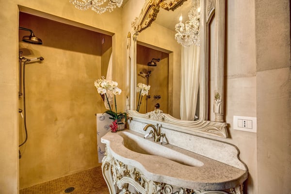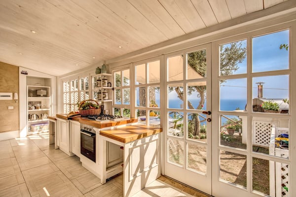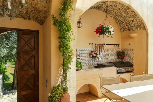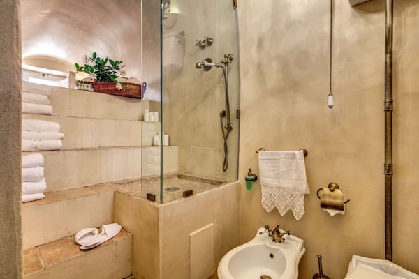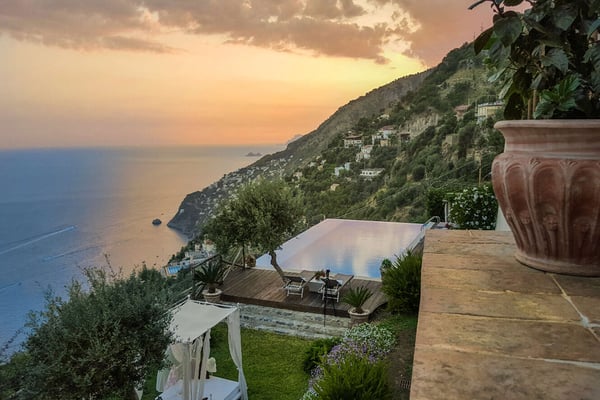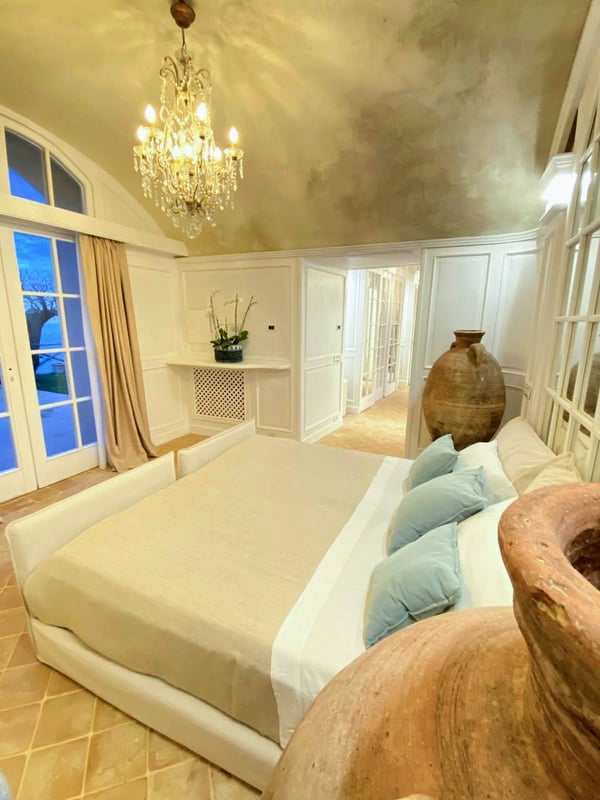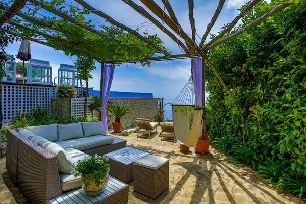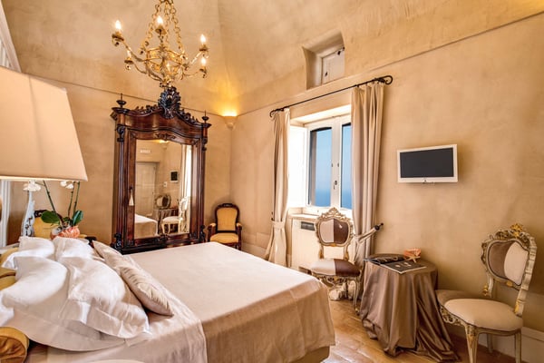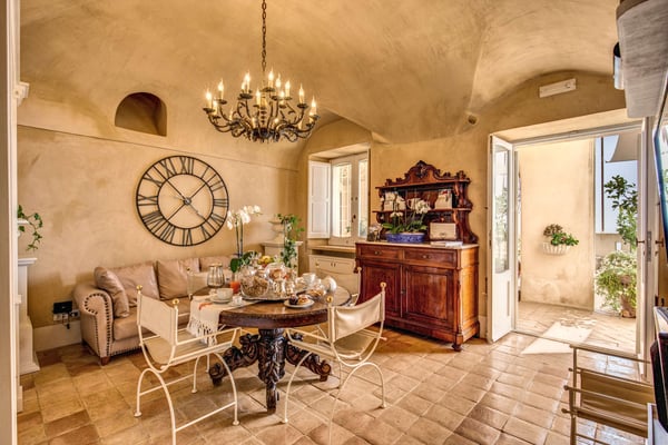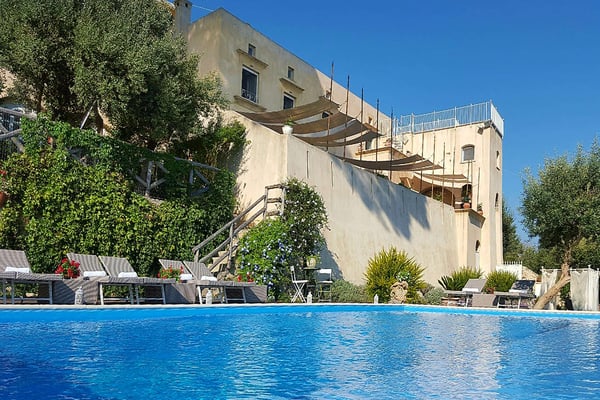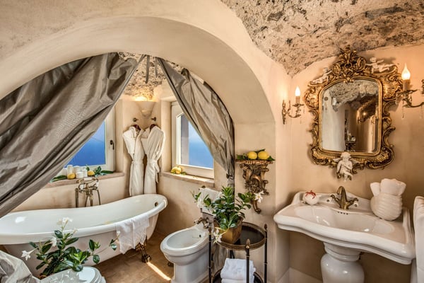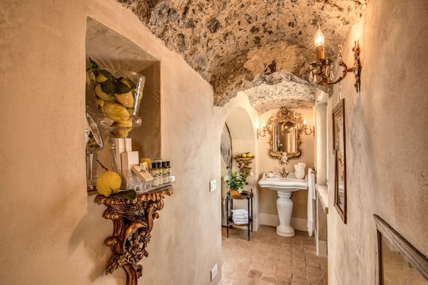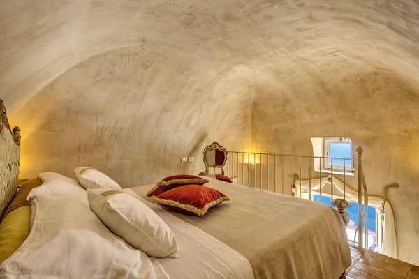 Up on a winding road, and just a 20-minute drive from Amalfi and a 15-minute drive from Conca dei Marini, Villa Nume is a beautiful fortified construction dating back to 1500, with original thick walls and a watch tower. Masculine and austere in its exterior look, Nume boasts recently renovated interiors styled in a very romantic and sophisticated way. Perched on an outcrop of a mountain – the villa is reached by several flights of steps down – it overlooks the winding coastline and the stunning turquoise open sea. If you are looking for a quiet private retreat with great service, this idyll will not disappoint you. It is the perfect villa for guests seeking romantic seclusion and the excitement of the Amalfi Coast.